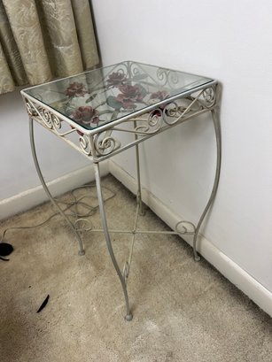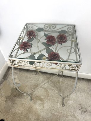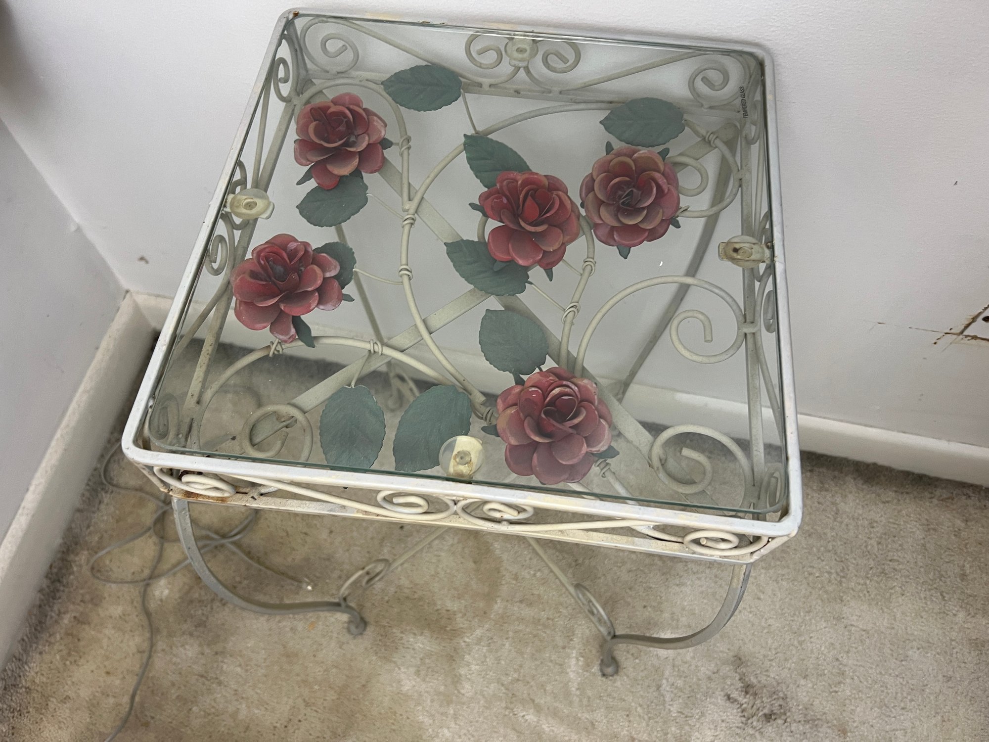 Vintage toleware accent table in a white paint finish with red-pink painted flowers beneath a glass top.