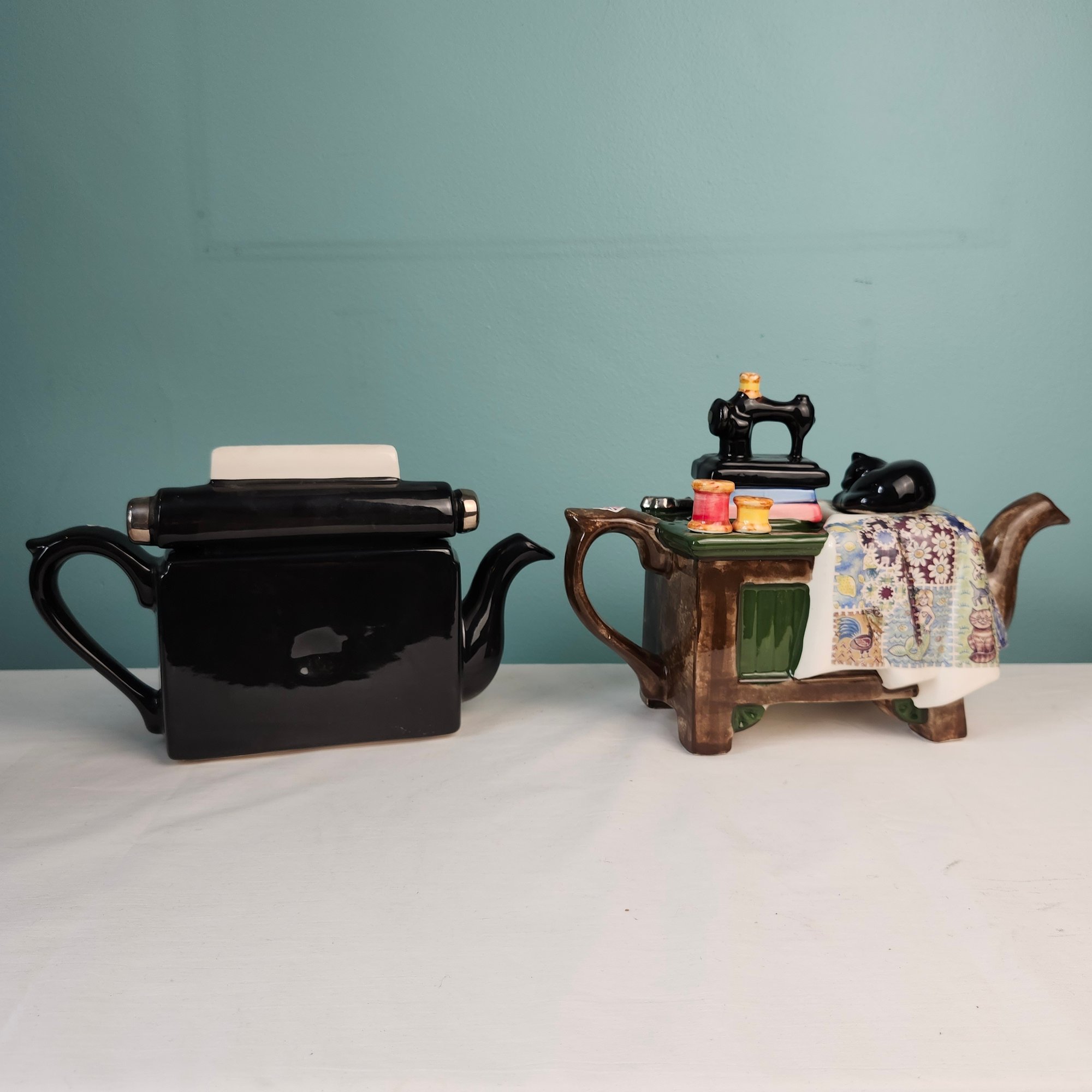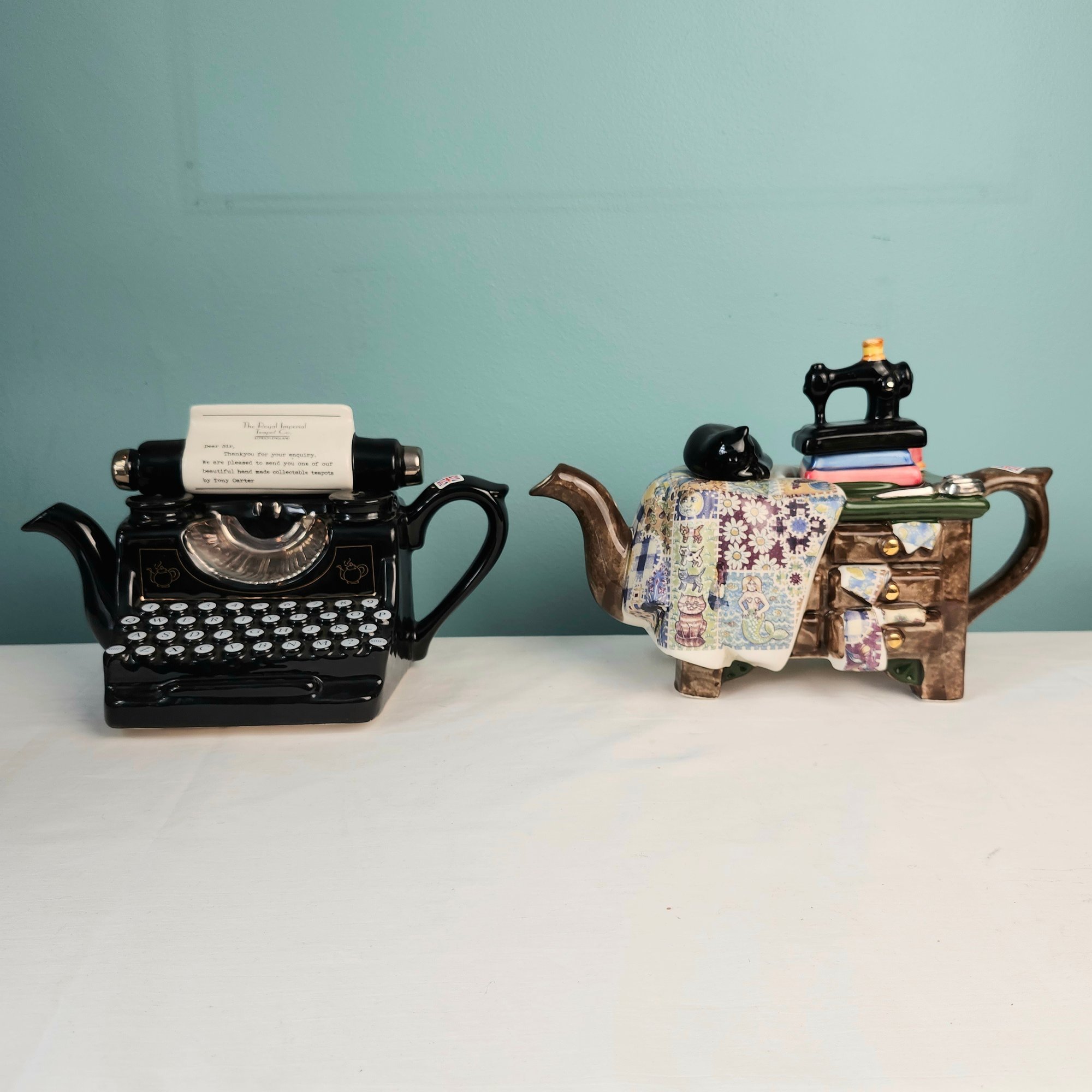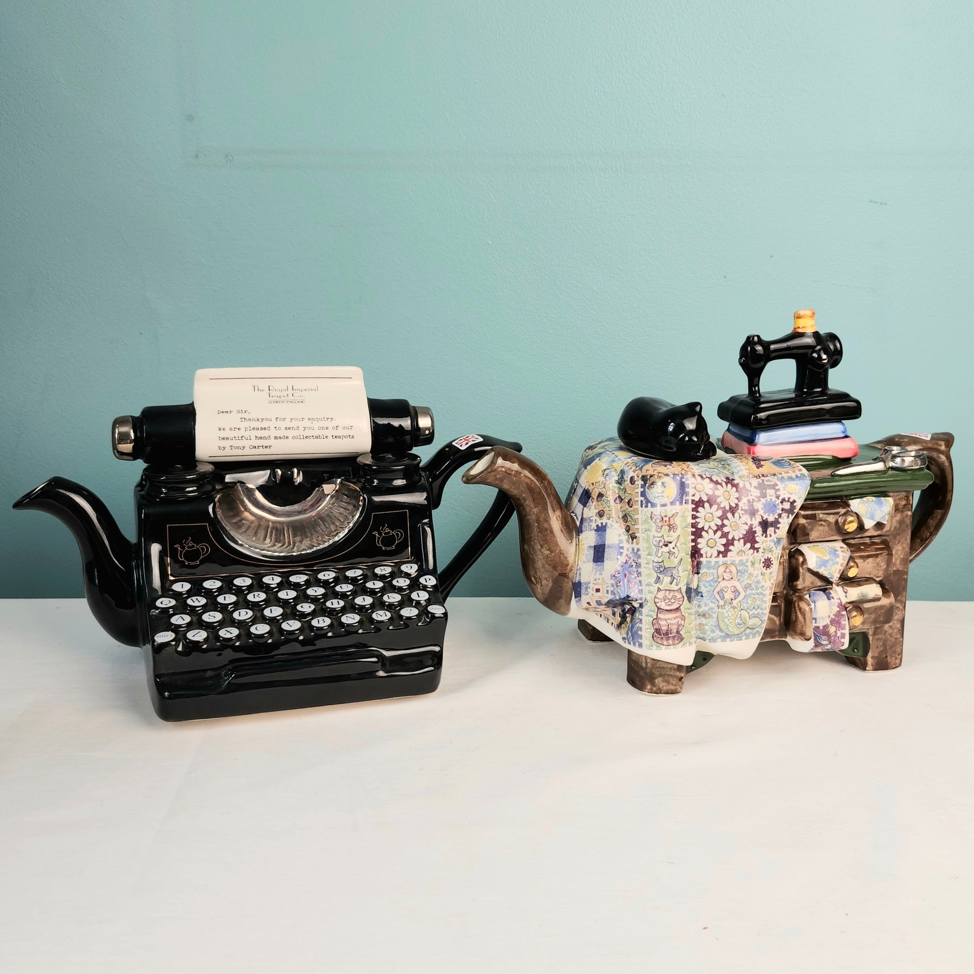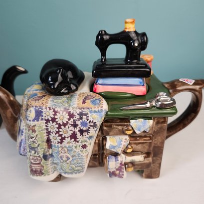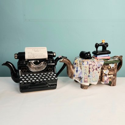 Fun Figural Teapots, made in England, by Tony Carter. Hand painted. One is a cluttered sewing table, one is a typewriter. Measurements are of the sewing machine teapot.