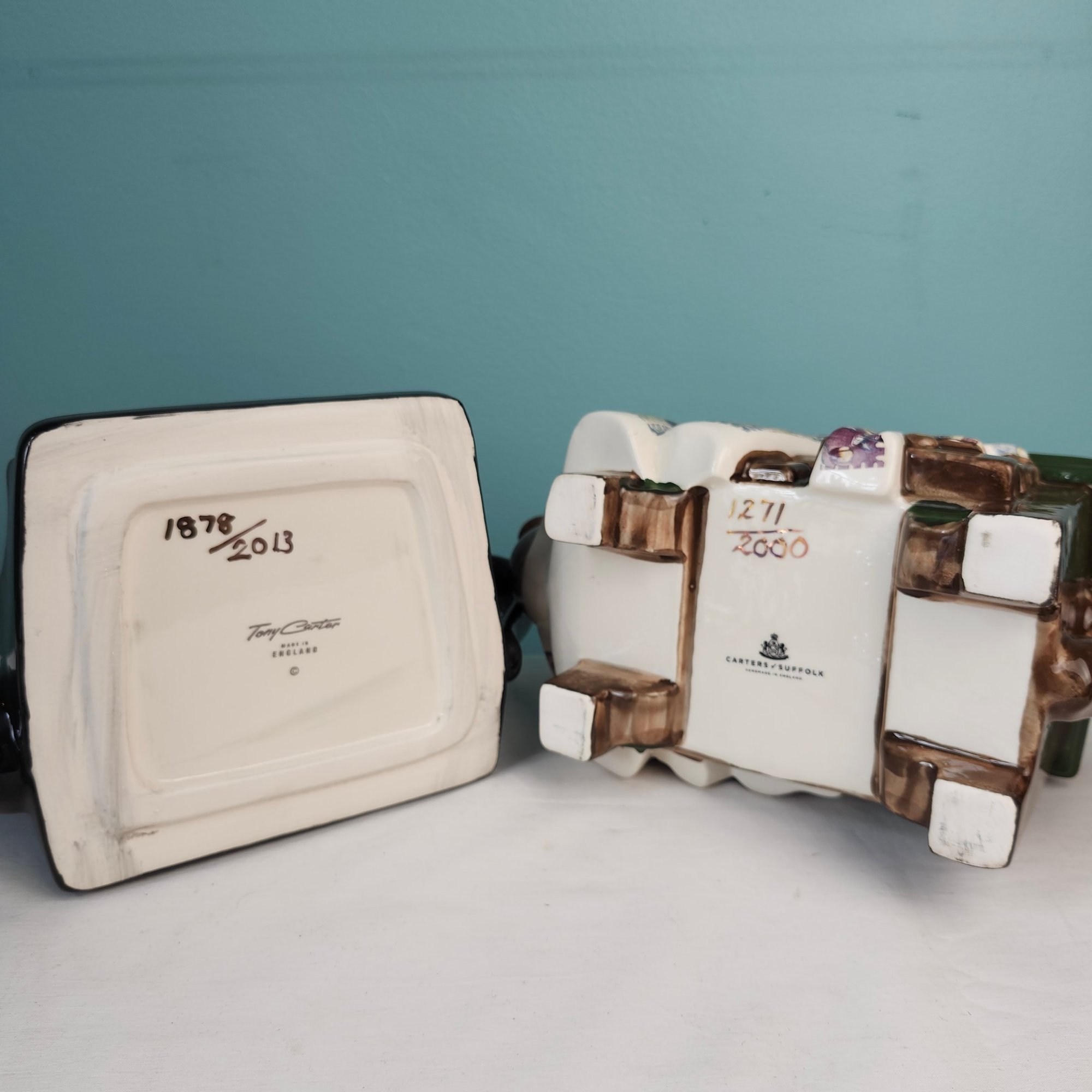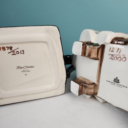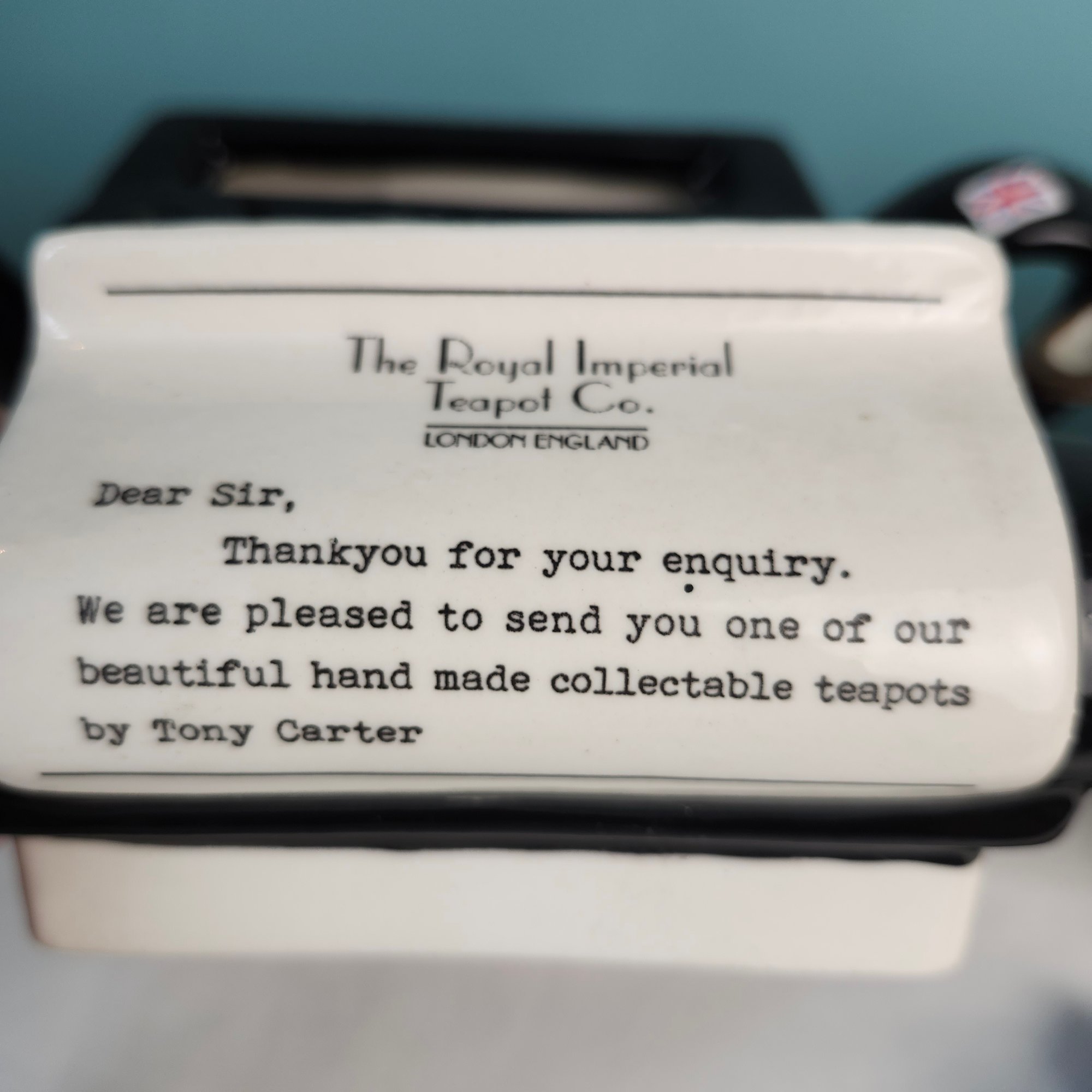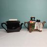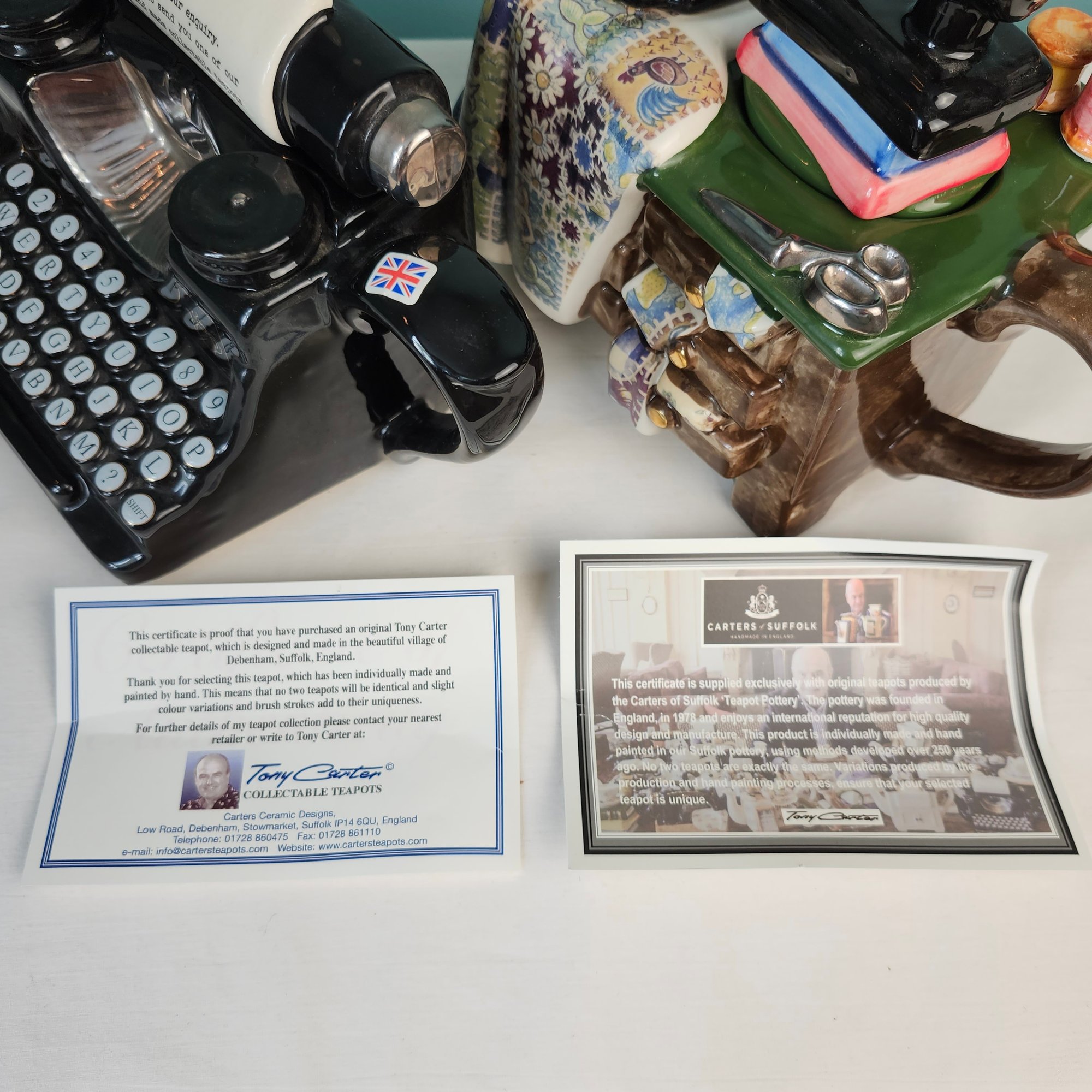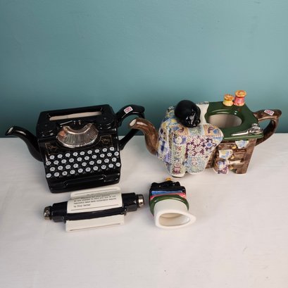 Fun Figural Teapots, made in England, by Tony Carter. Hand painted. One is a cluttered sewing table, one is a typewriter. Measurements are of the sewing machine teapot.