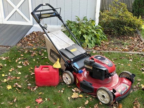 A TORO "Recycler" 22 inch Lawn mower that is in good working condition. Note a hole in the bag. It has a Briggs and Stratton motor.