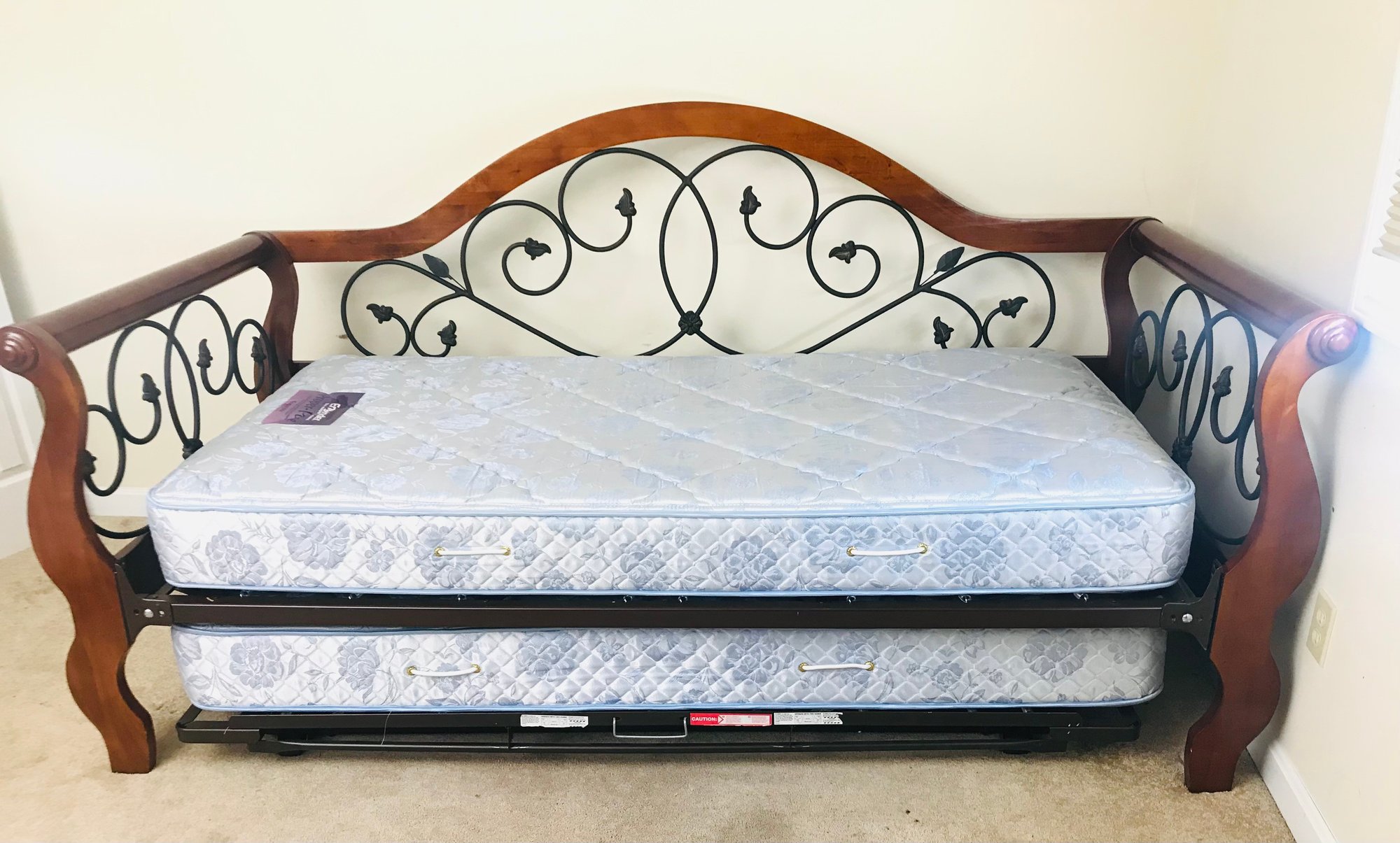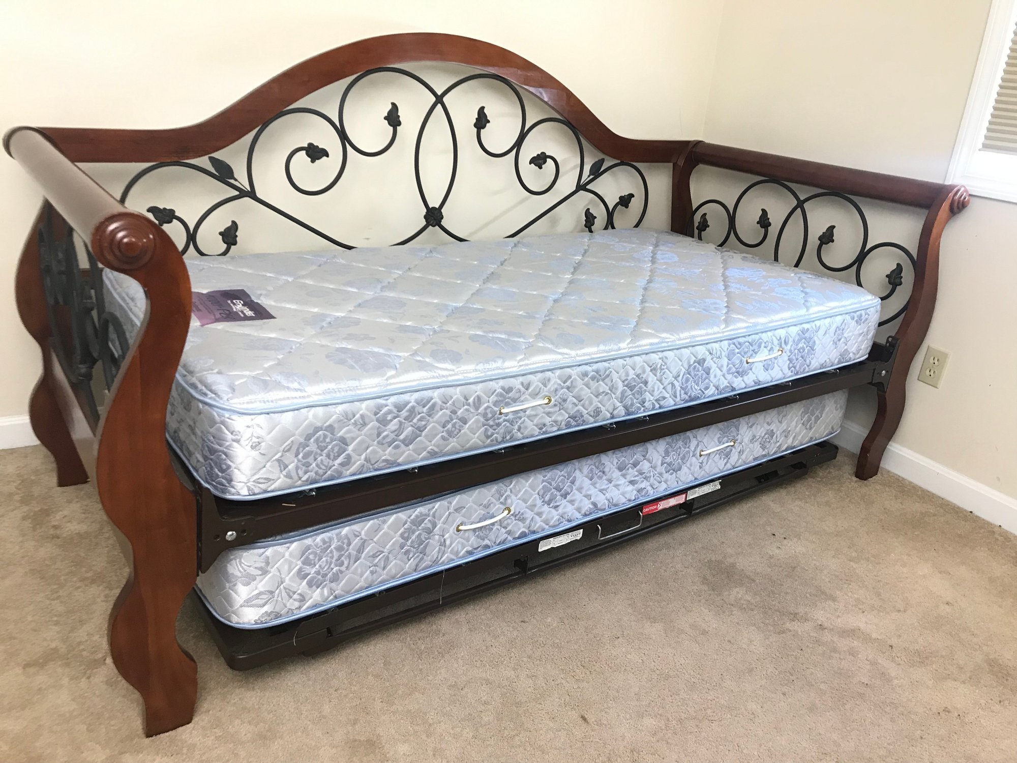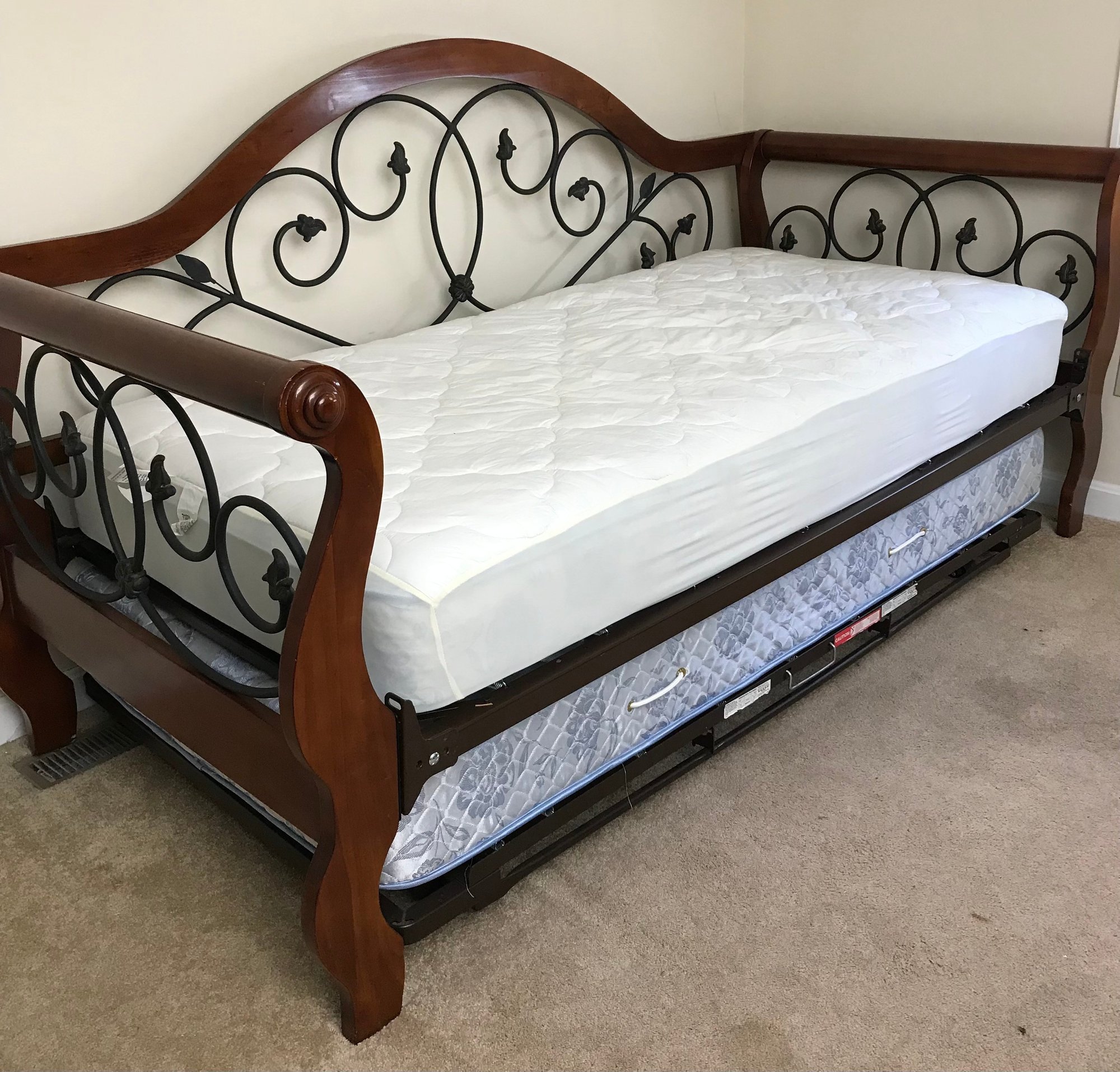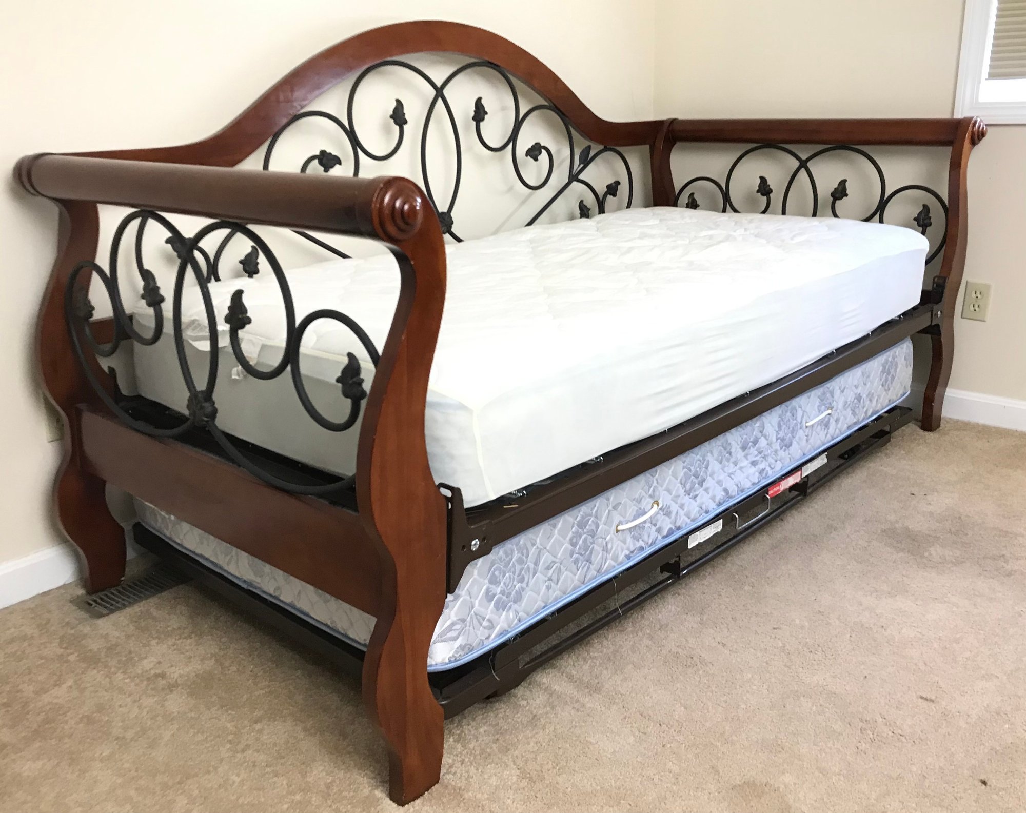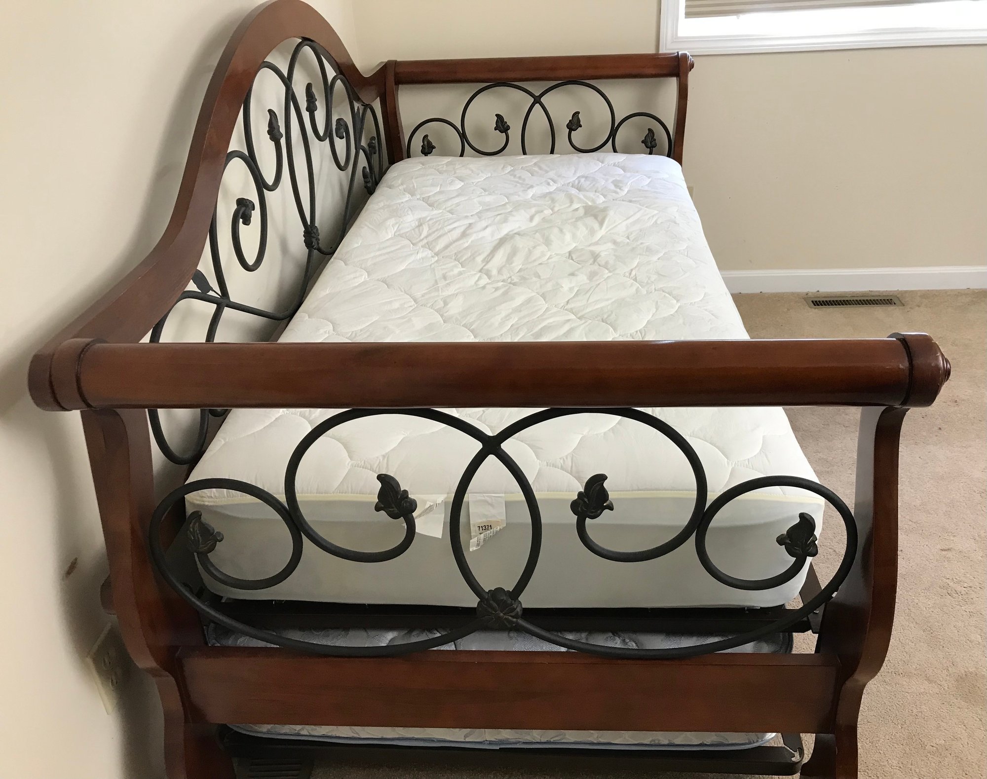 Features: Elegant scrolled wood arms and intricate ironwork detailing. Trundle can be stored underneath or raised to bed height.