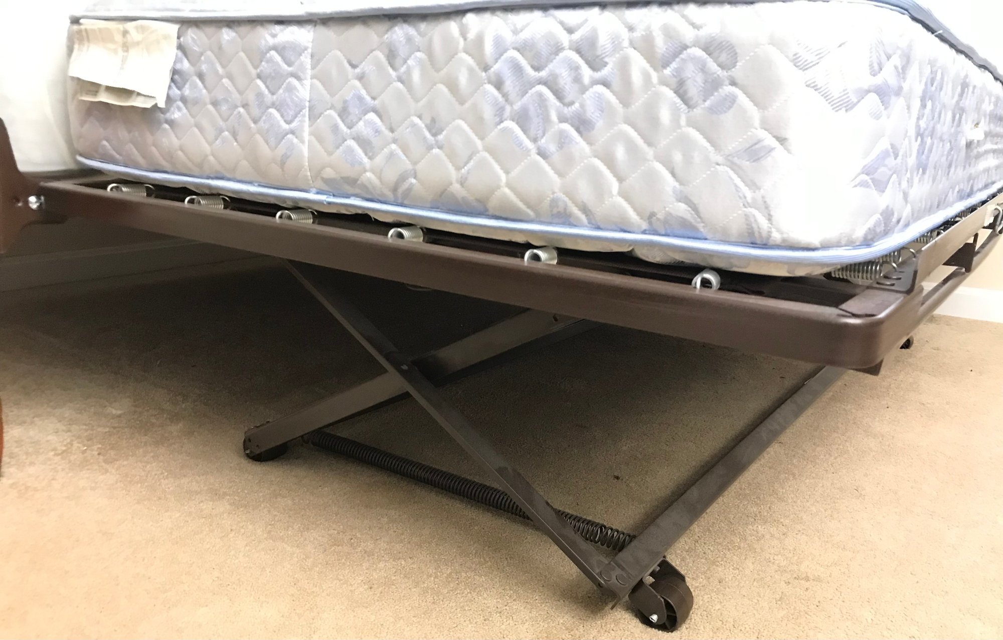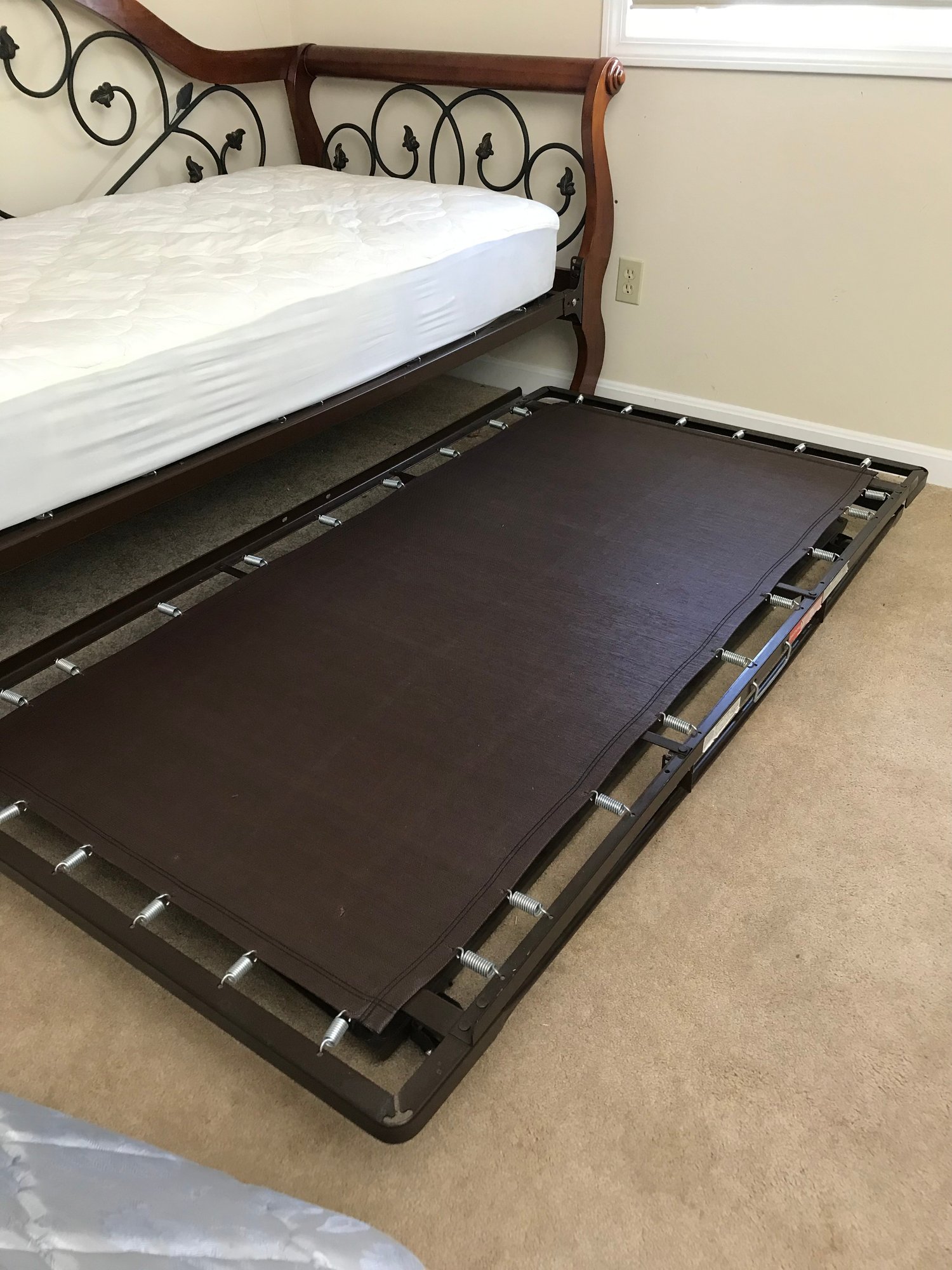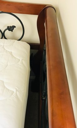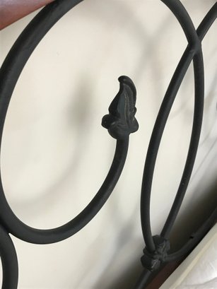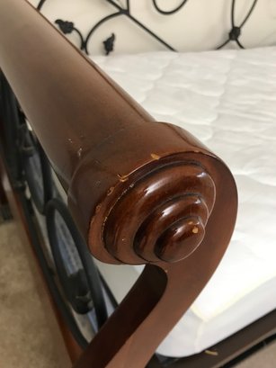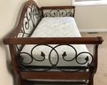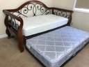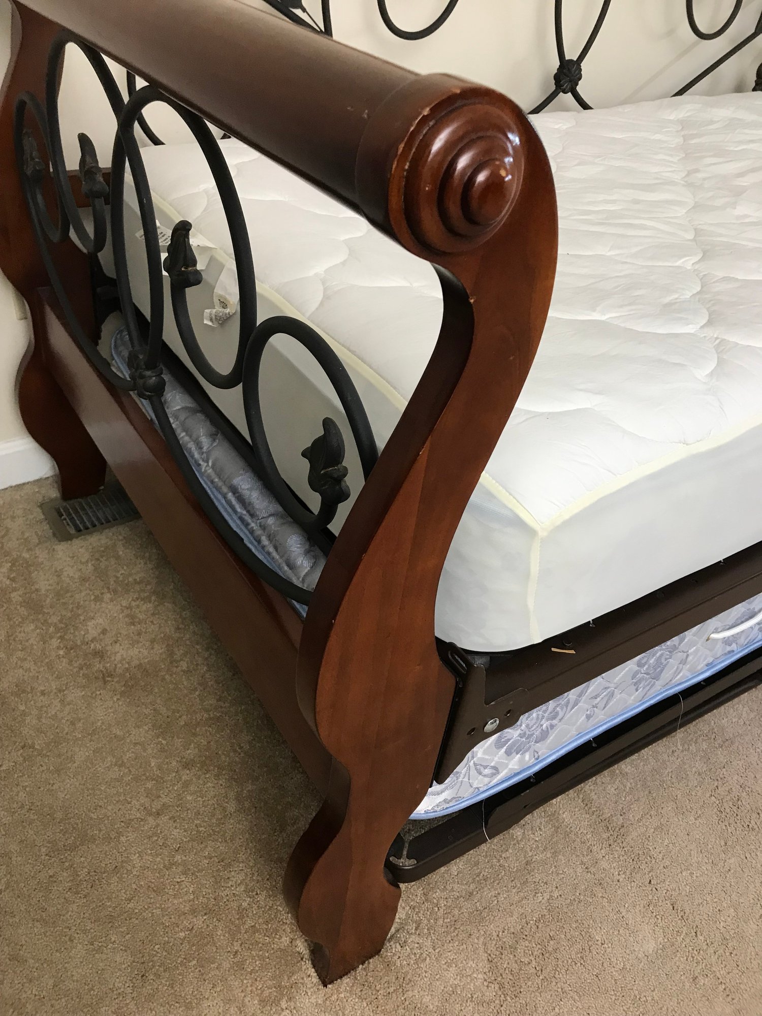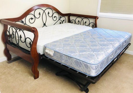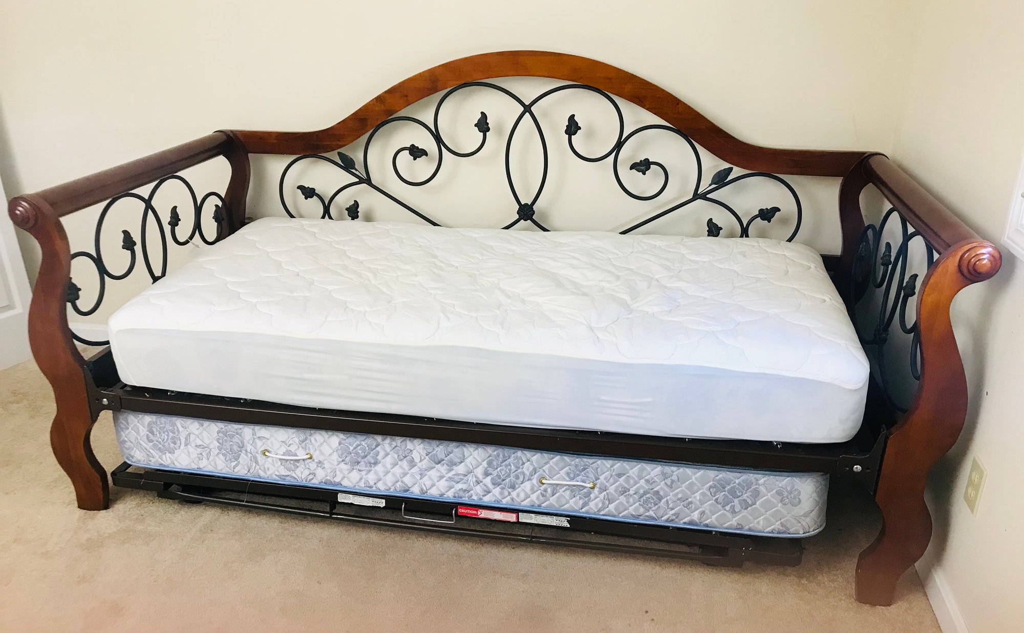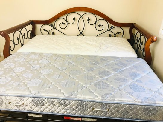 Features: Elegant scrolled wood arms and intricate ironwork detailing. Trundle can be stored underneath or raised to bed height.