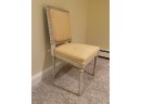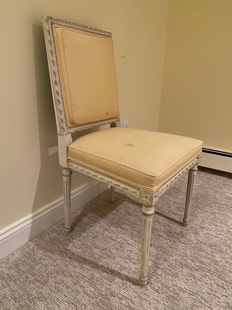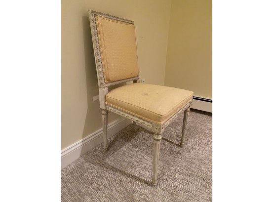 French Provincial style with Shabby chic whitewashed wood. Upholstered in butter yellow Swiss dot fabric. Perfect addition to a dining table or as an occasional chair.