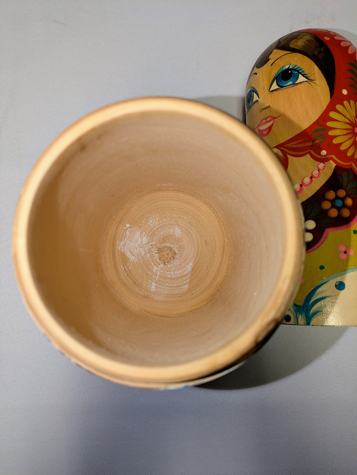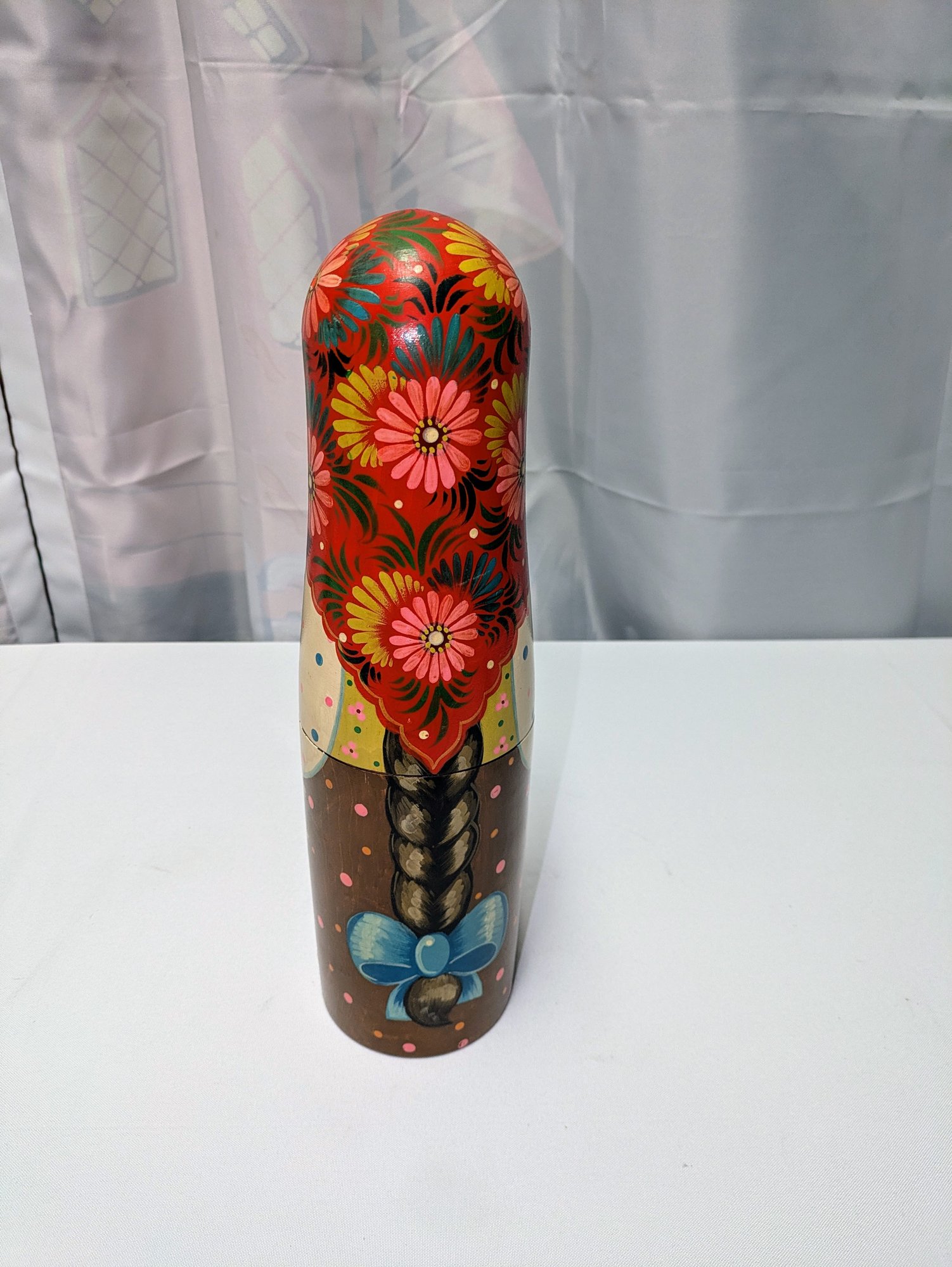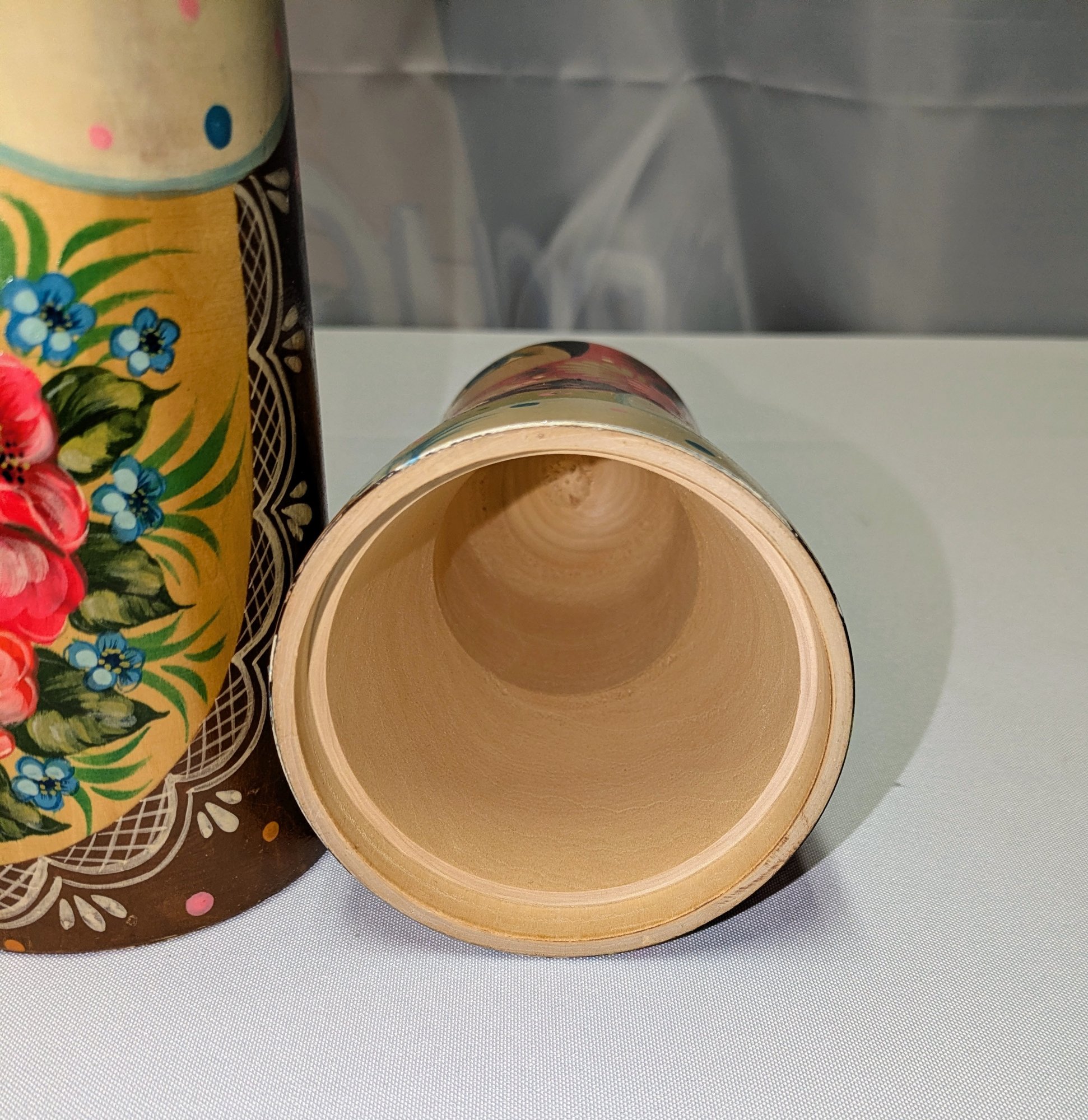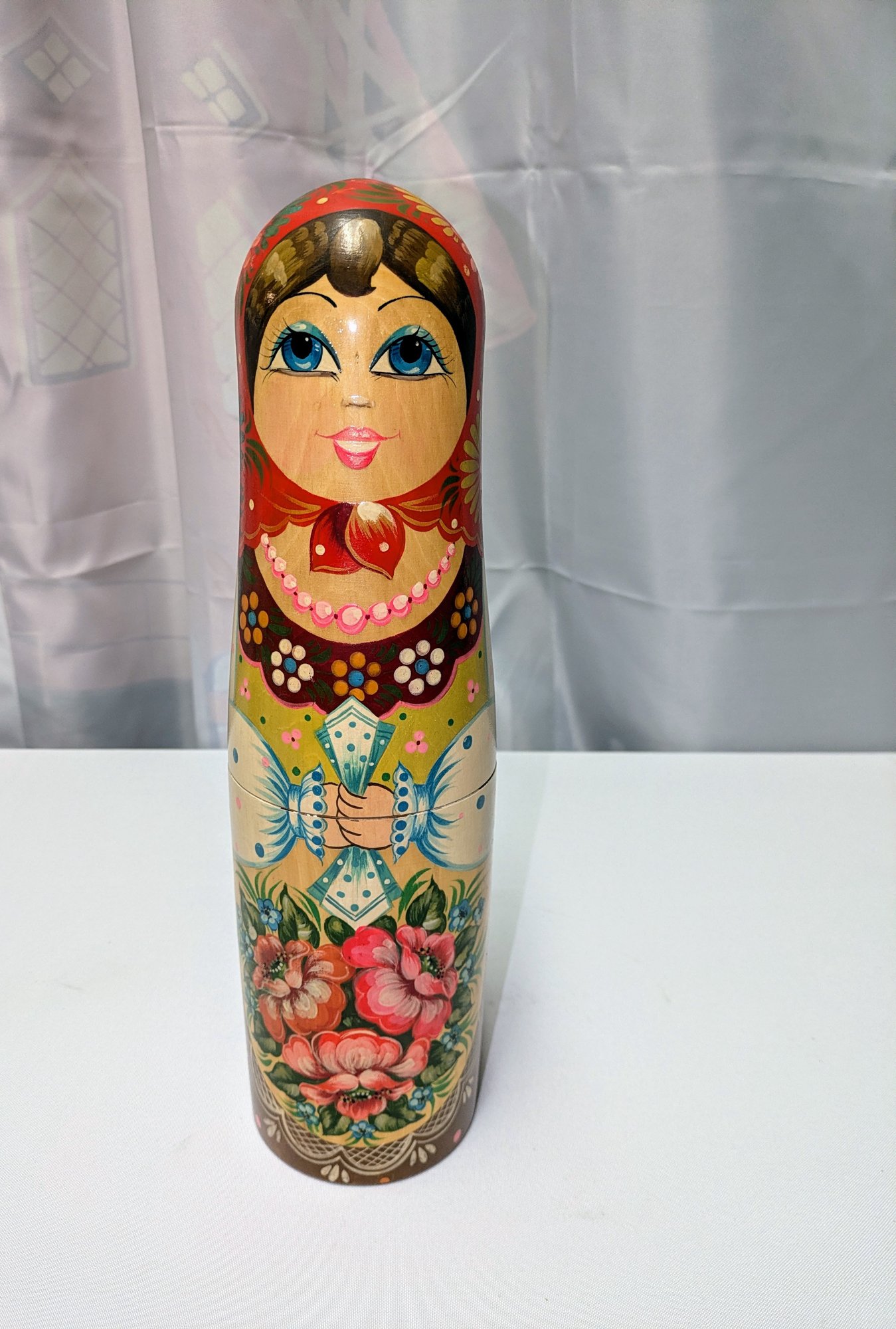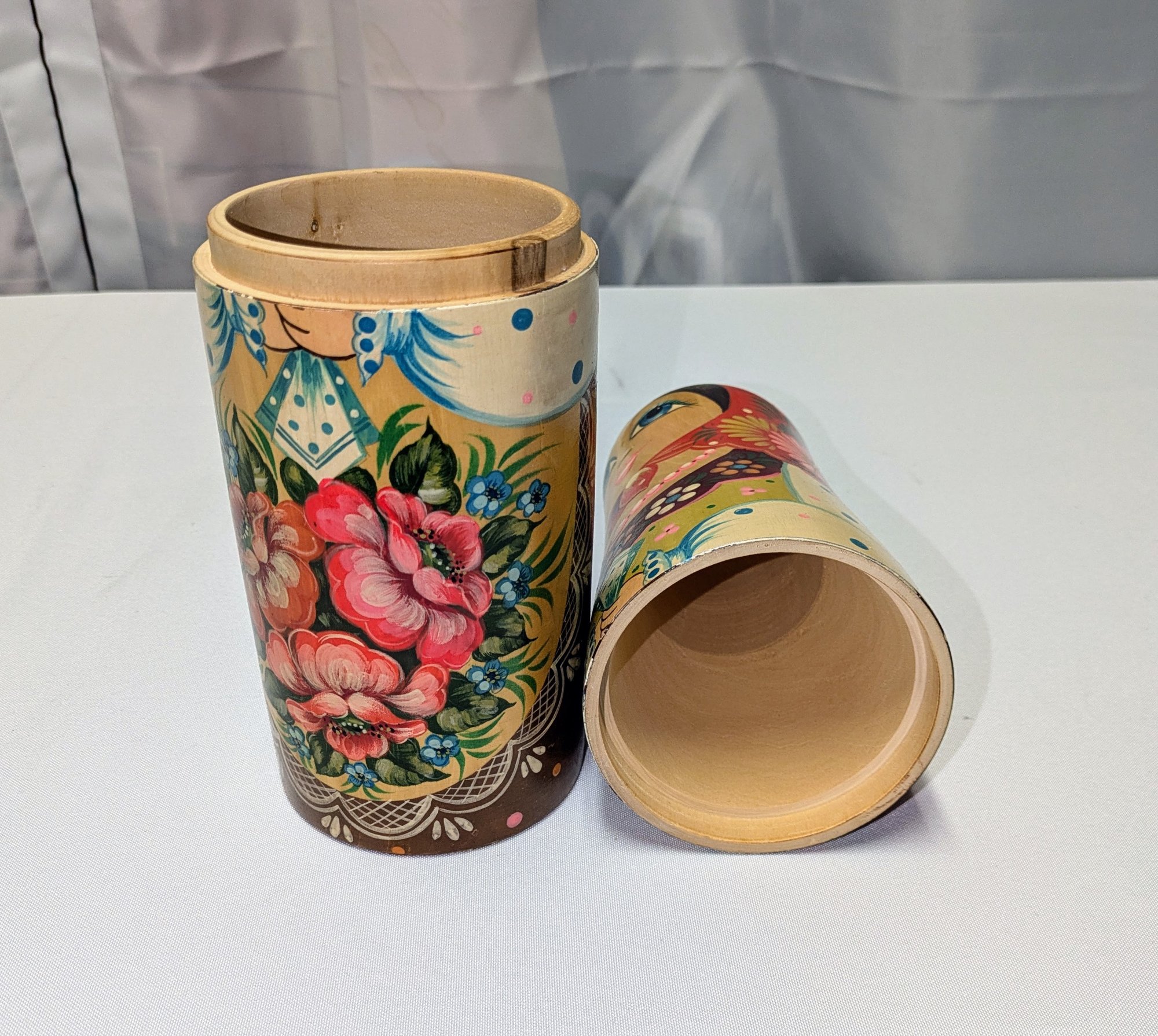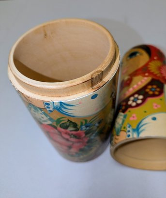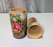 Beautiful Detail and Design. Decorated with intricate floral patterns and a traditional headscarf. Excellent Condition. Please see all photos as part of the description and condition. 14.5"H x 3.5" Inner Diam / 4" Outer Diam.