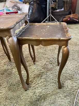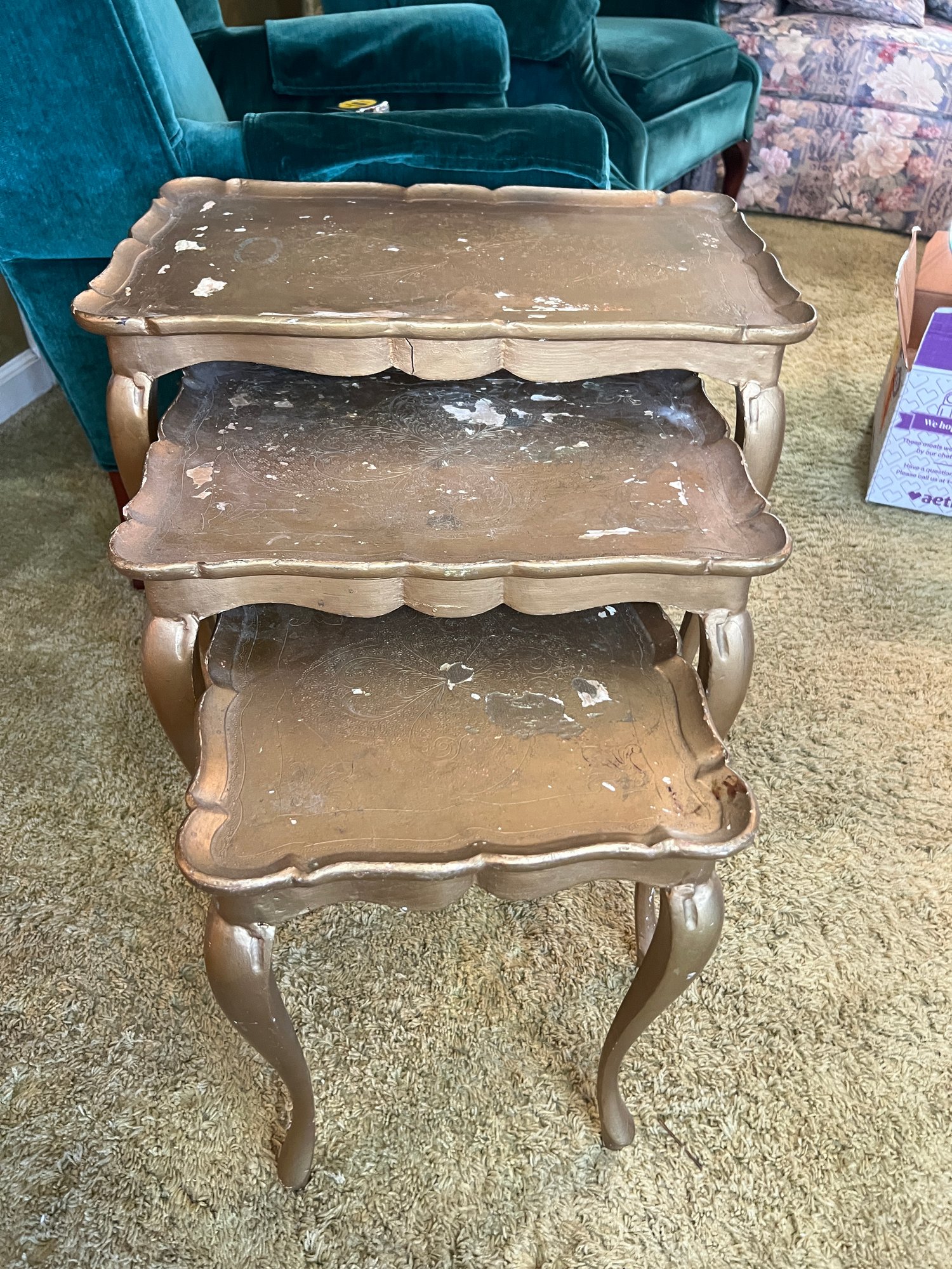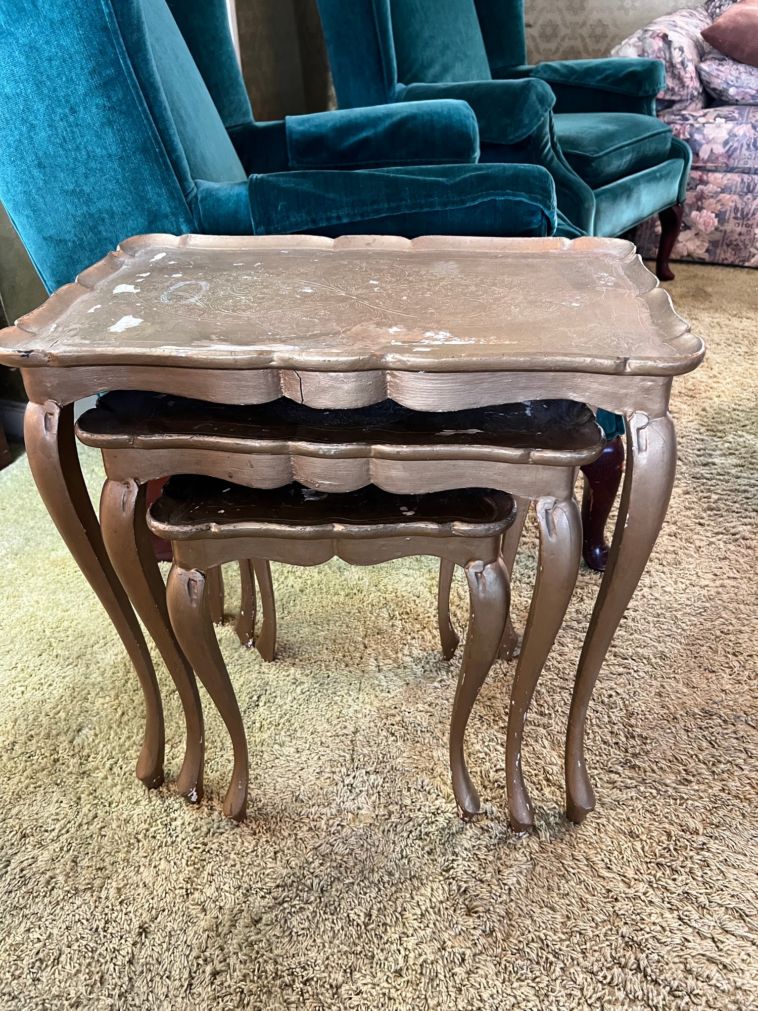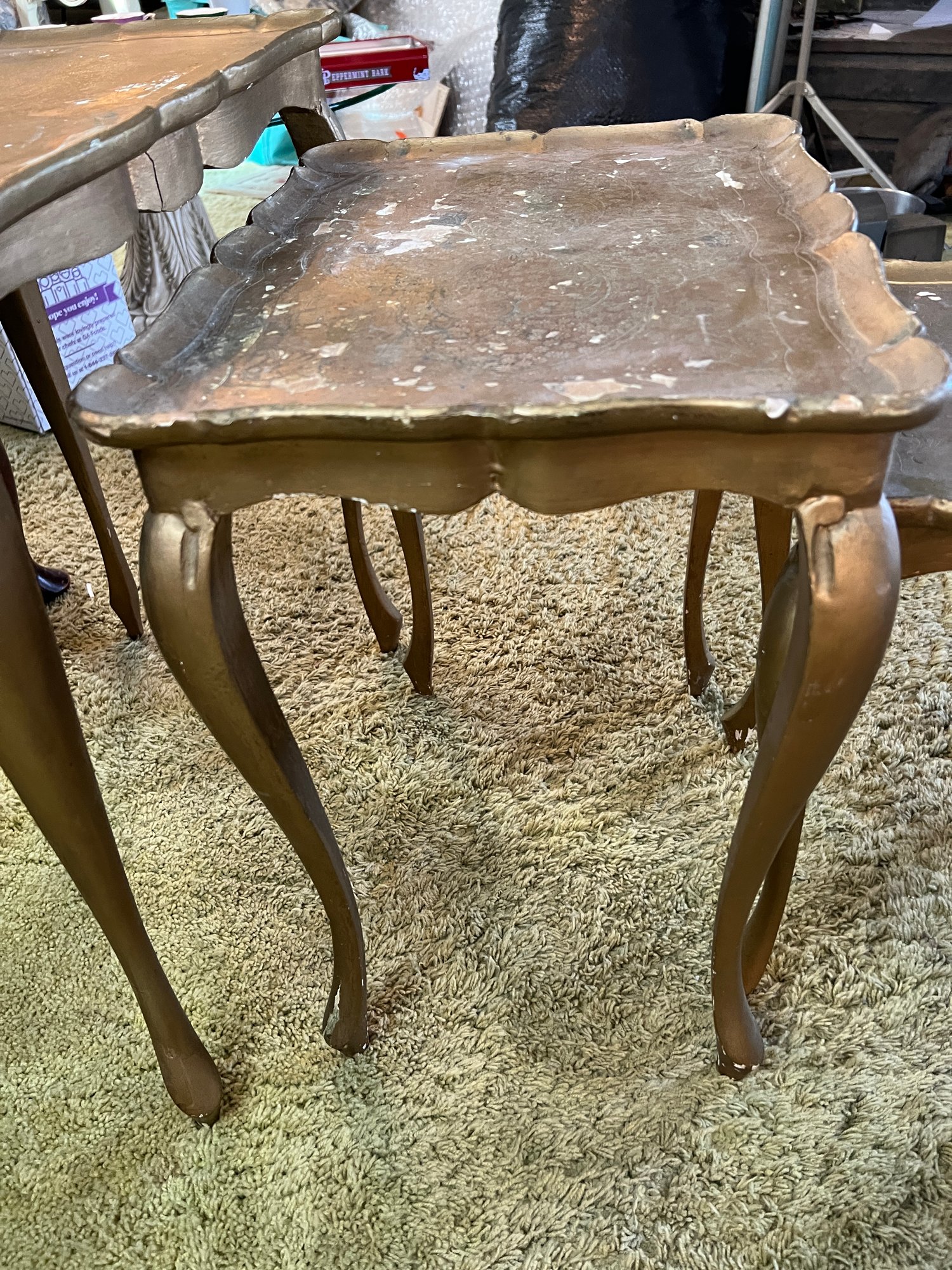 Delightful vintage trio of Florentine gold painted papier-mâché nesting tables with the partial original label identifying they were made in Italy by Fomerz.