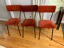 Metal chairs with burnt orange velvet seats and backs. Good used condition with scuffs and scrapes from use and age. Fabulous vintage vibe or awesome refurbish project. Metal structure sturdy - no wobbles or damage other than cosmetic blemishes. Maker unknown.