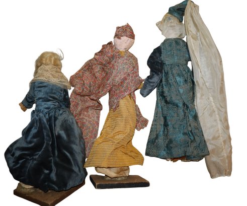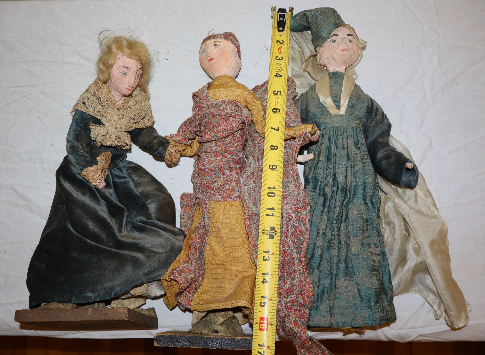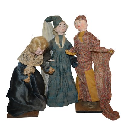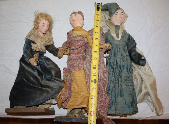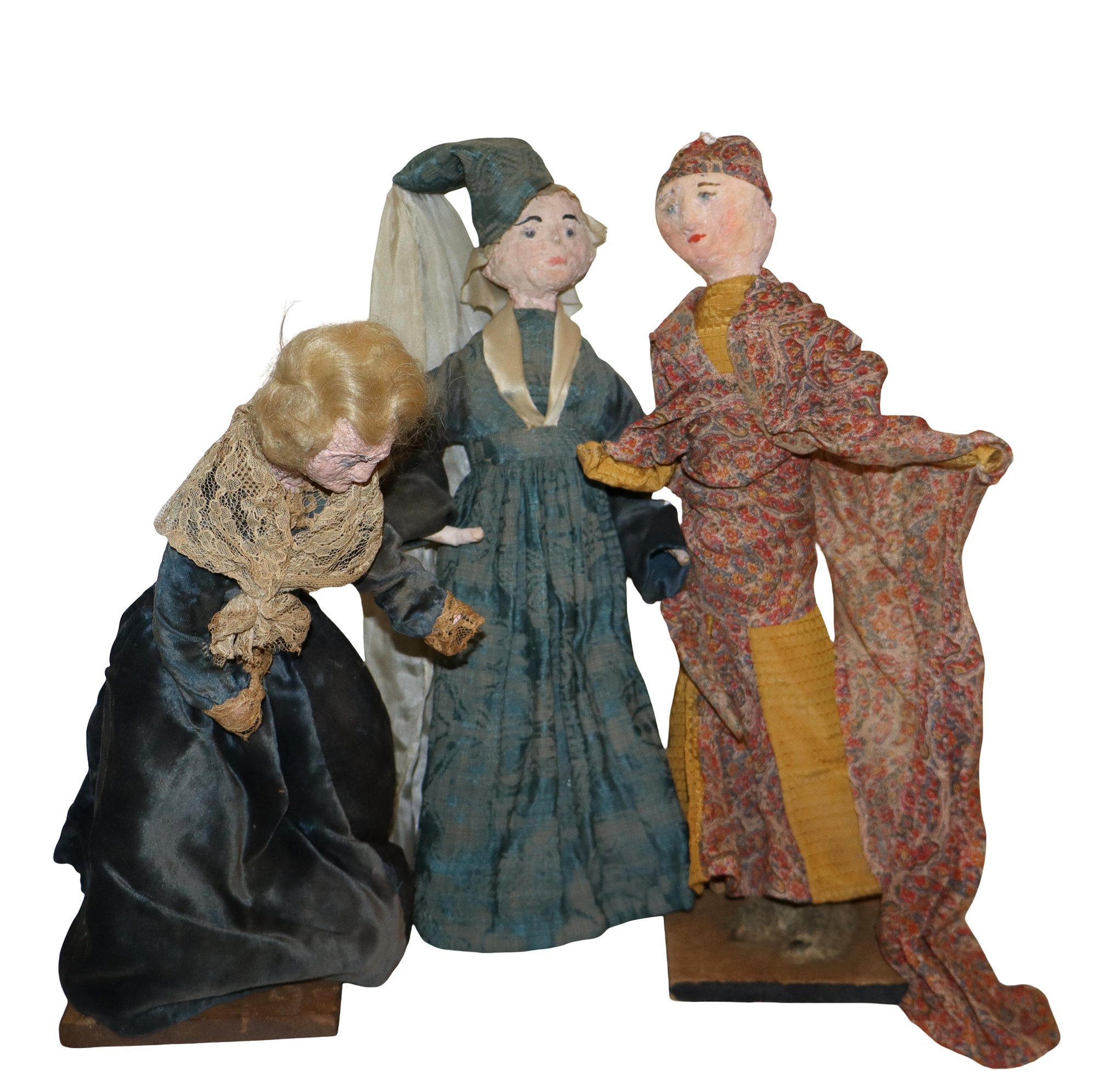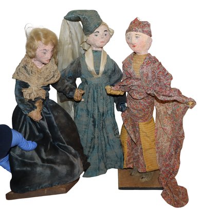 2 dolls are mounted on light wood squares with Dutch style decorated bottoms