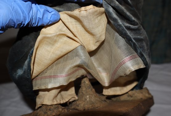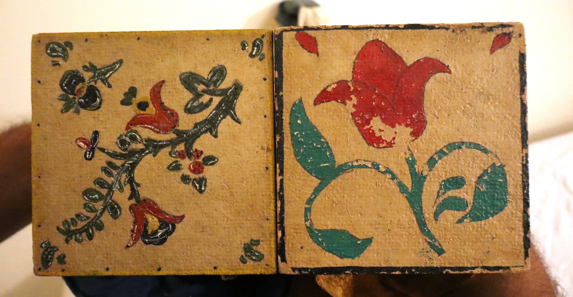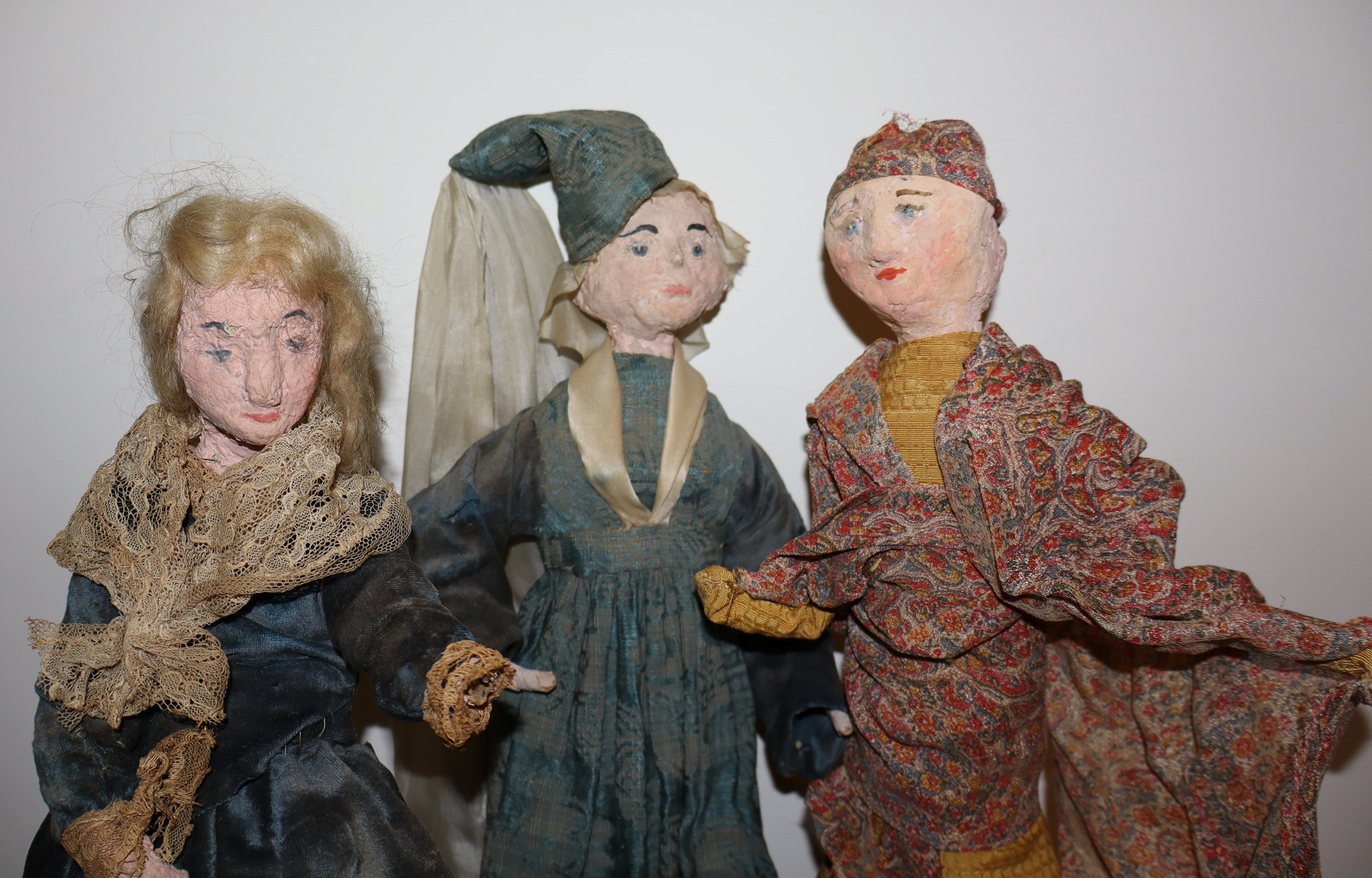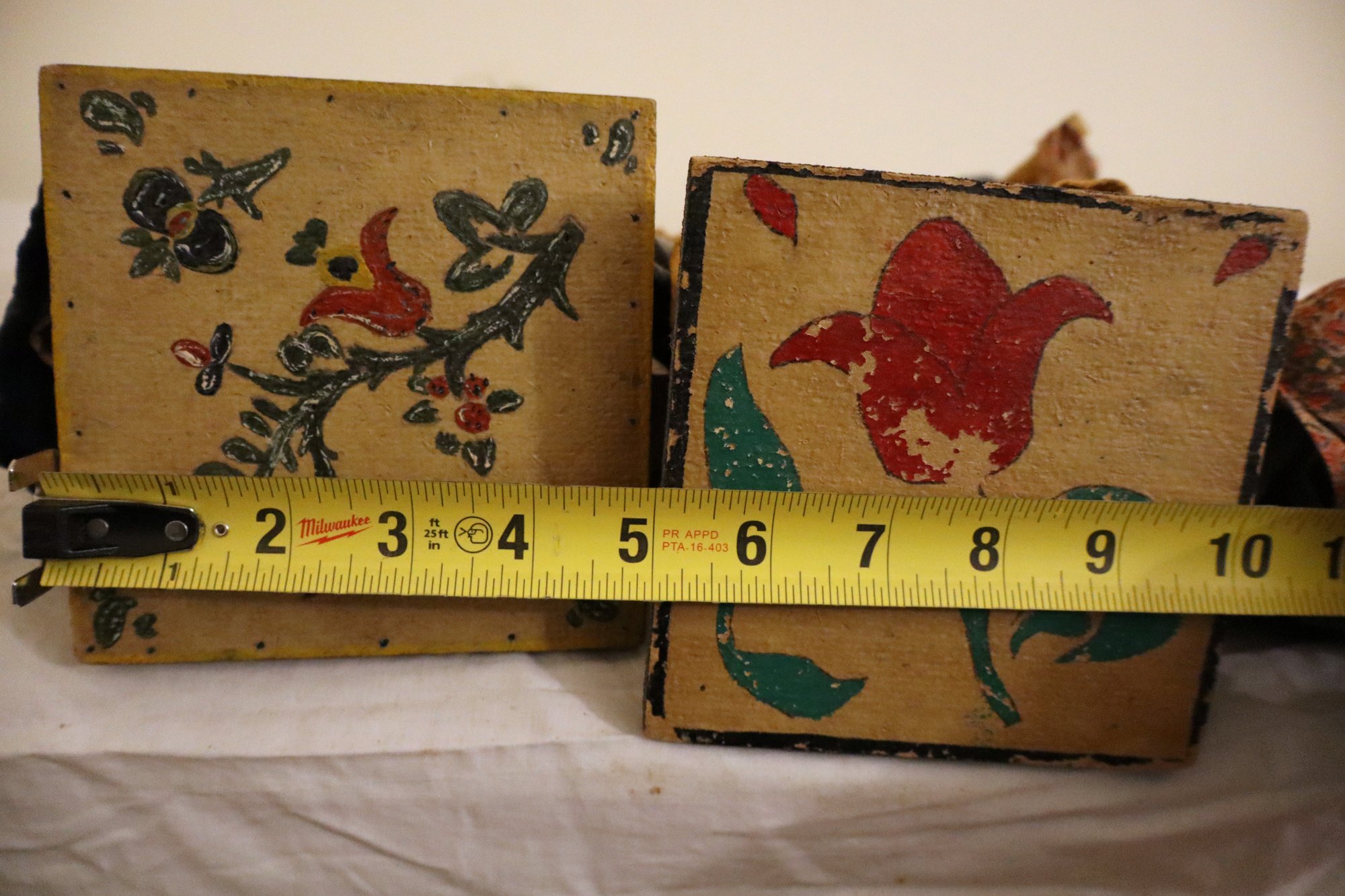 2 dolls are mounted on light wood squares with Dutch style decorated bottoms