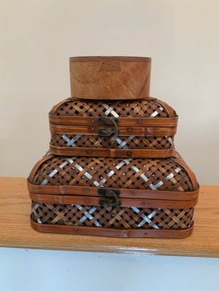 This lot includes a handmade wooden puzzle box with elaborately crafted sliding lid as well as a matched pair of woven storage boxes. All appear to be in great condition.
