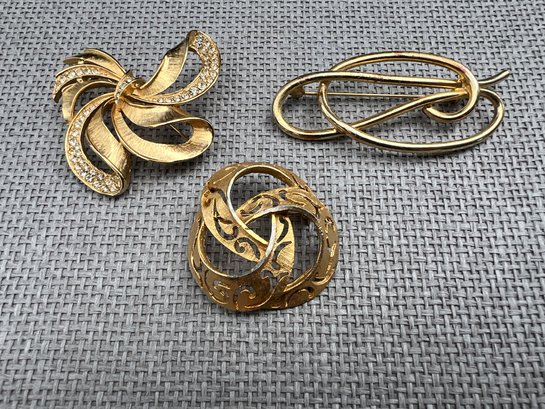 Trio of vintage gold tone brooches from the mid century period, one signed by New York City maker BSK.