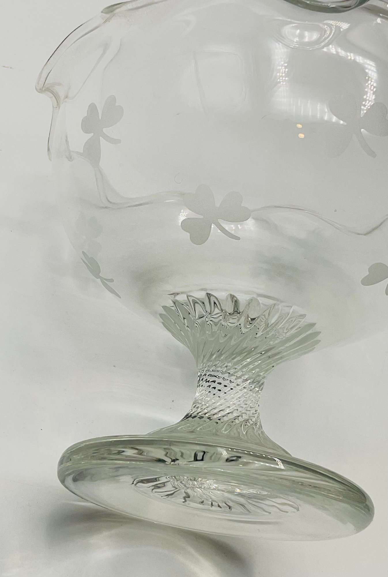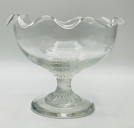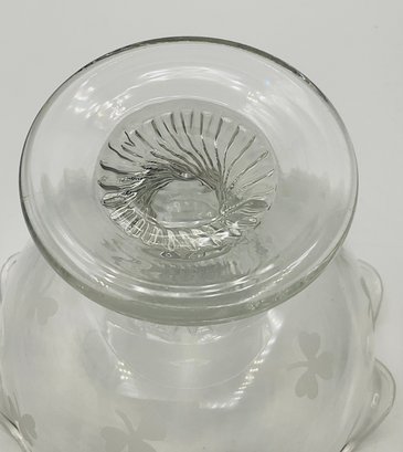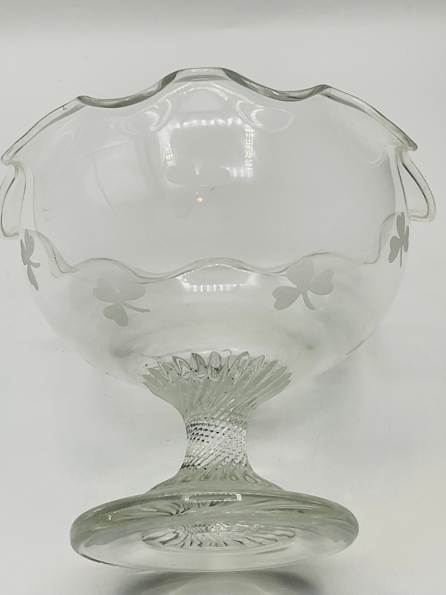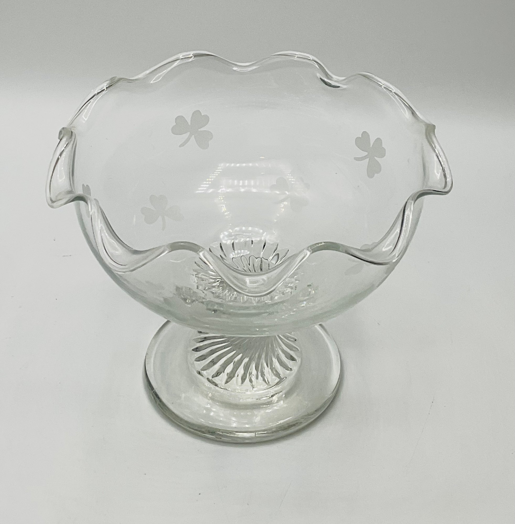Etched Shamrock Compote: An open, footed bowl featuring a delicate ruffled rim and three etched shamrocks. Measures approximately 5.5" in diameter and 4.5" tall. It features a distinct spiral-swirl pedestal base.