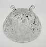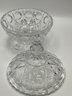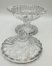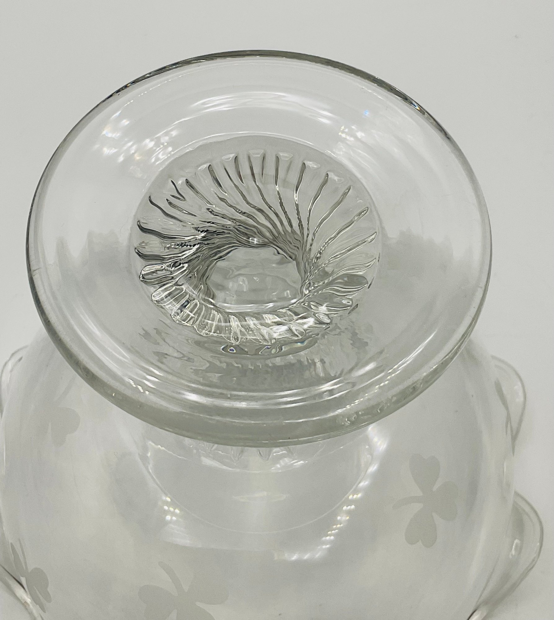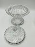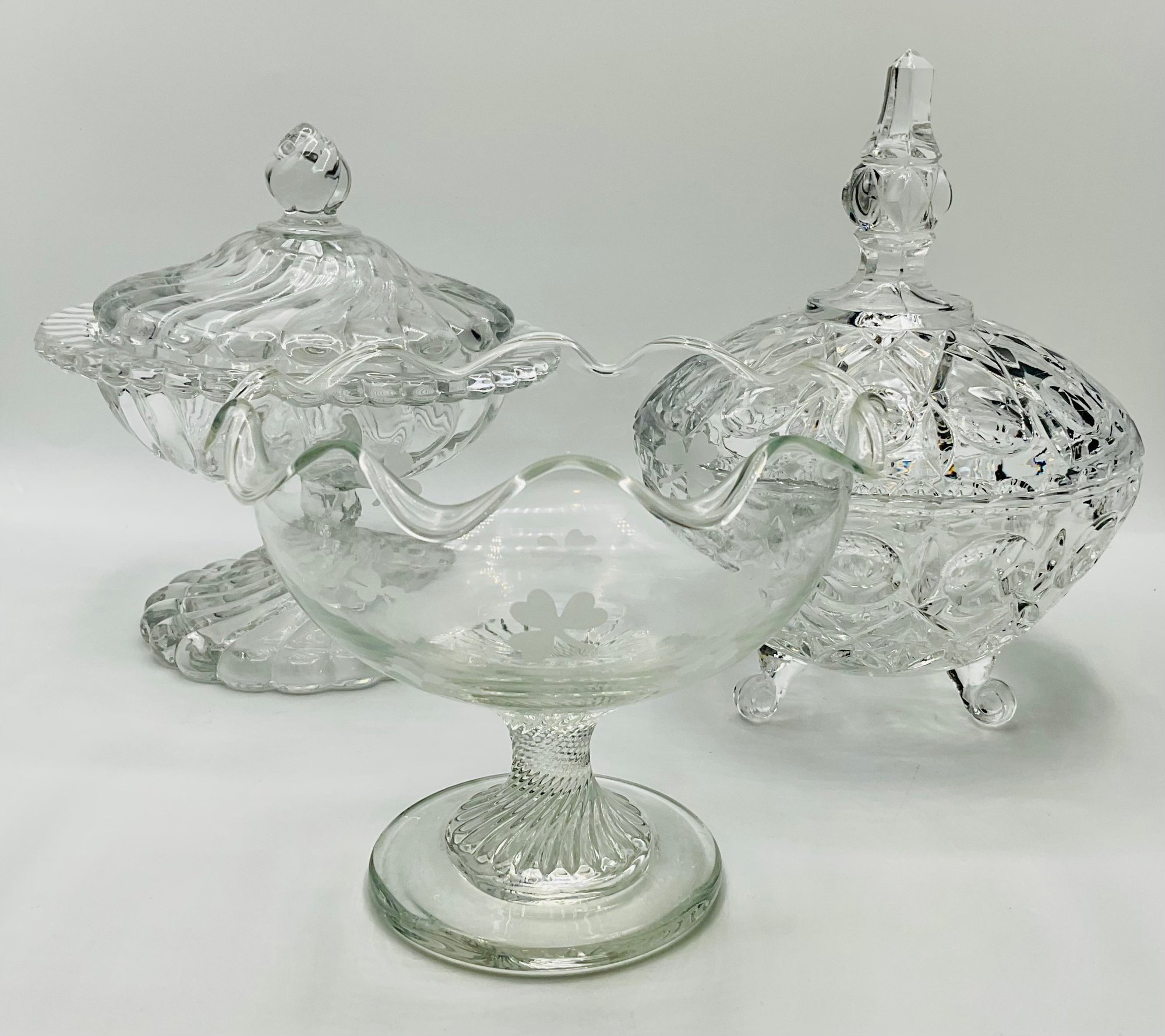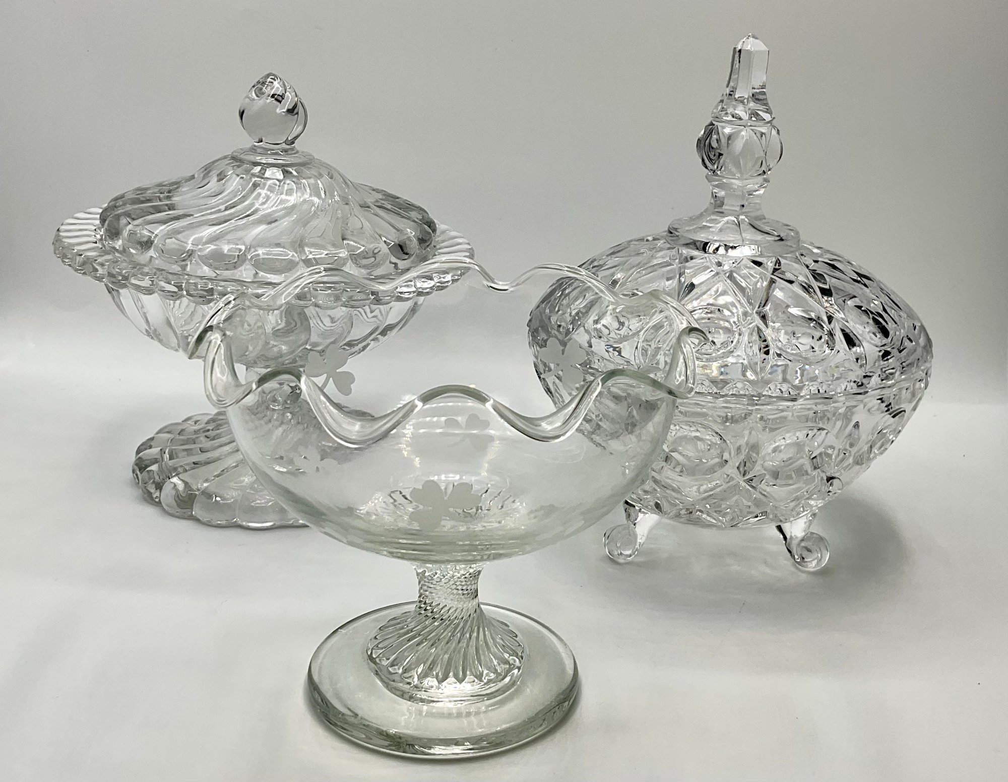 Etched Shamrock Compote: An open, footed bowl featuring a delicate ruffled rim and three etched shamrocks. Measures approximately 5.5" in diameter and 4.5" tall. It features a distinct spiral-swirl pedestal base.