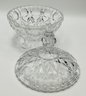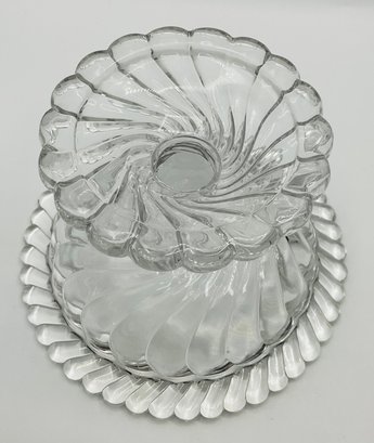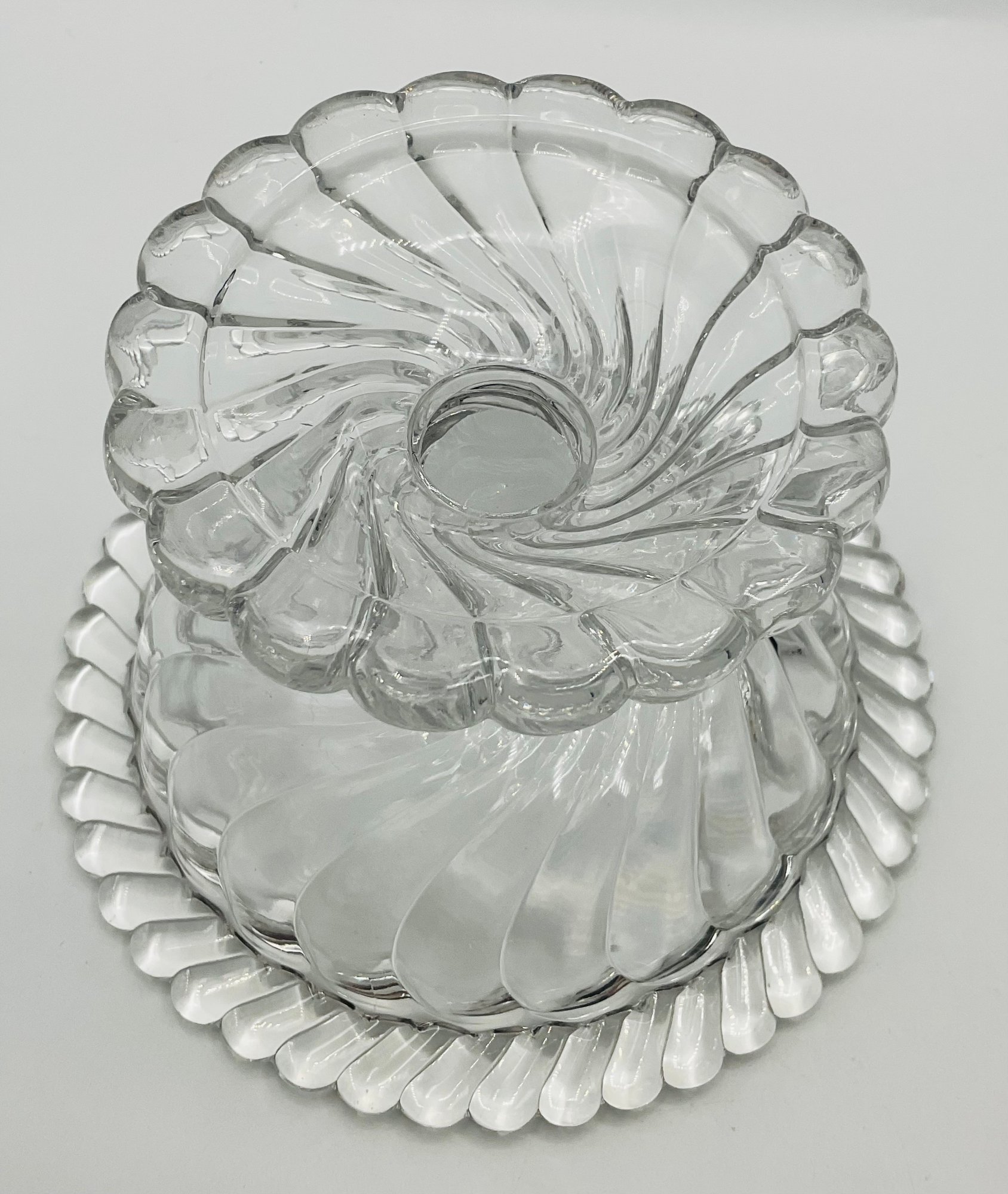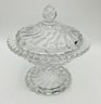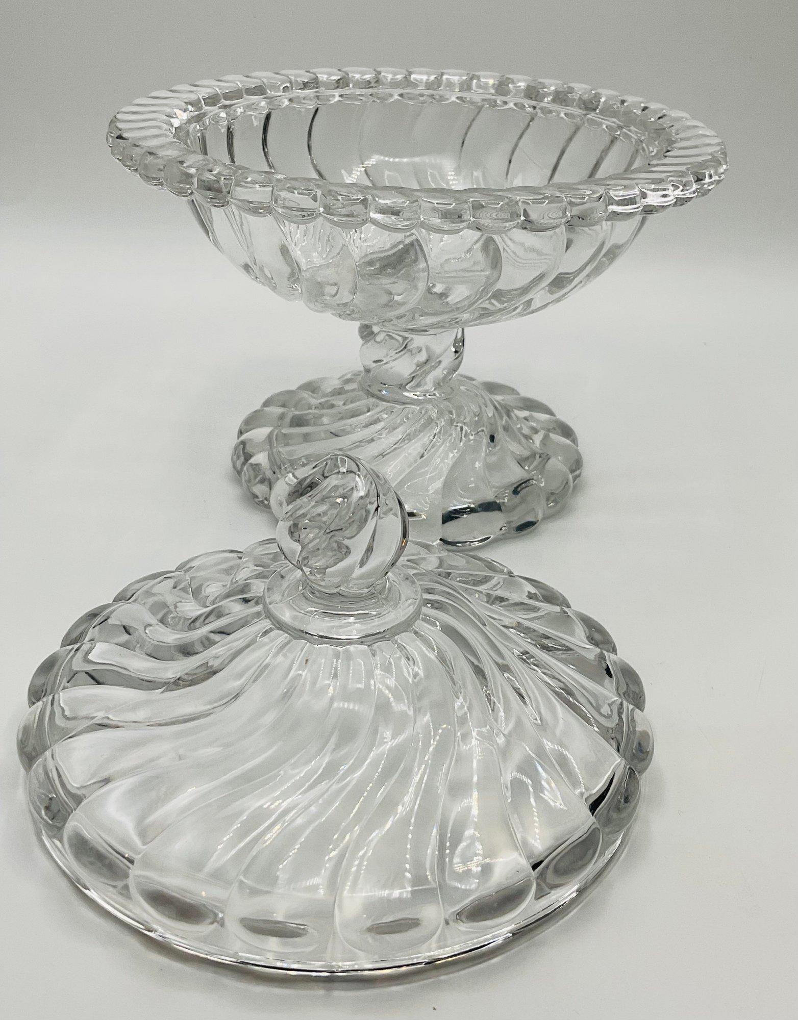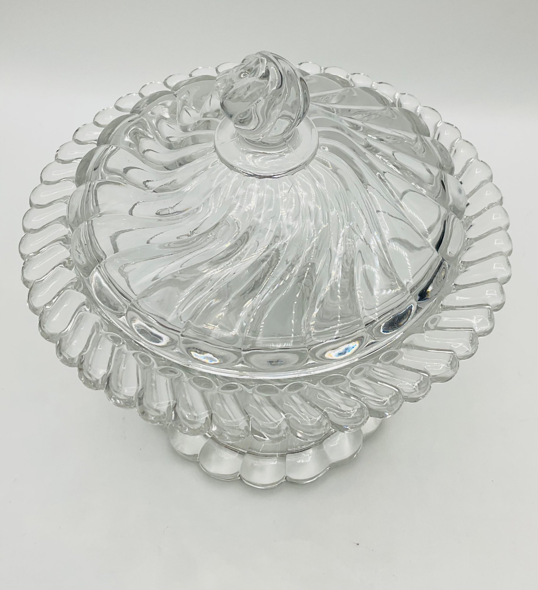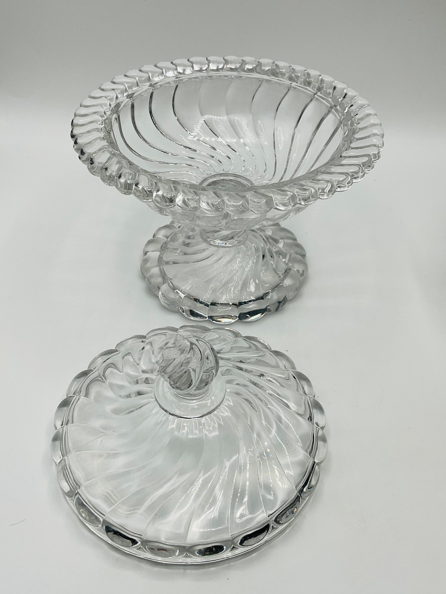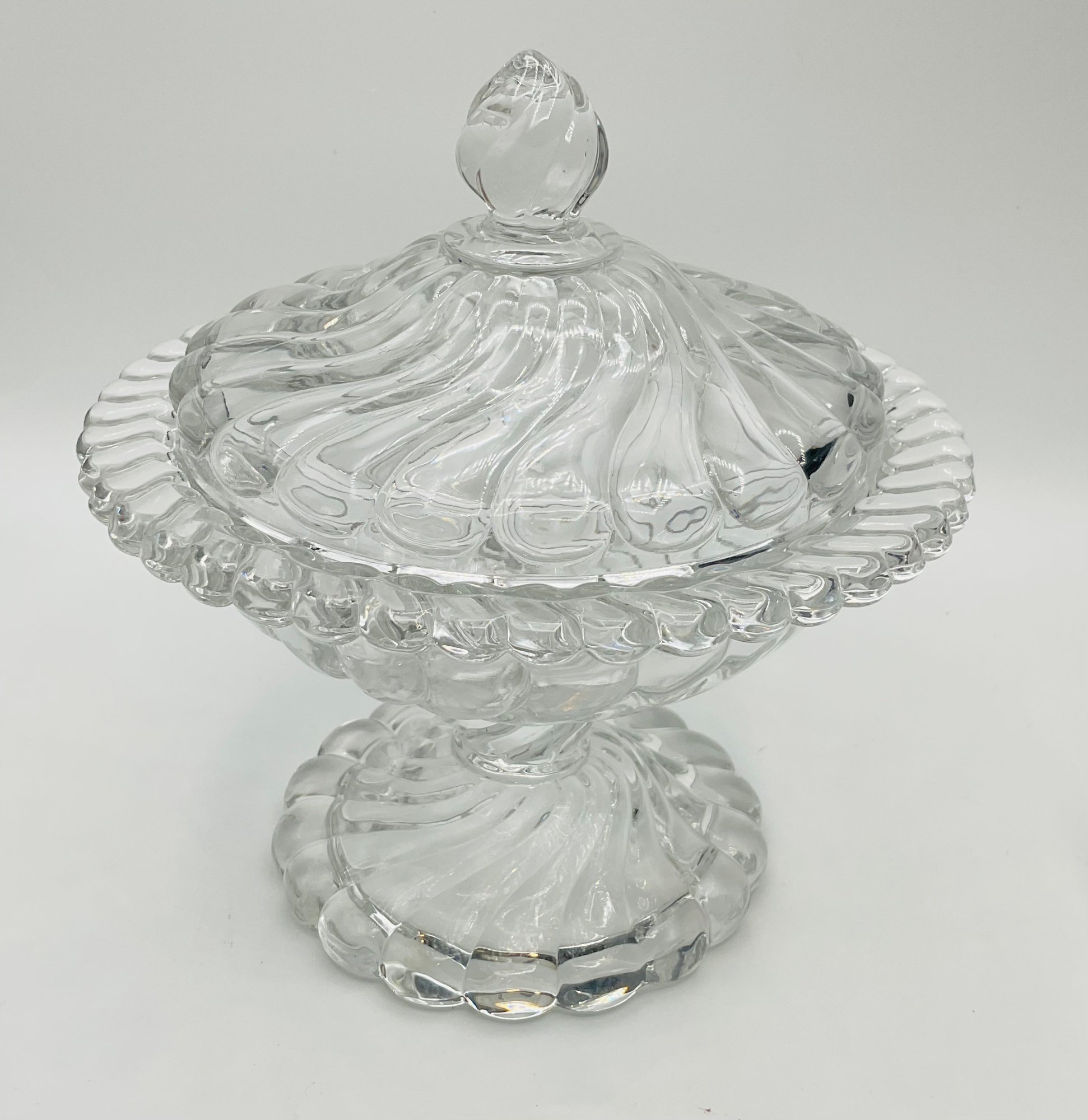 Swirl Pattern Covered Dish: A low-profile, footed candy dish with a deep spiral swirl design on both the base and the lid.