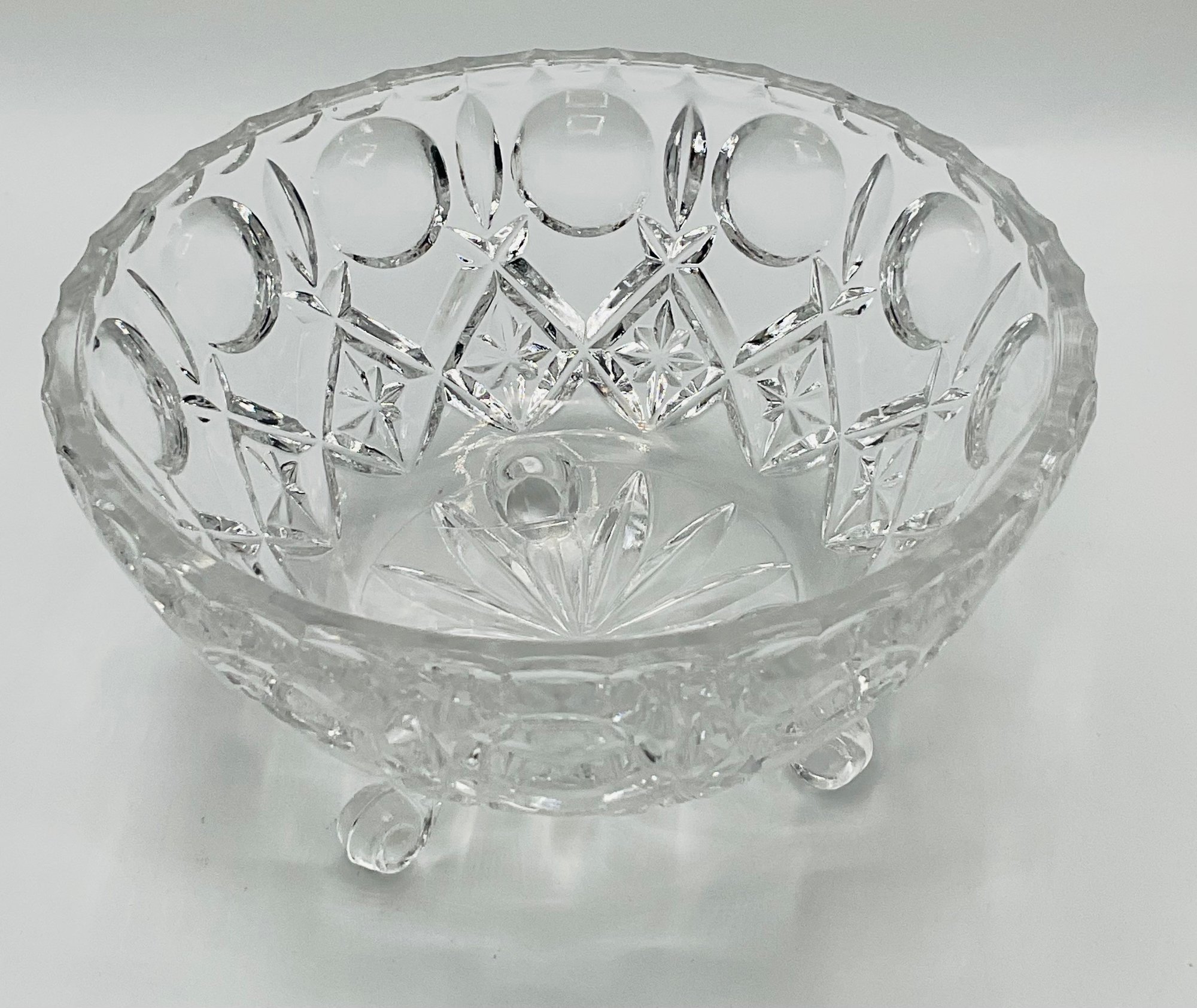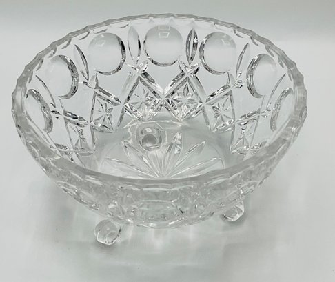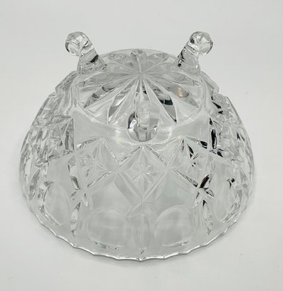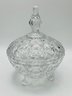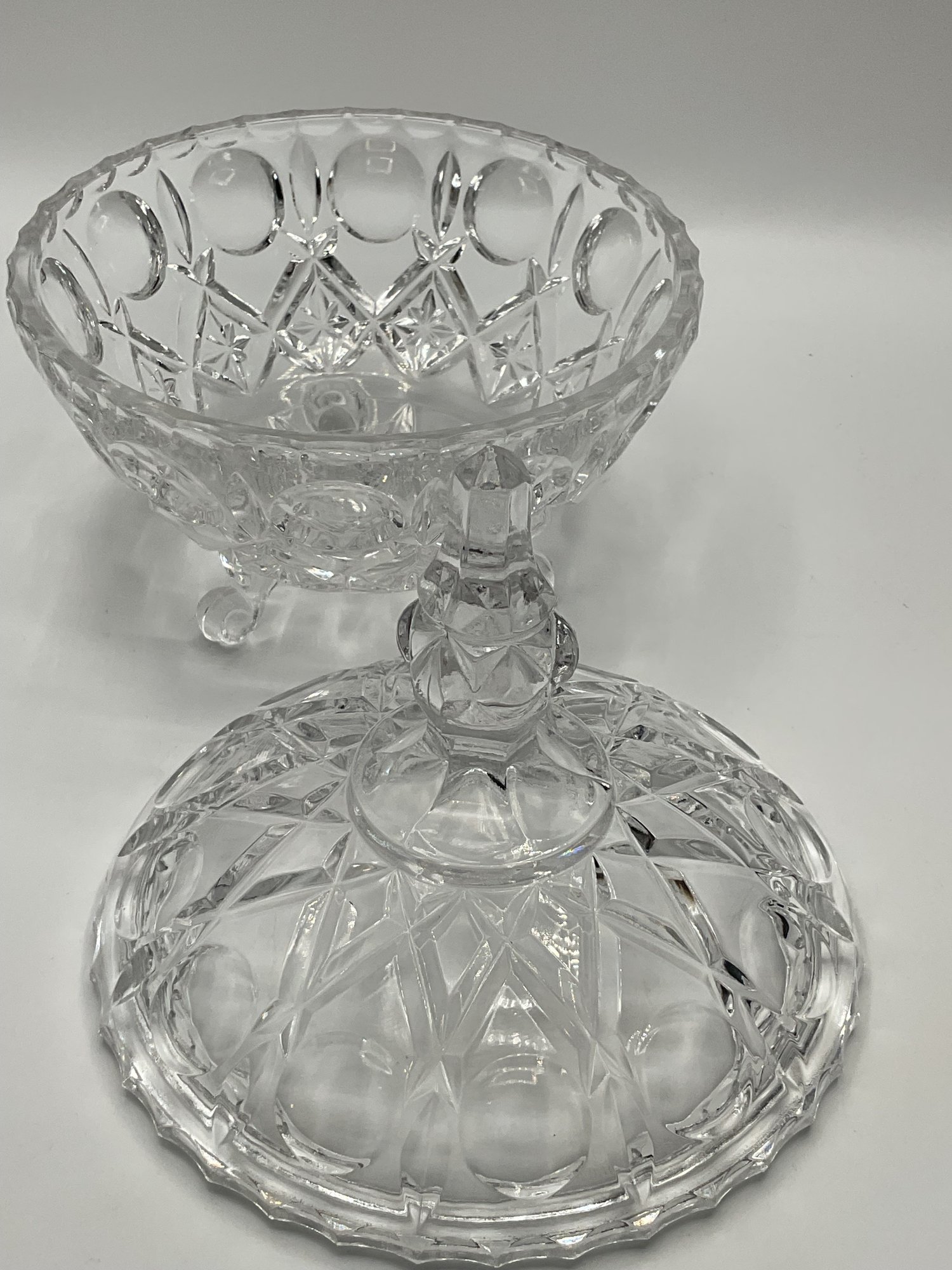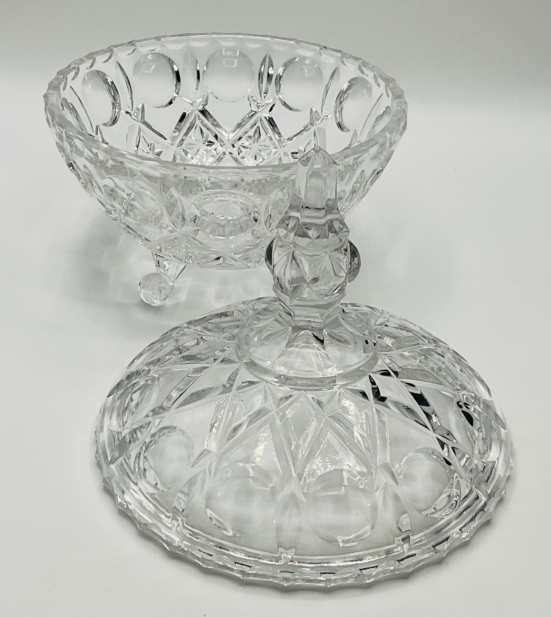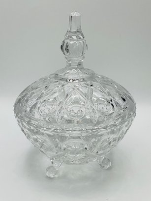 Daisy and Button Three-Footed Candy Jar: A vintage covered jar in a classic pressed glass pattern with a tall, decorative finial. This piece sits on three ornate scroll feet.