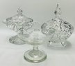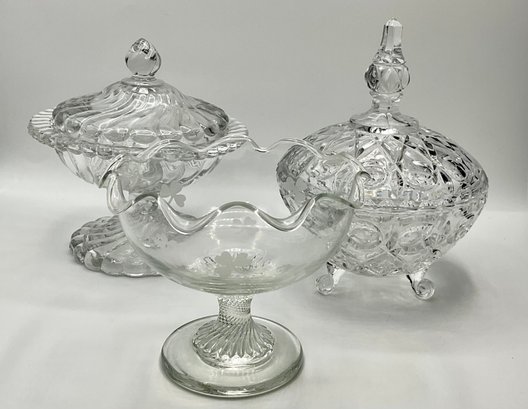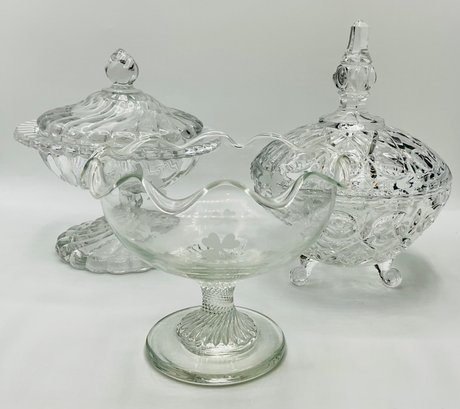 This charming three-piece collection features a variety of classic glass styles, perfect for candy, nuts, or decorative display. The set includes two covered jars and one open ruffled compote.