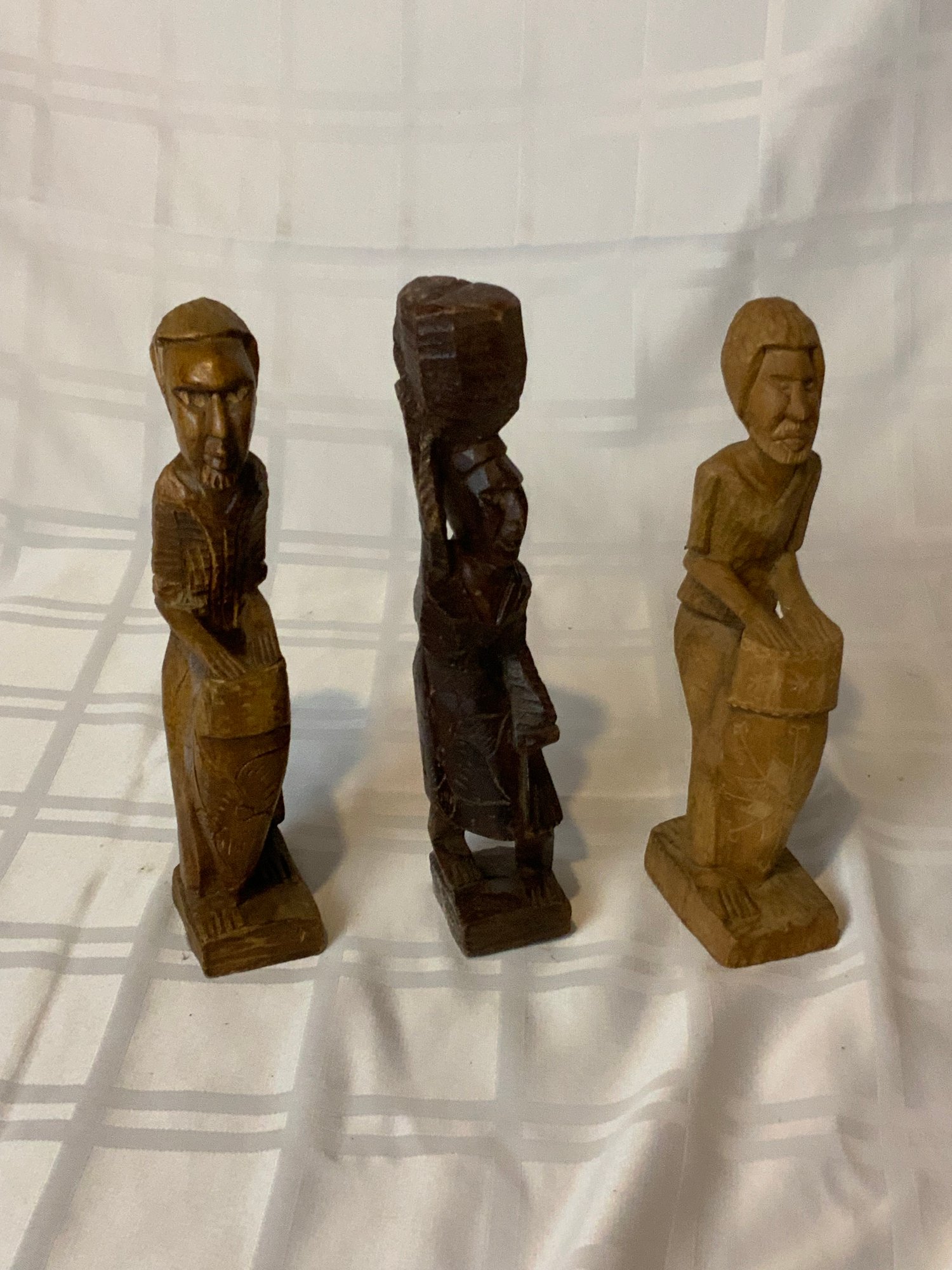 These are hand carved figures, 2 male drummers and a female carrying a basket on her head. They are in good condition, female figure has a break in the base but the other two look perfect. Unsure of provenance, possibly African. No signatures found.