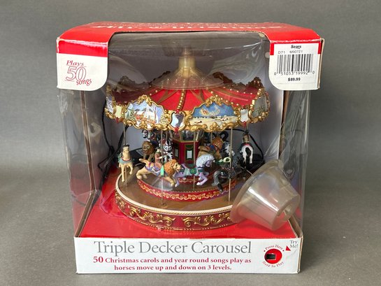 It plays 50 Christmas carols and year round songs play as horses move up and down on 3 levels. Songs are listed on back. It’s never been opened. The box is 12.5x12.5x13” tall.
