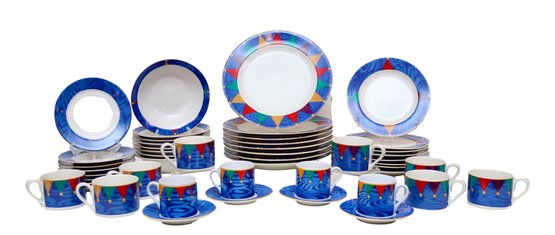 Troubadour Riviera Van Beers by Signature Stoneware that is dishwasher, microwave and oven safe. 8 place settings. Plates are banded in a blue moire and are highlight by colorful jester triangles for a fun pop of color. Made in Indonesia.