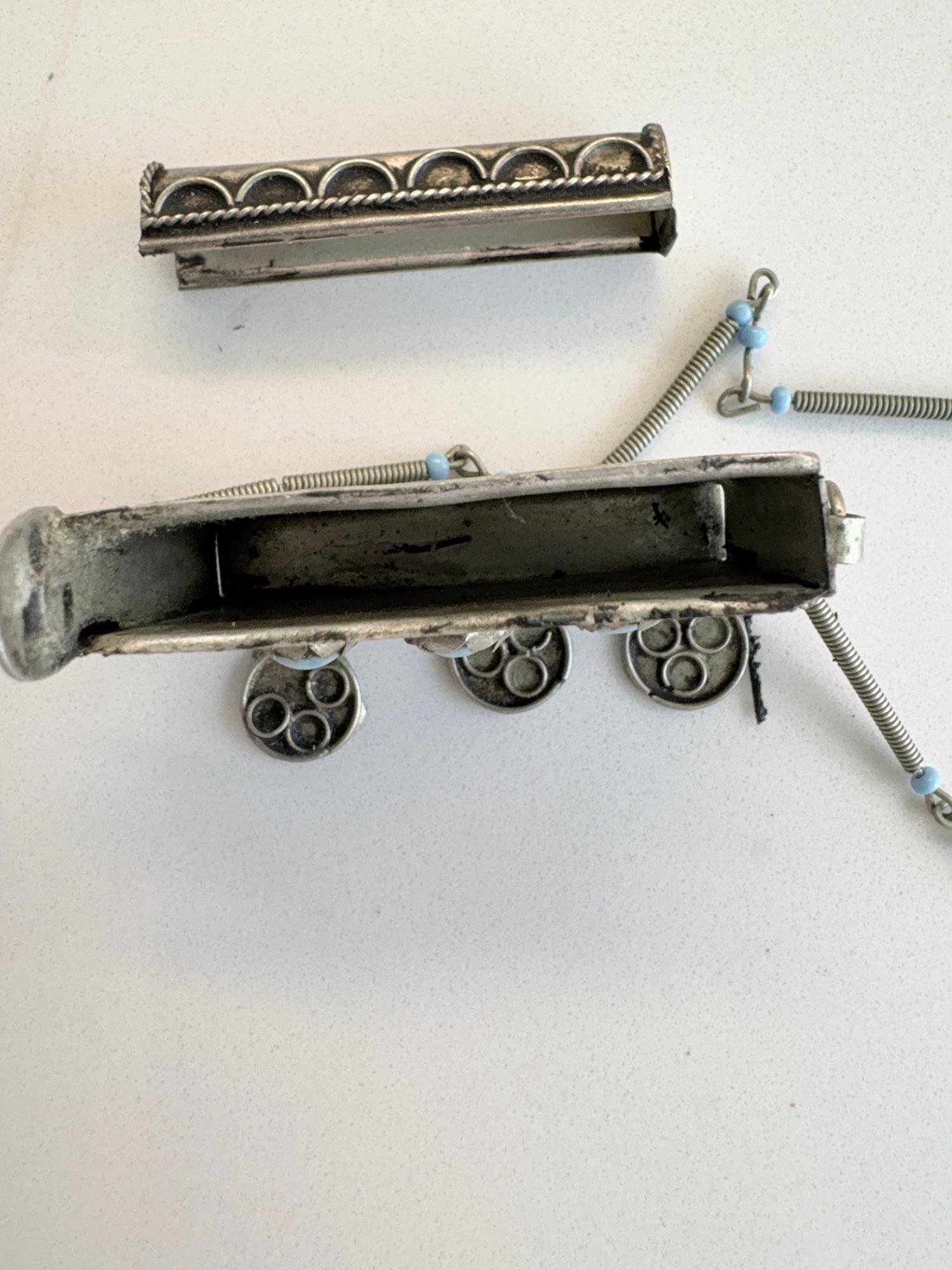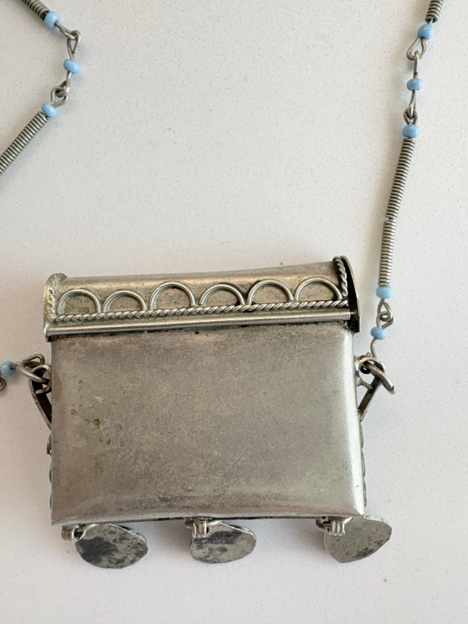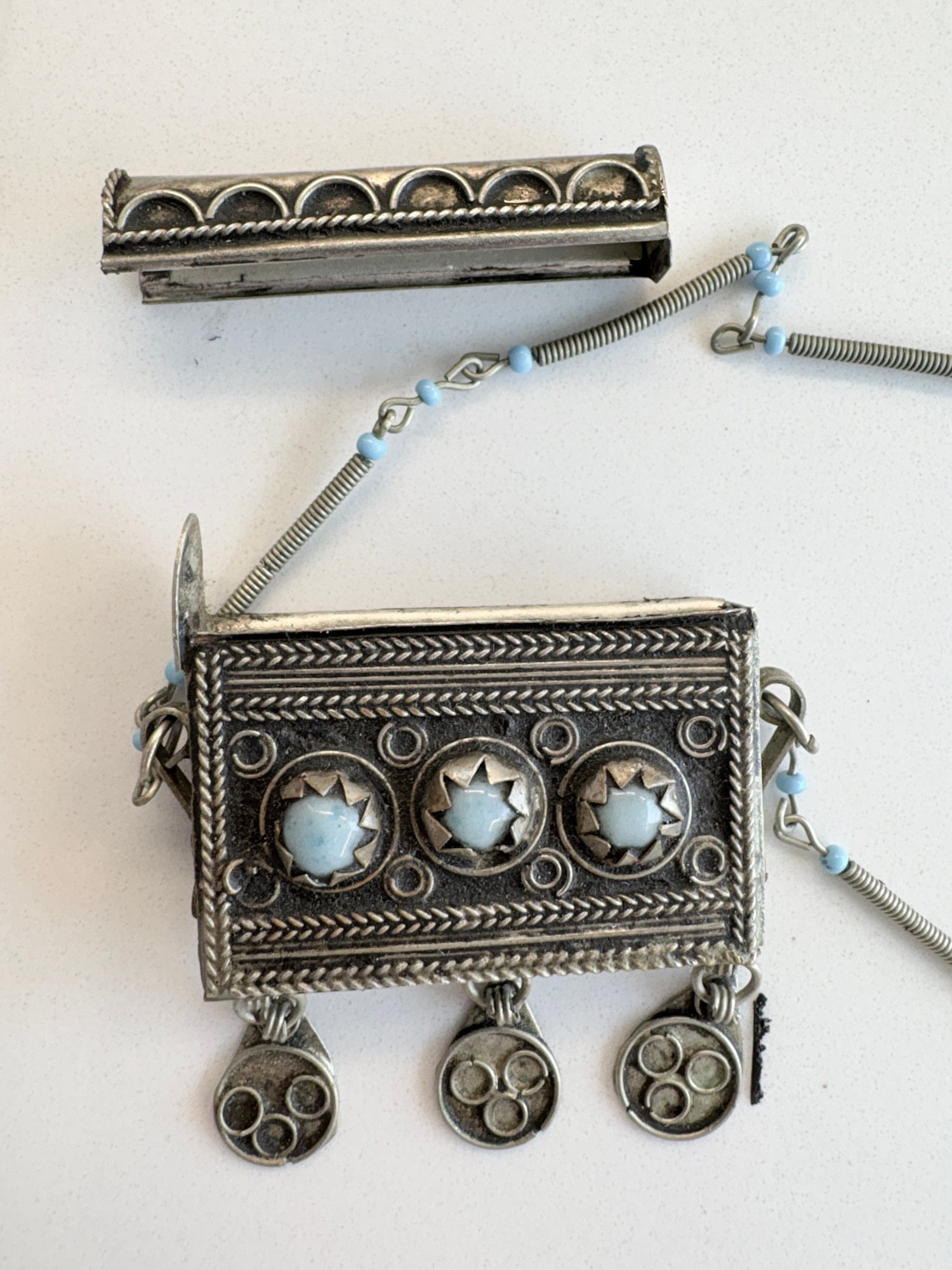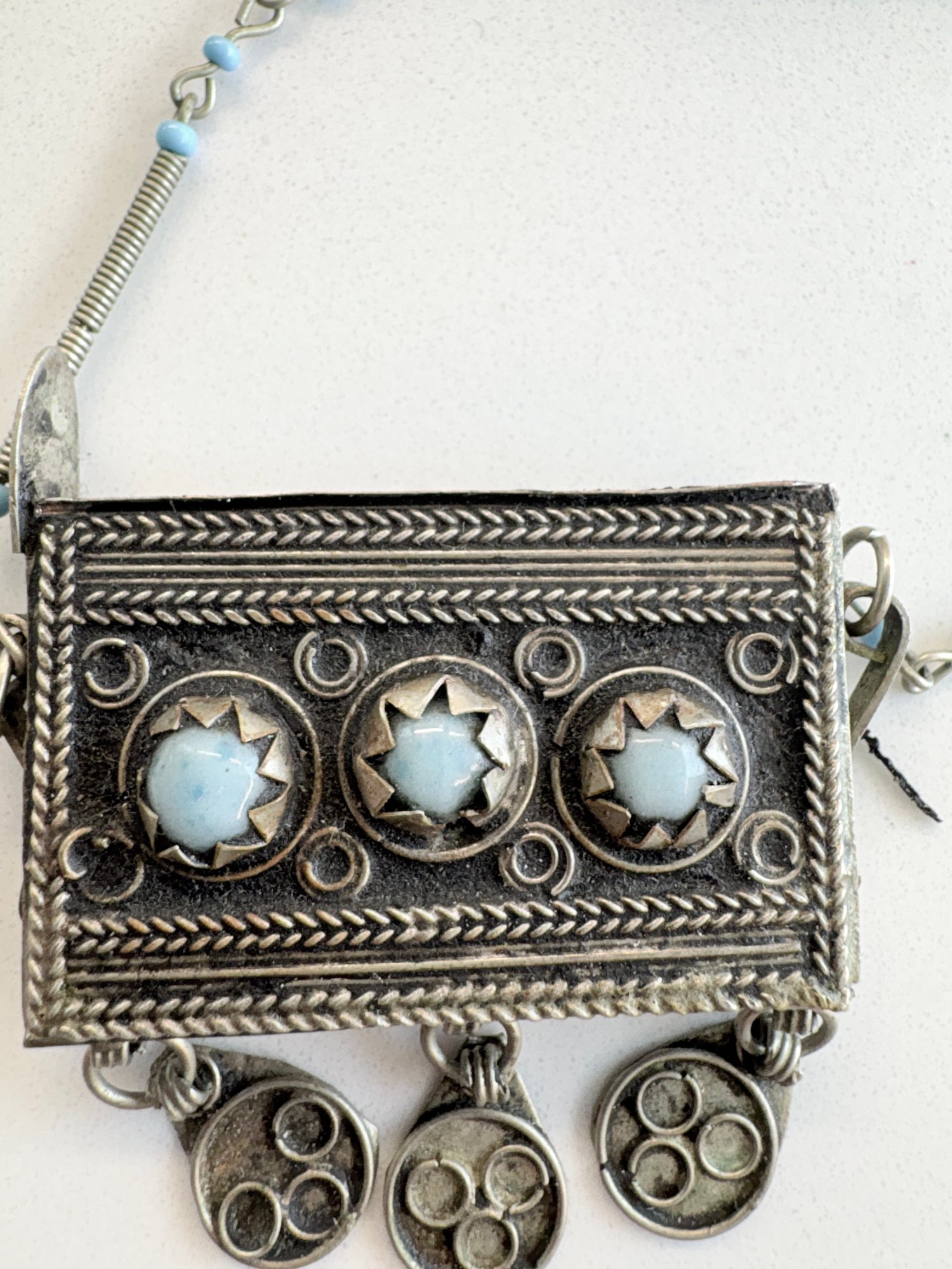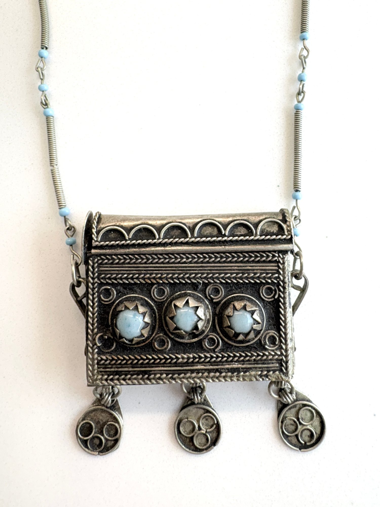 Vintage tribal amulet box necklace, often referred to as a "taweez" or "ghau." These pieces traditionally function as protective talismans or prayer boxes, designed to hold sacred scrolls, prayers, or small personal items.