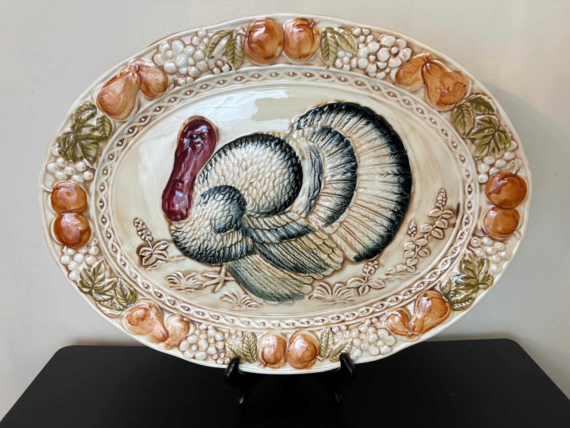 Vintage turkey platter with a beautiful wild turkey surrounded by orange and green fruits and flowers border.