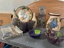 Beautiful riased blue grape pitcher; 2 grape serving bowls; grape plate; painted square glass vase; 2 oil decanters; set of 4 Beautiful amythest glasses; grape skirt