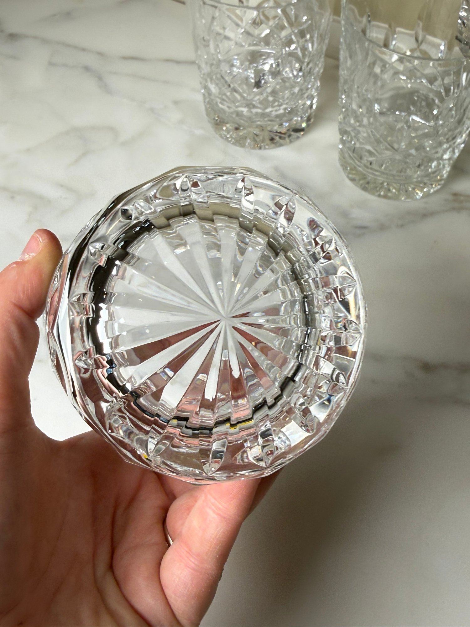 Elegant cut crystal rocks glasses in the iconic Lismore pattern by Waterford. Featuring the timeless diamond and wedge cuts that beautifully catch and reflect the light, these rocks glasses are perfectly weighted with brilliant clarity—ideal for cocktails, water, or everyday luxury at the table.
