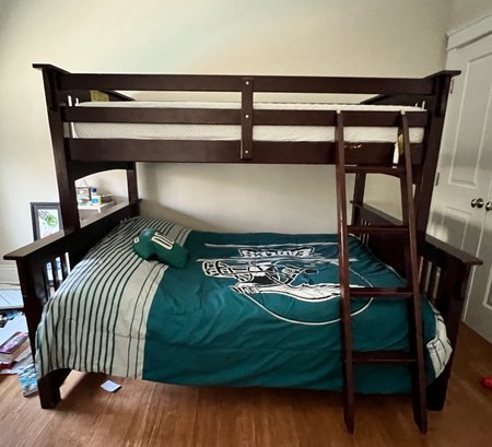 Dark brown wood bunk bed with full sized bed on the bottom and a twin upper bunk. Ladder included.