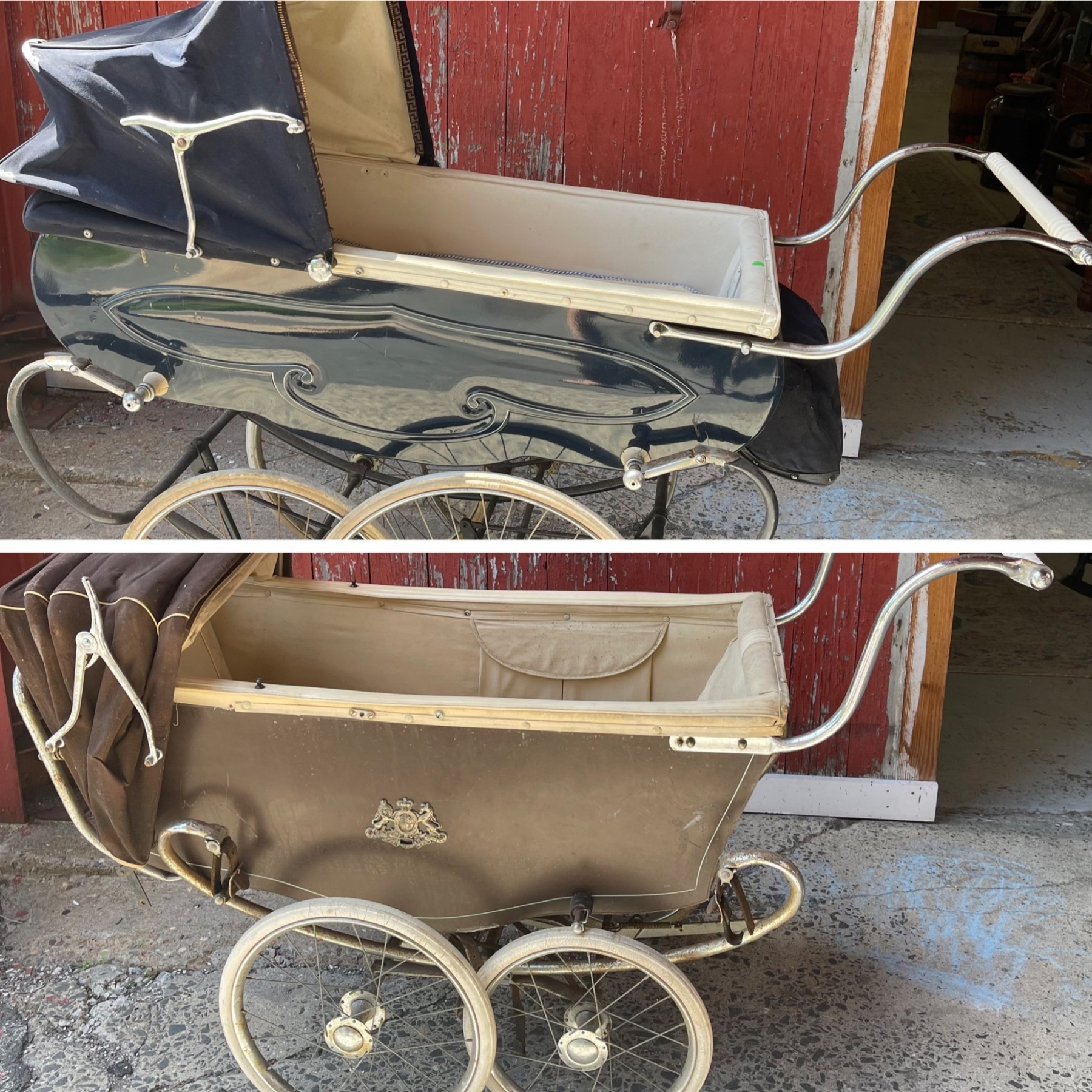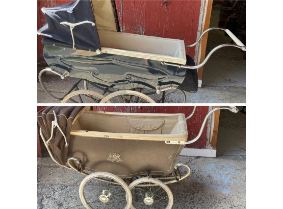 Check out these two antique prams. So very cool. They are both in need of some love and would look so amazing when fixed up. See photos for all of the areas that need some love.