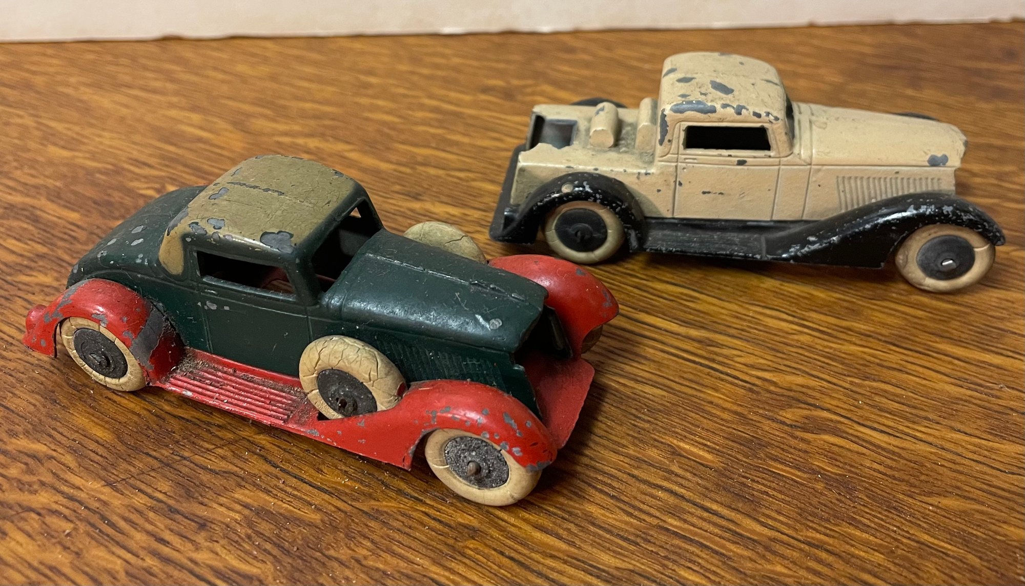 Two great looking Tootsie Toys with original paint. The off white car is 3 5/8" long. The green and red car is 3 3/4" long.
