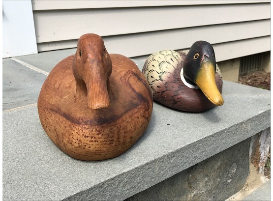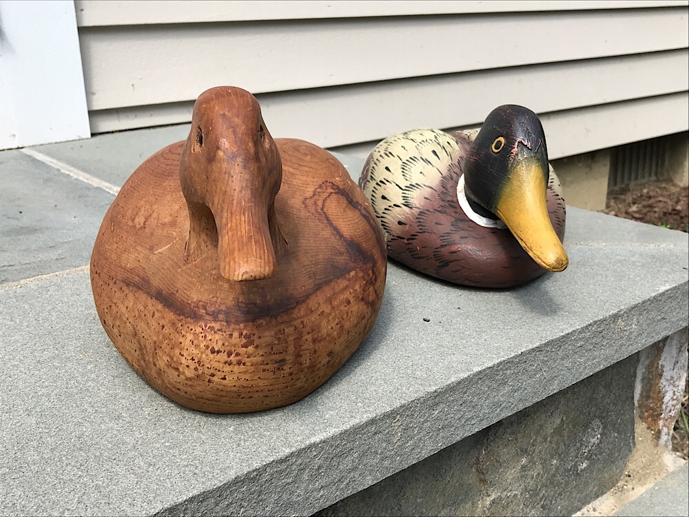 Two carved decoy ducks.