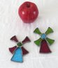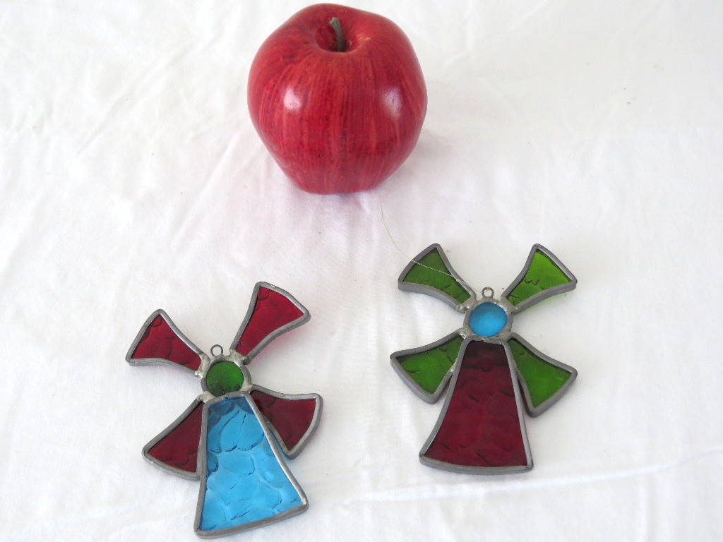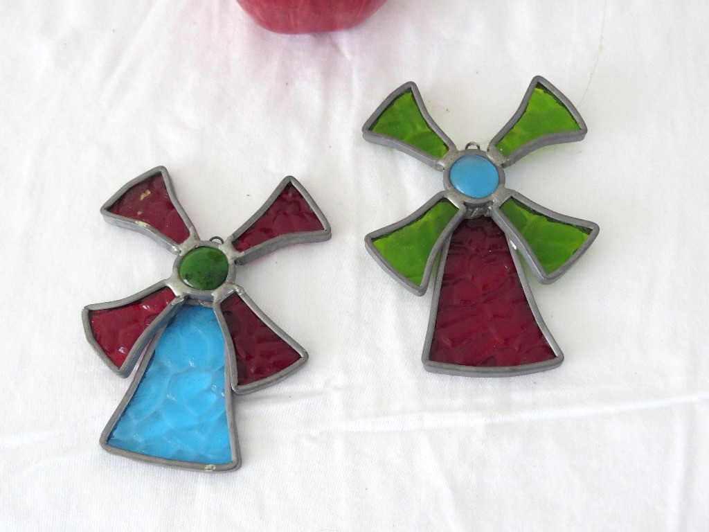 Two stained glass window suncatchers in the form of Dutch windmills.