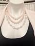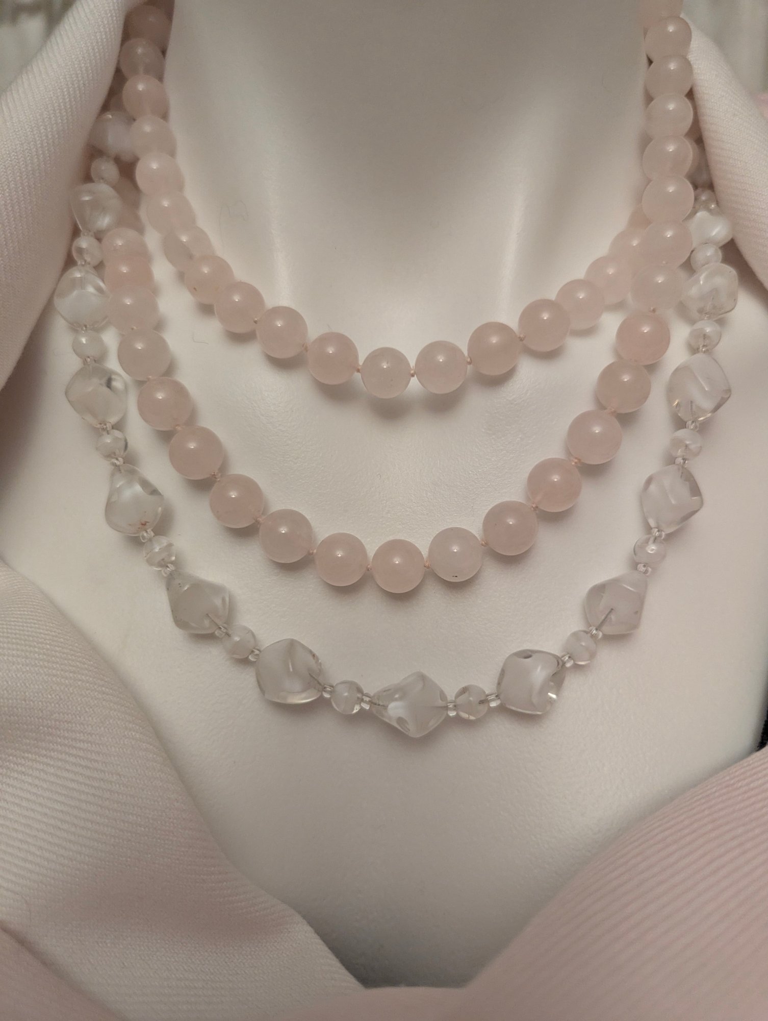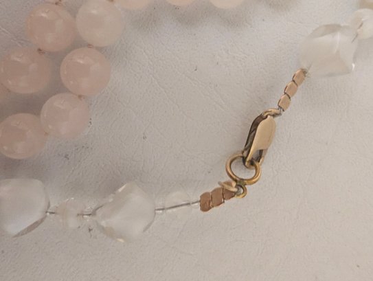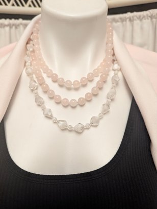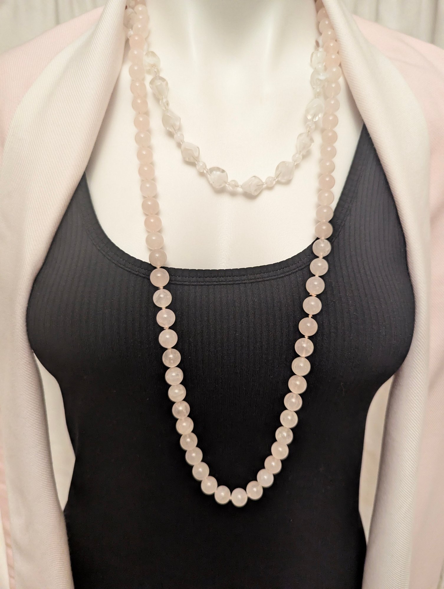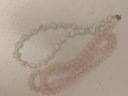 Two Hand Knotted Necklaces, 1 Semiprecious Rose Quartz 32' &24" White Glass BeadedNecklaces