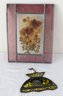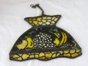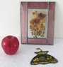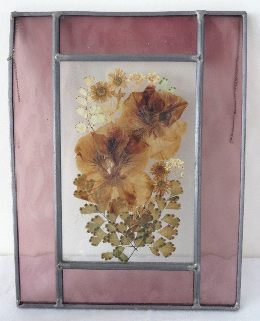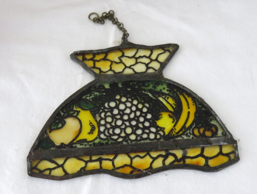 Two sun catchers, one with amethyst stained glass, the other in the form of a hanging light shade.