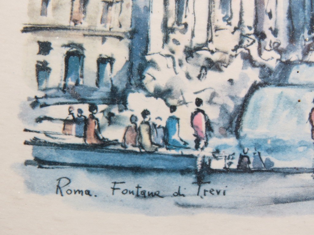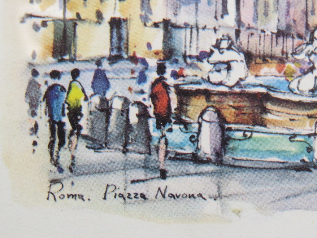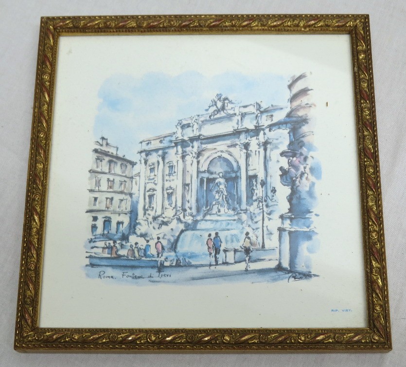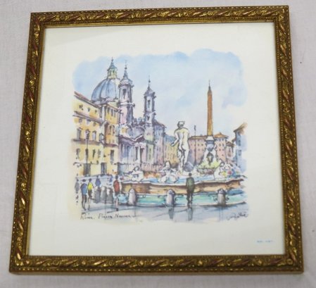Two Italian framed prints of famous Rome landmarks including the Piazza Navona and the Fontane De Trevi, each 6" x 6" in size.