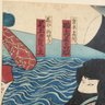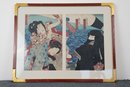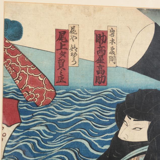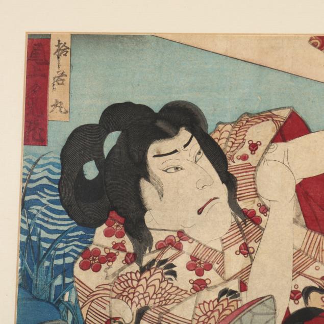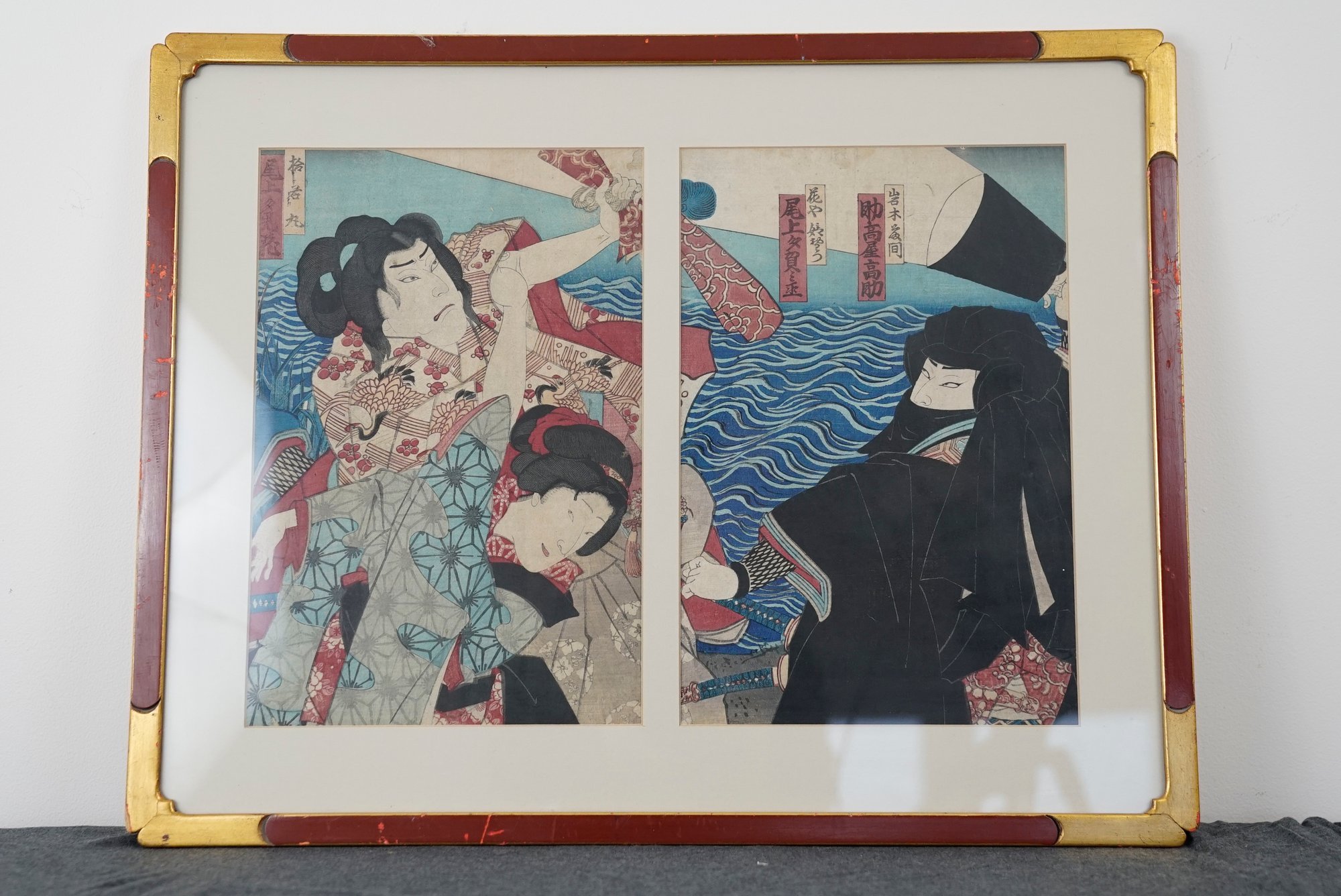 Edo period (1615-1868), ink and colors on paper, three figures with dramatic faces set over two sheets, probably Kabuki actors, no artist's signature nor seal, probably on third print of this triptych together with title, in art deco style gilt and red frame, not examined outside of the frame.