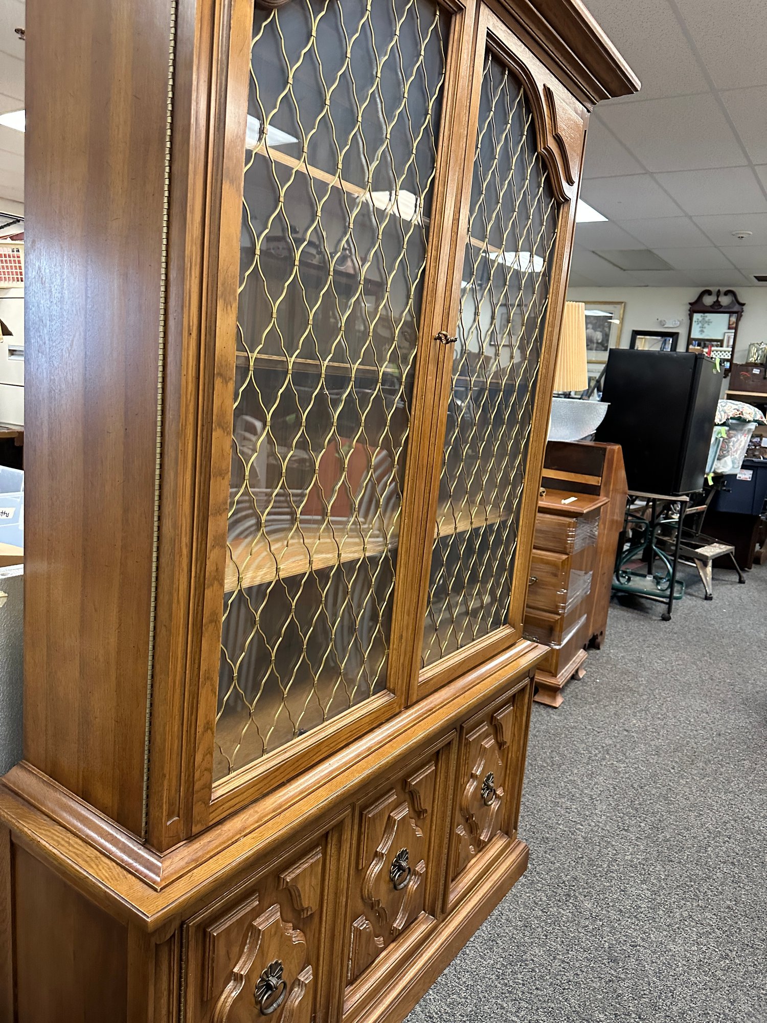 3 doors on bottom with felt drawers in one 3 shelves on top two doors on top with glass doors 49 wide bottom 25 high total height 78
