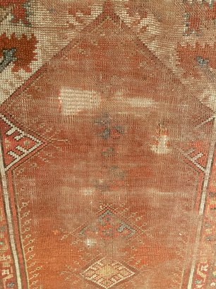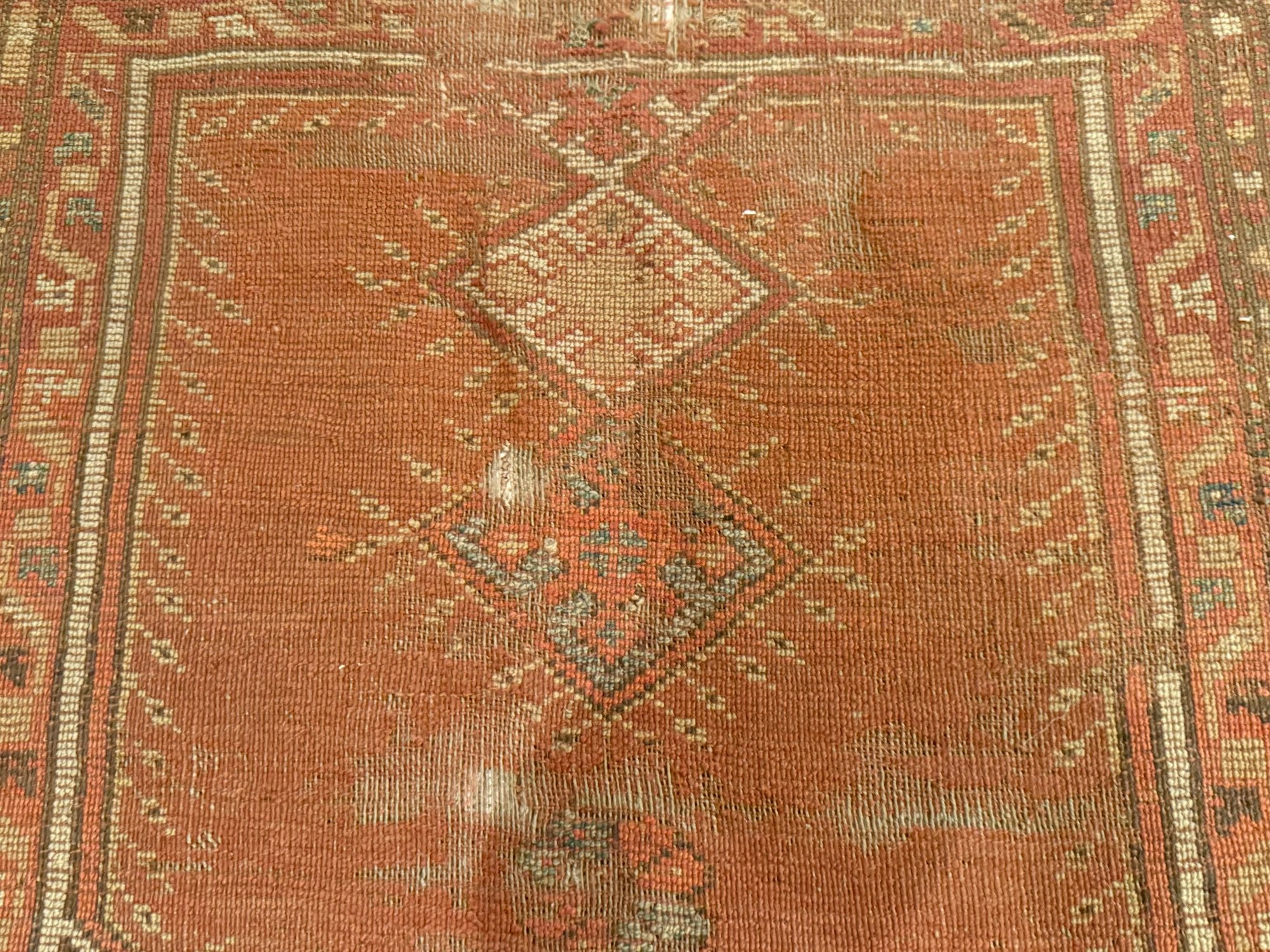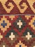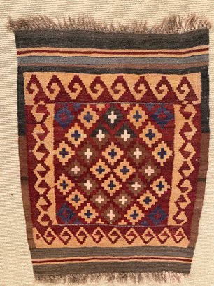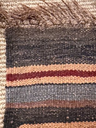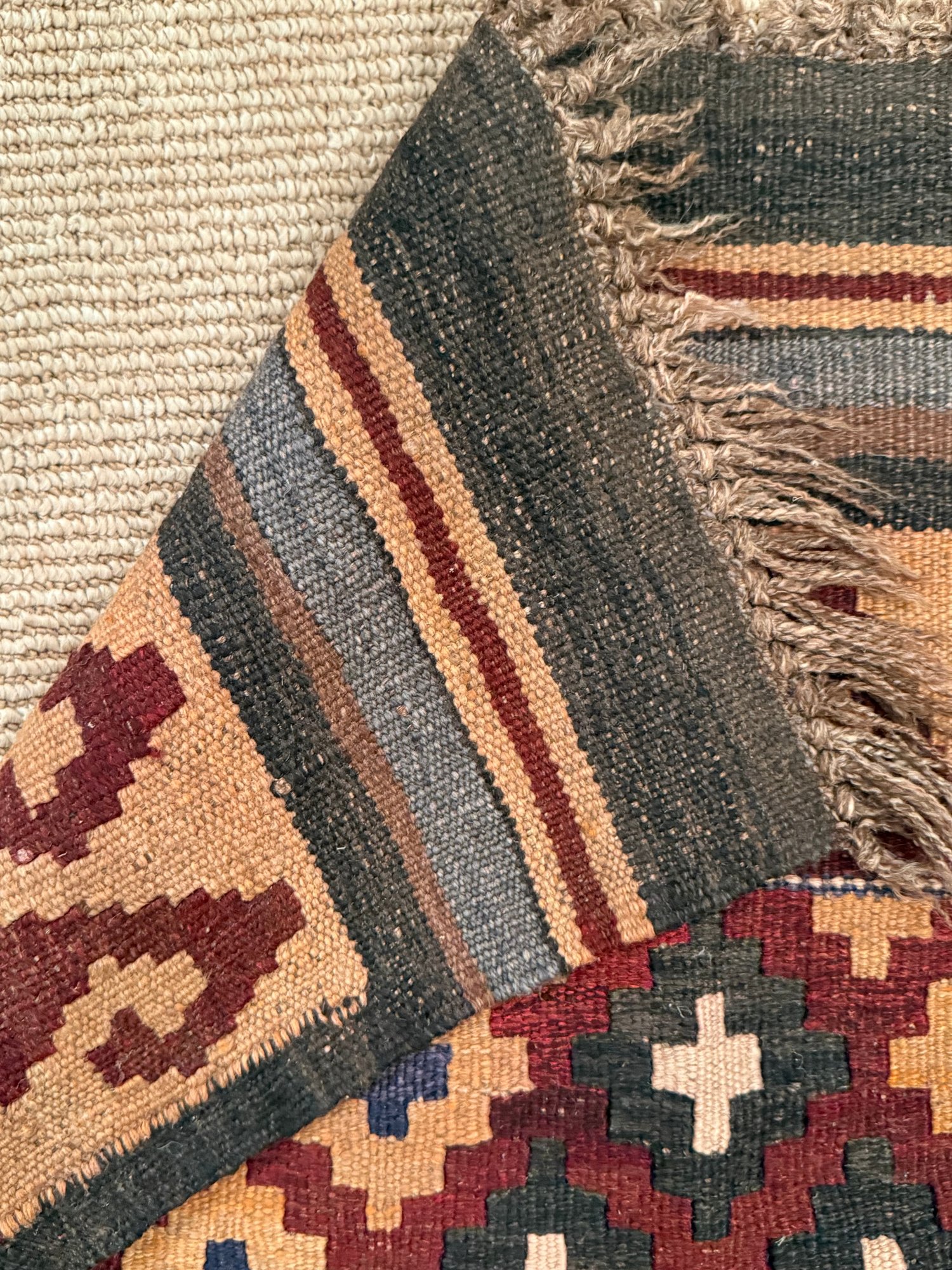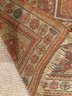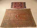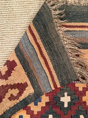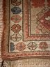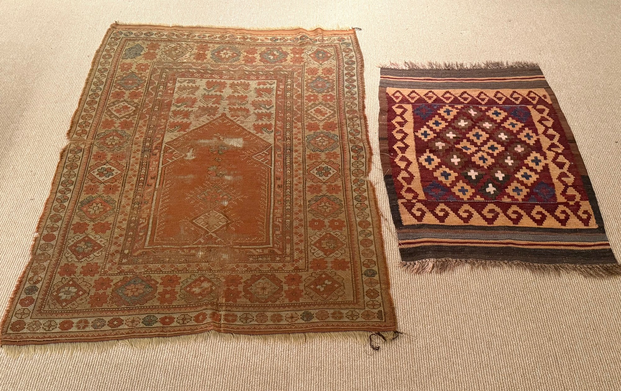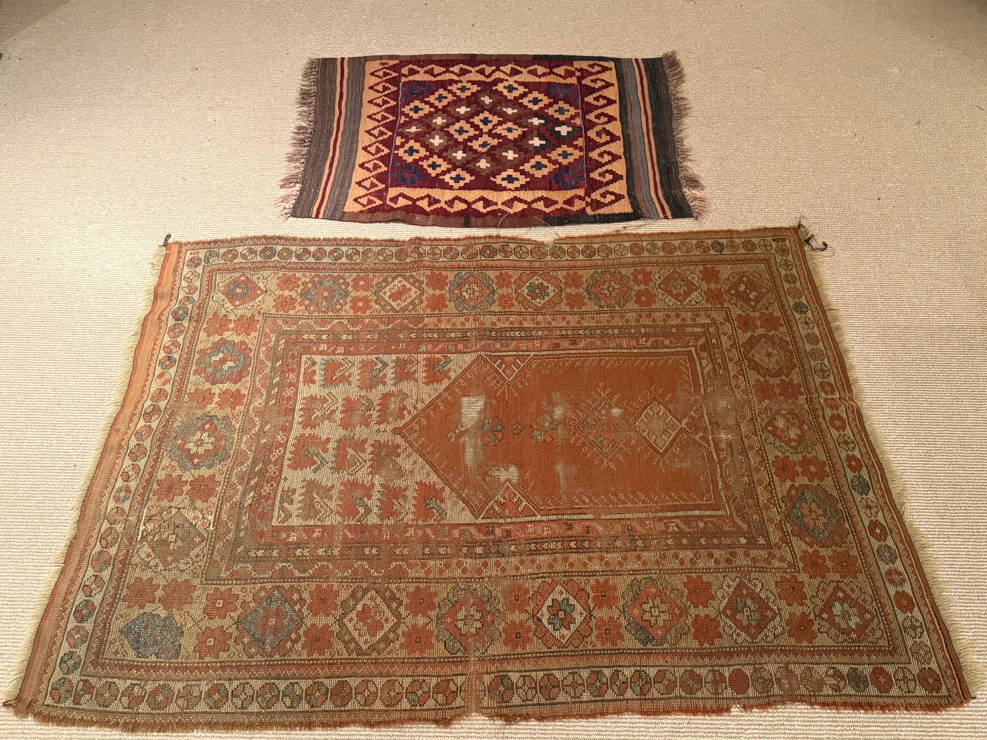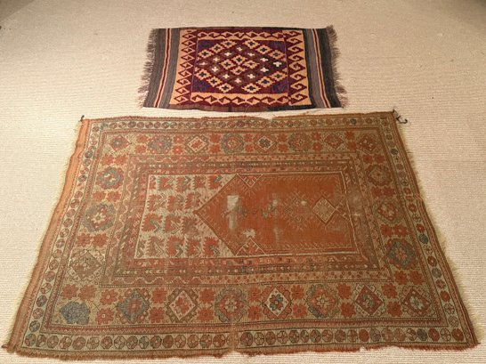 Two vintage kilim carpets. The larger carpet in beautiful muted colors has age wear and center tears where threads are showing - still a gorgeous carpet that would work well layered. The other is a small patterned carpet in shades of bright pink and browns.