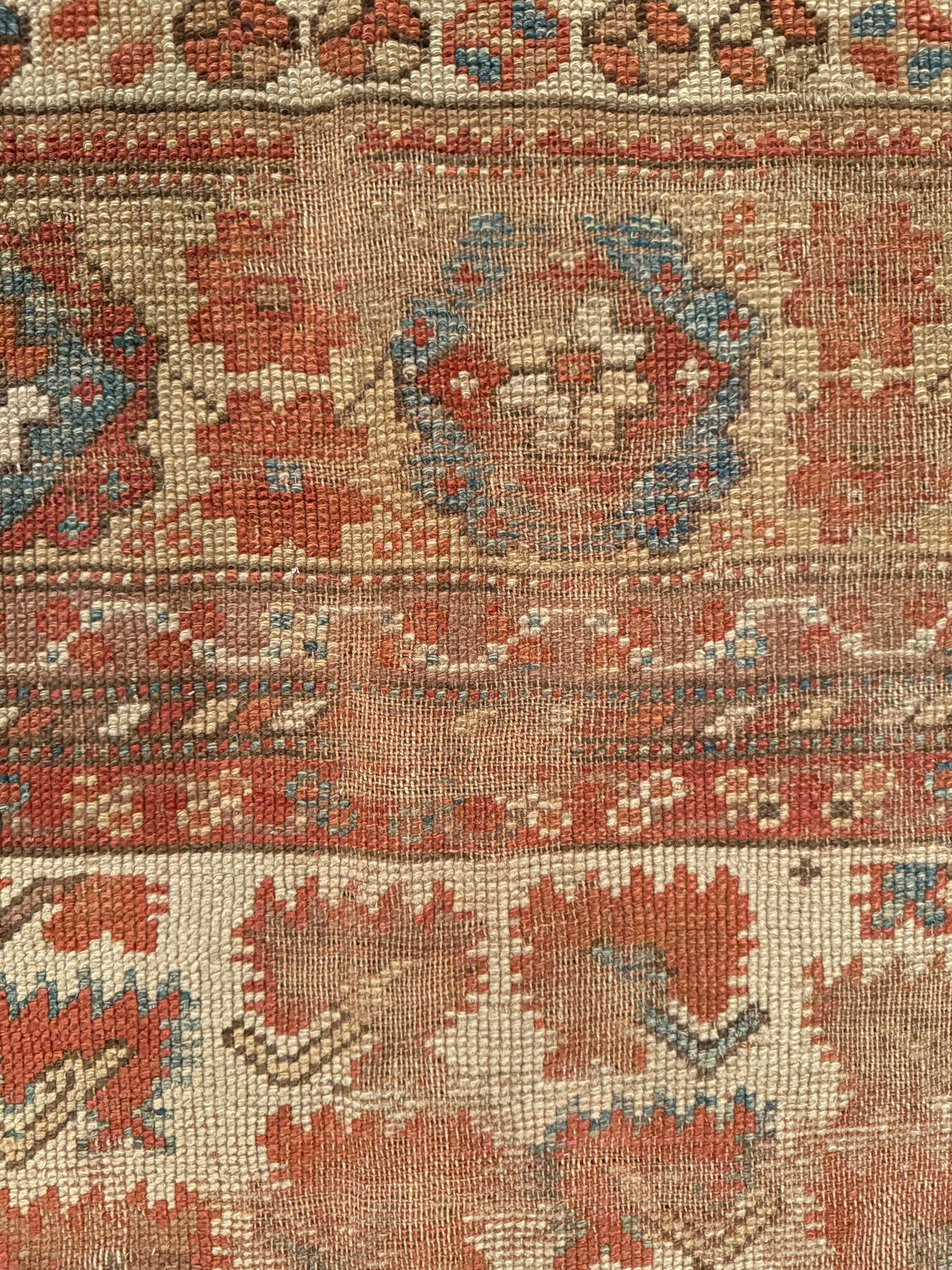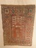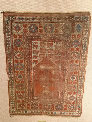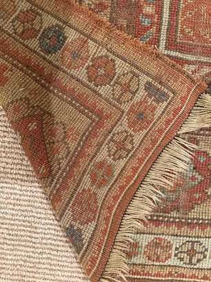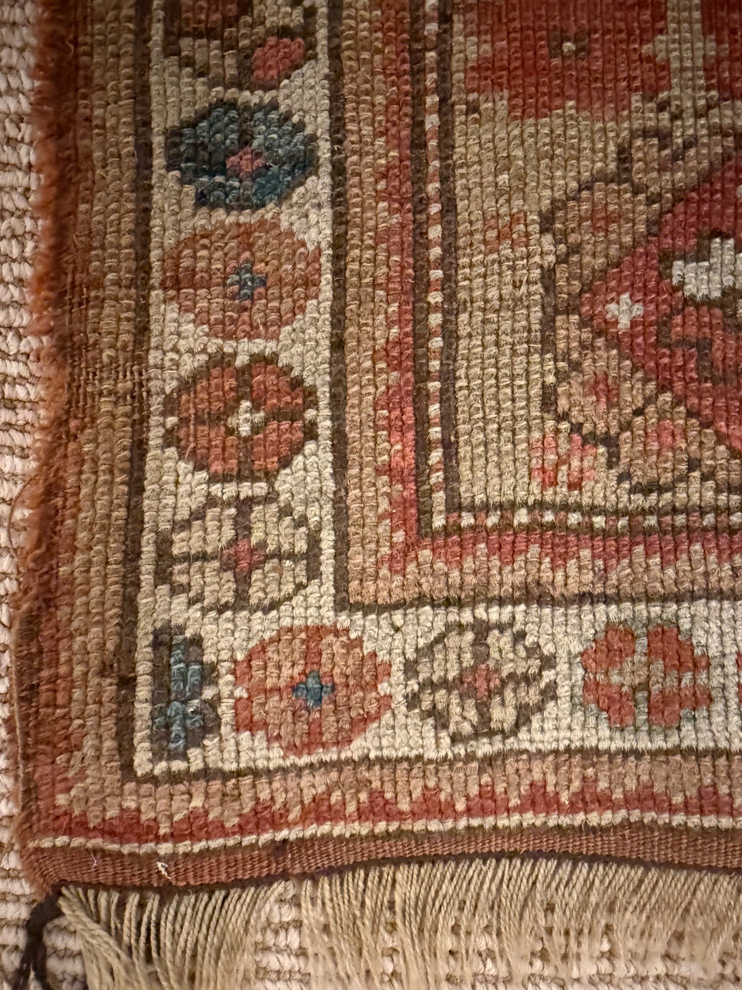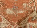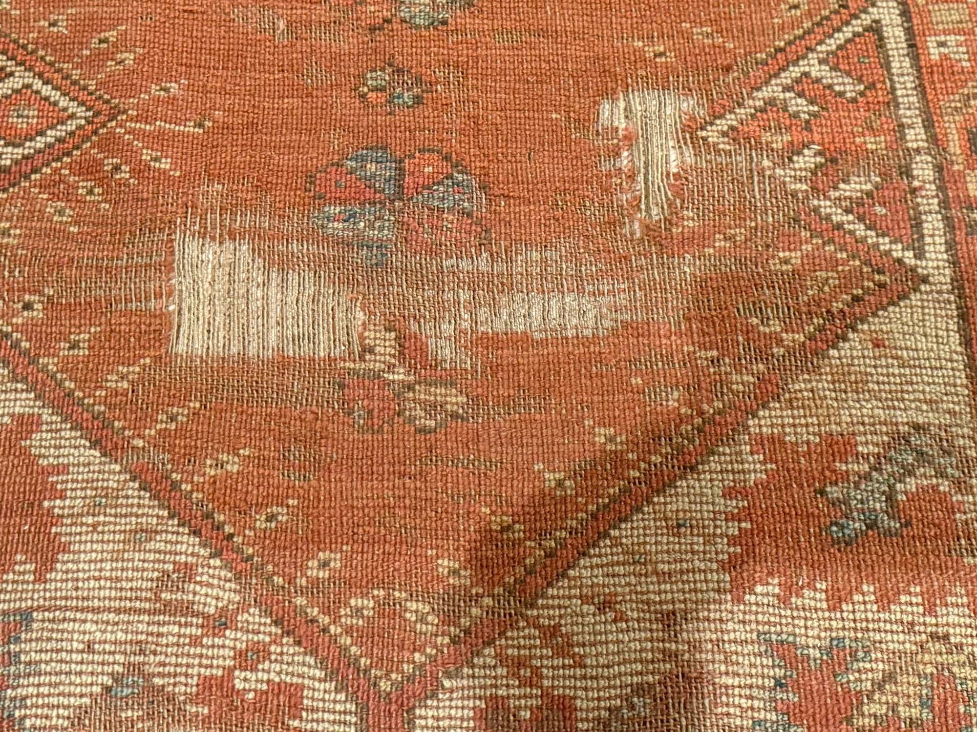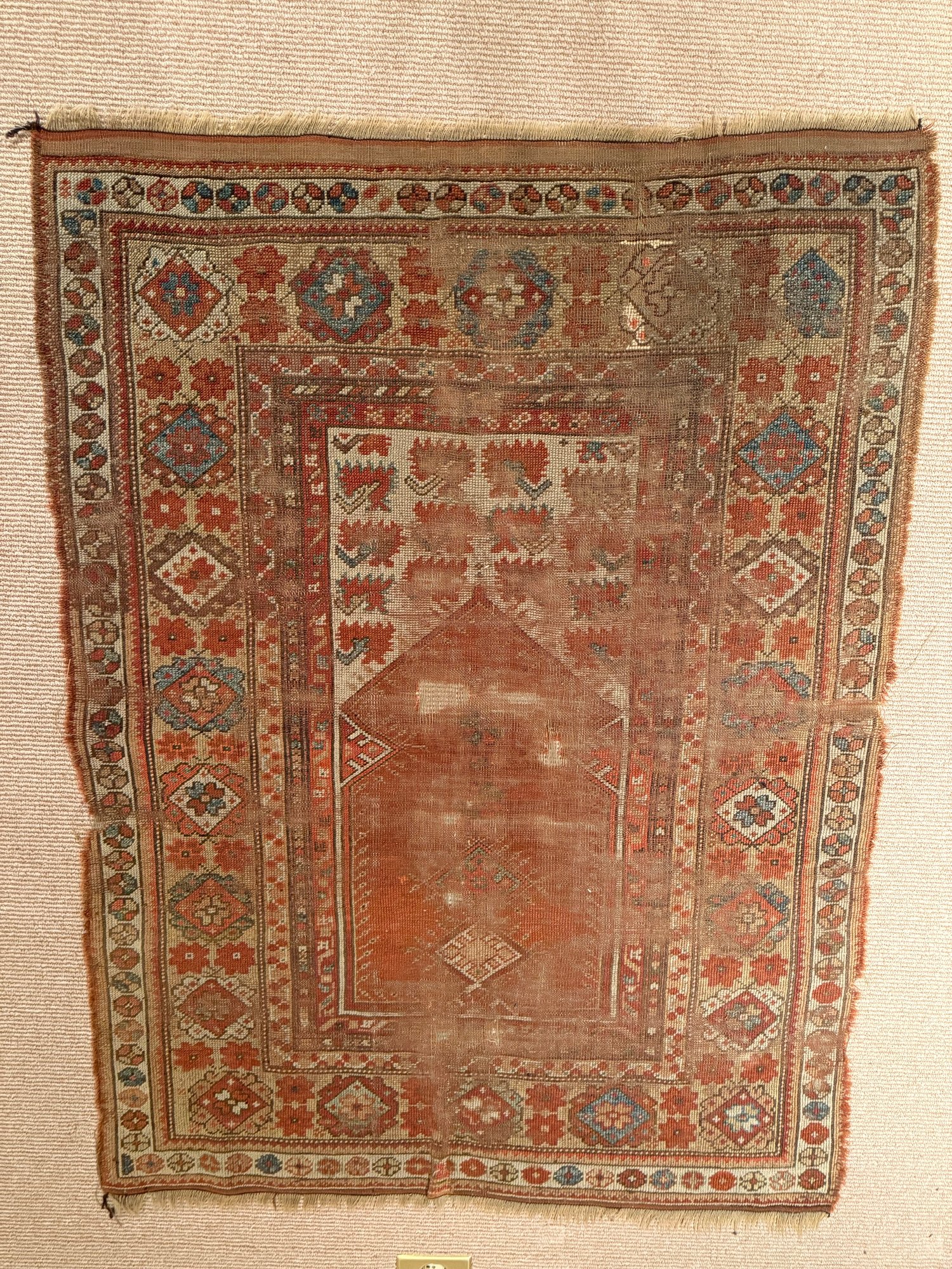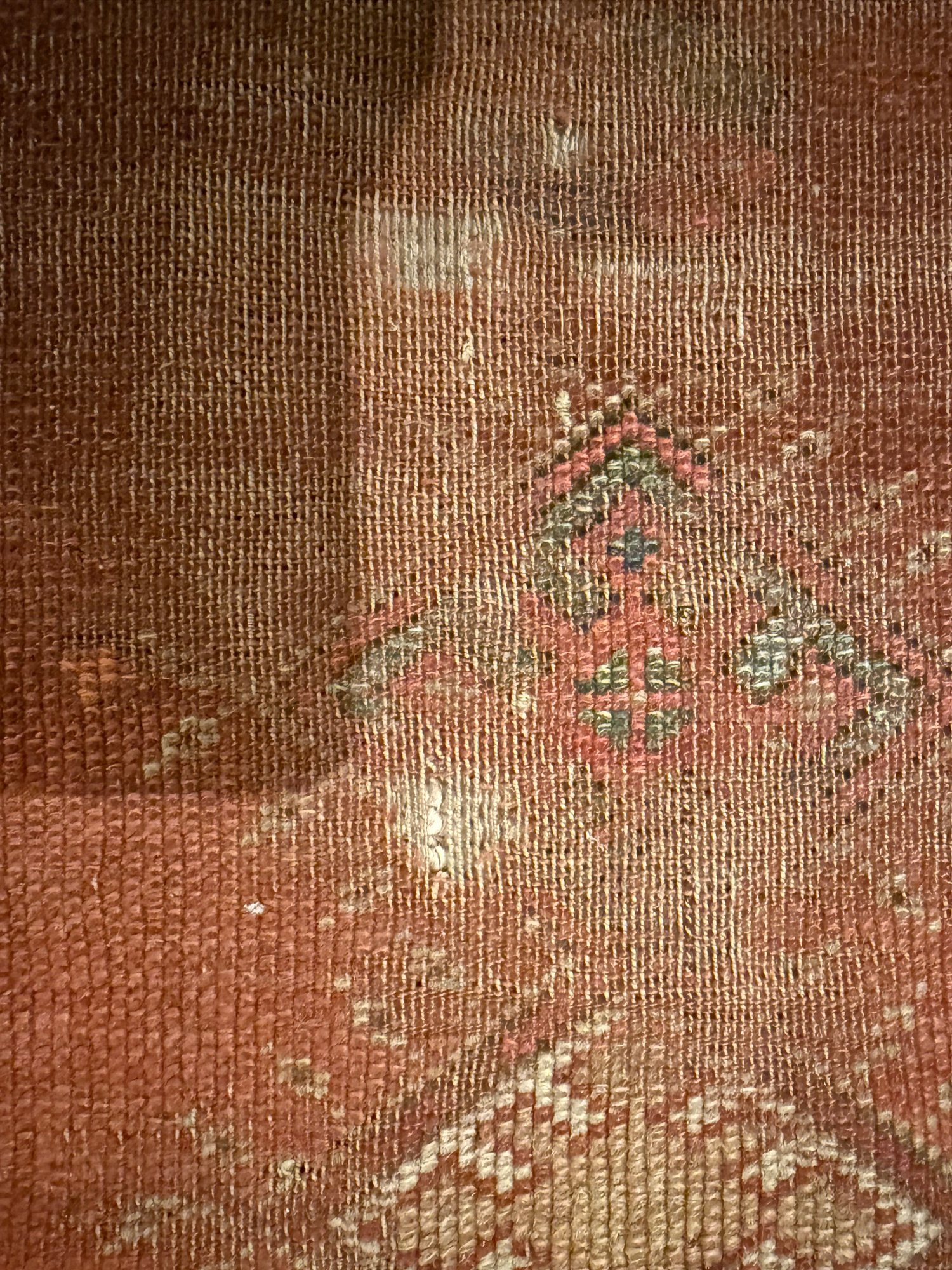 Two vintage kilim carpets. The larger carpet in beautiful muted colors has age wear and center tears where threads are showing - still a gorgeous carpet that would work well layered. The other is a small patterned carpet in shades of bright pink and browns.