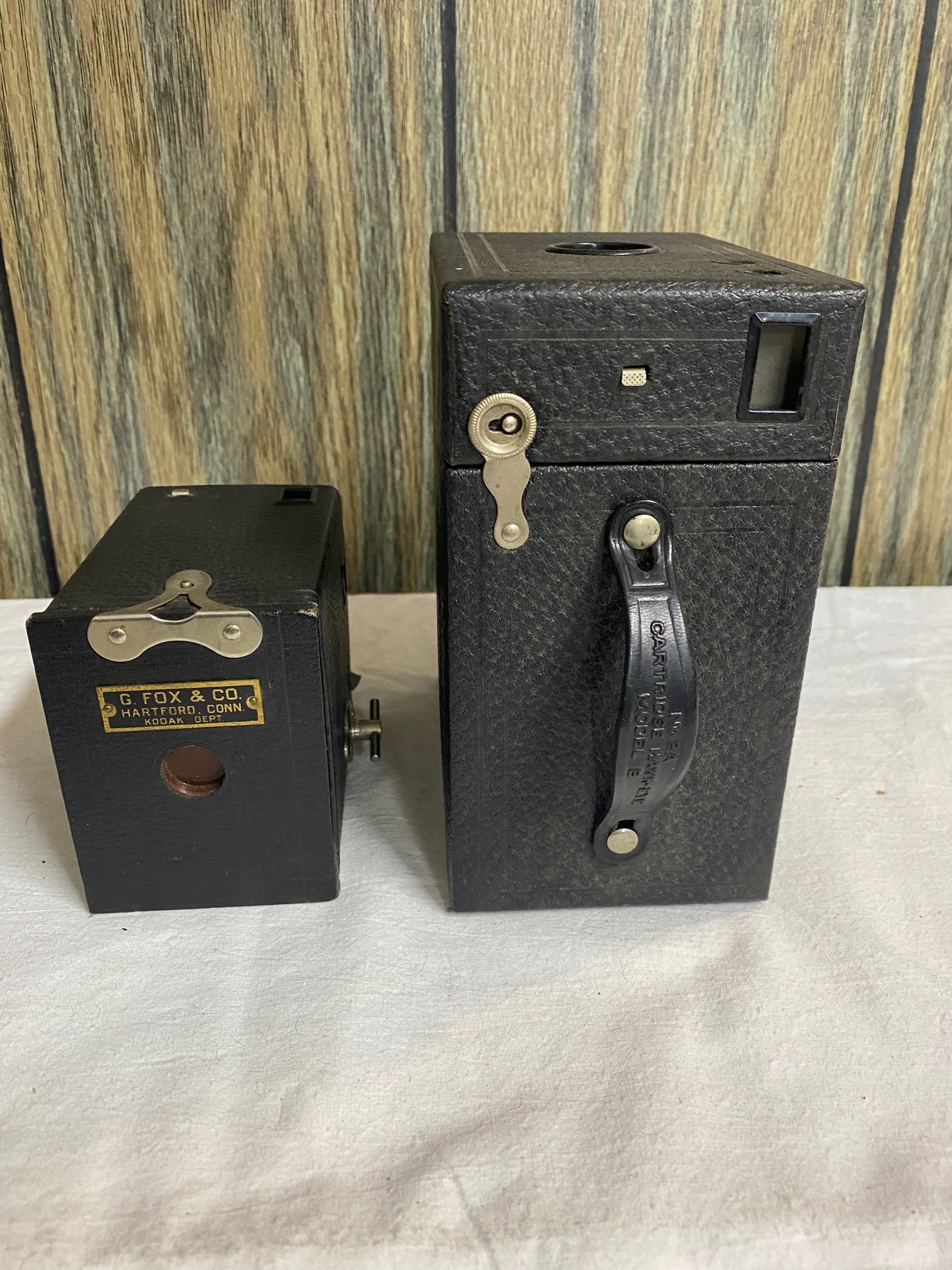 Eastman Kodak No. 2A Cartridge Hawk-eye Model B Camera and camera made expressly for G. Fox and Co. Untested.
