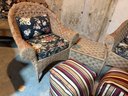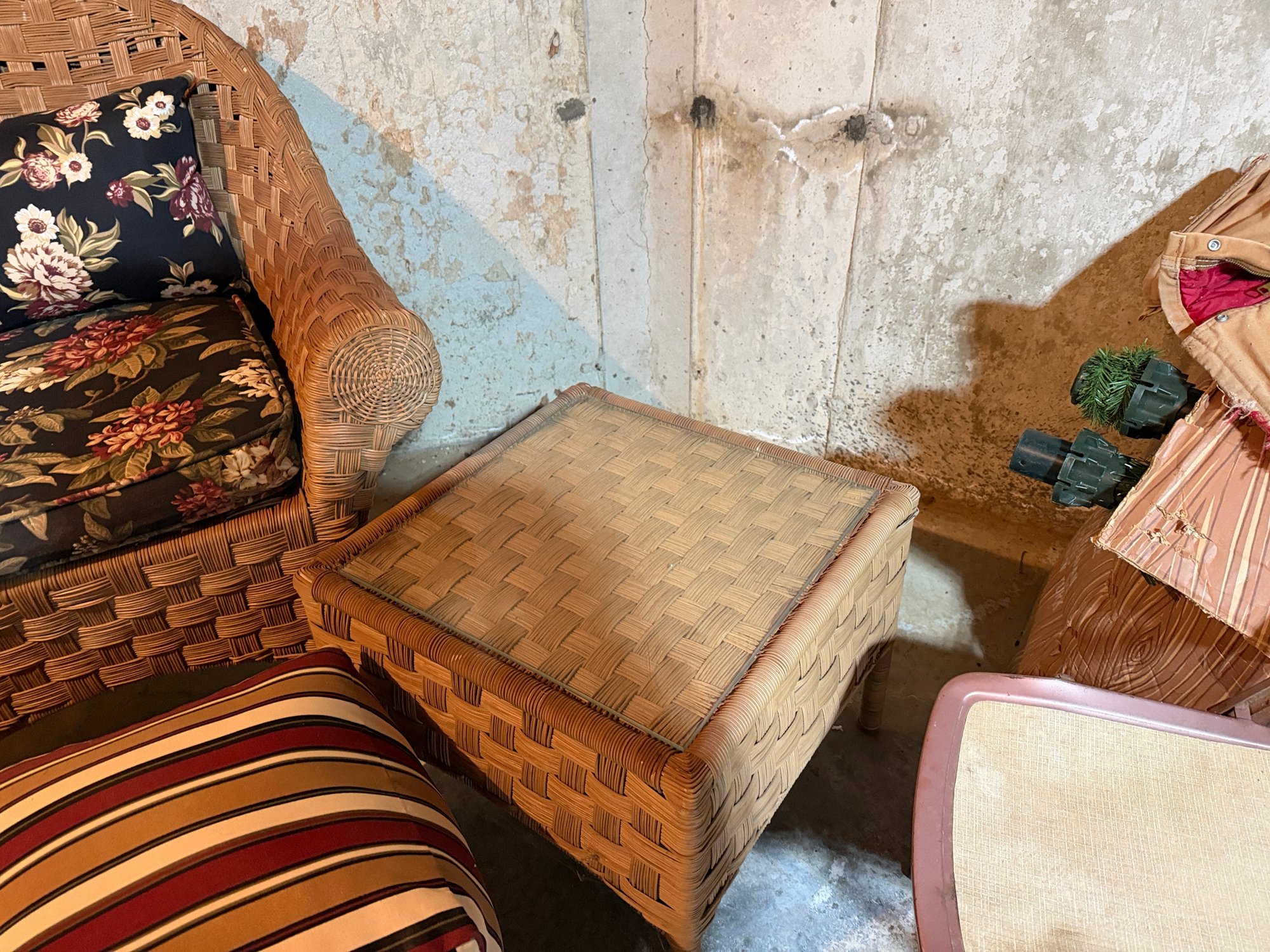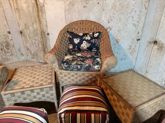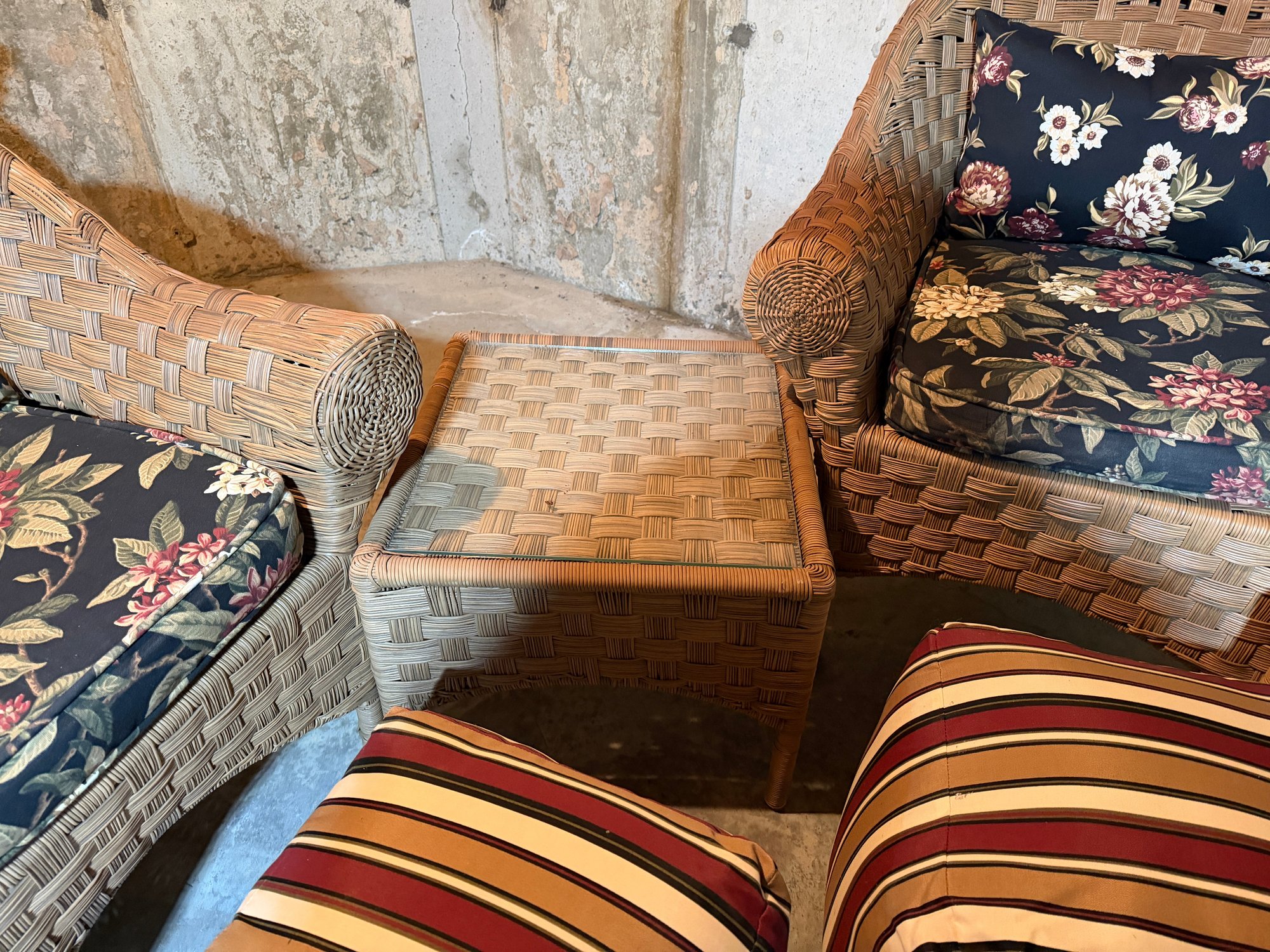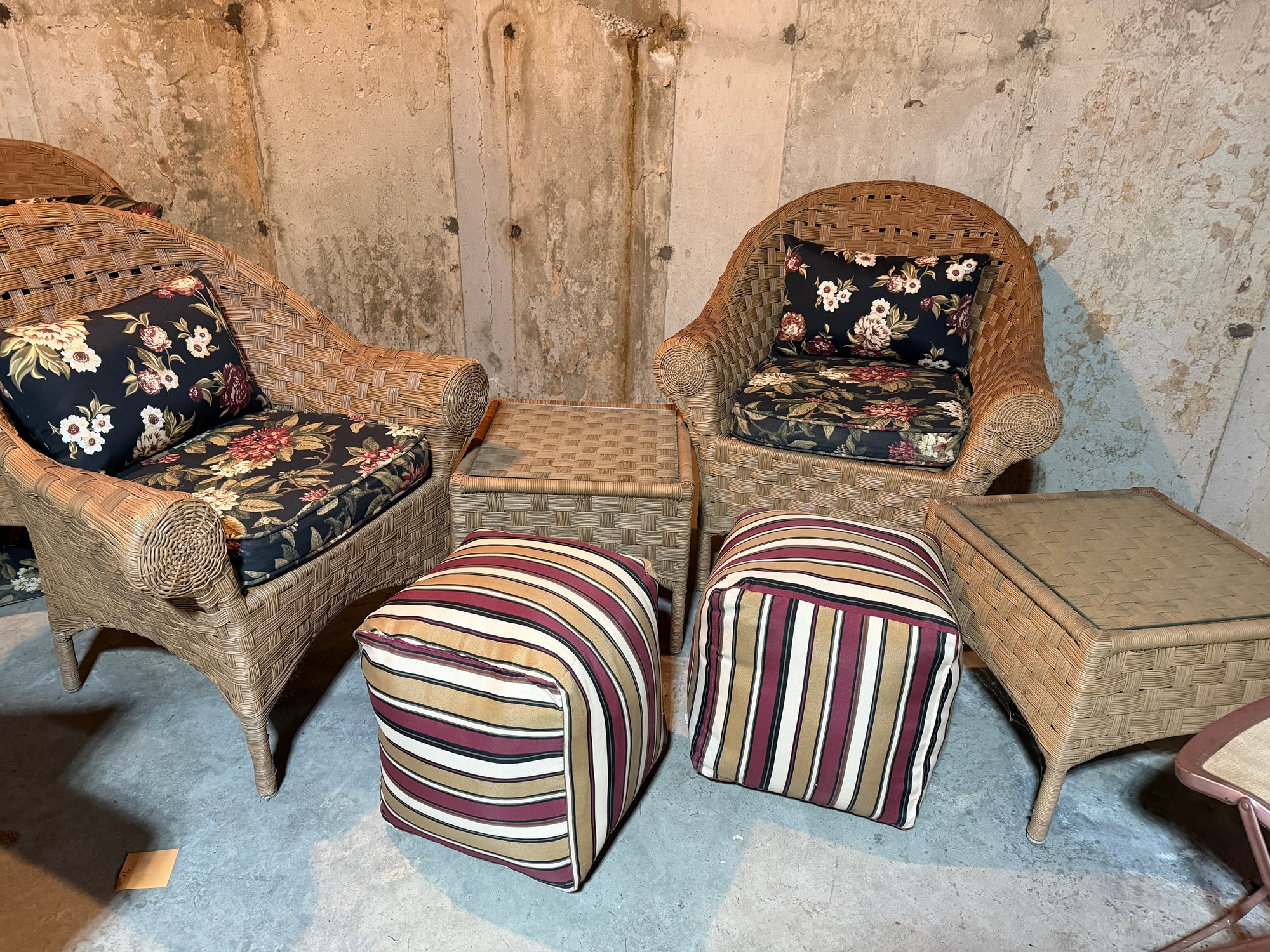 These are all in great condition. The cushions are like new and are from Plow & Hearth. This is part of a large set that we have separated into three lots. Thee are beautiful. Both tables have glass tops Chairs 33x 33 x 36
