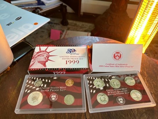 The U.S. Mint did not release a 7-coin silver proof set in 1999. The 1999 U.S. Mint Silver Proof Set contained 9 coins, including five State Quarters, a Kennedy half-dollar, a Roosevelt dime, a Jefferson nickel, and a Lincoln cent. The half-dollar, dime, and quarters were struck in 90% silver.