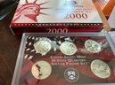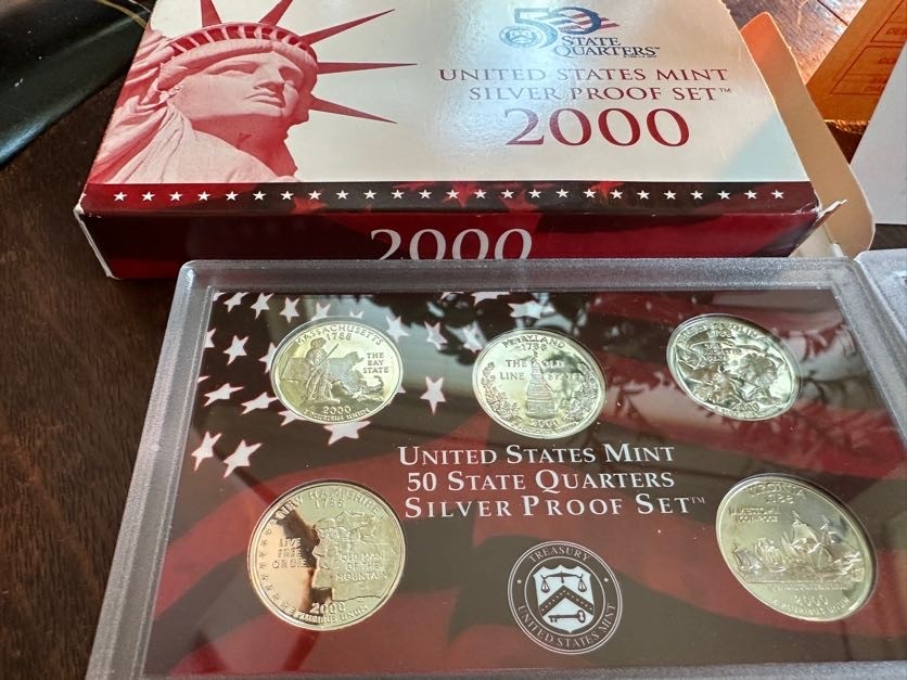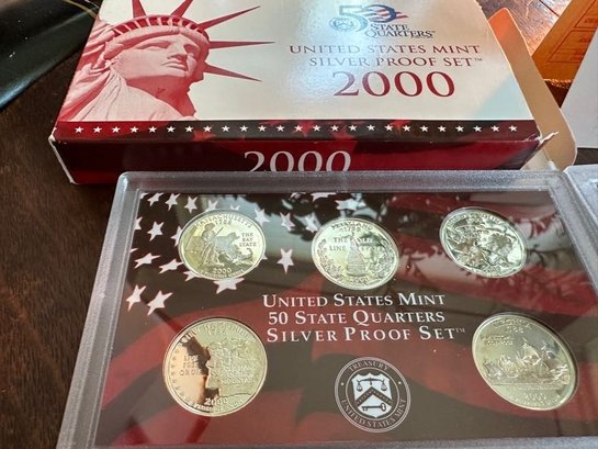 The 2000-S United States Mint Silver Proof Set contains 10 coins, including five Statehood Quarters (Massachusetts, Maryland, South Carolina, New Hampshire, and Virginia), a Sacagawea dollar, a Kennedy half dollar, a Roosevelt dime, a Jefferson nickel, and a Lincoln cent. All coins in the set are struck in proof condition with a mirror-like surface and are sealed in their original U.S. Mint packaging.