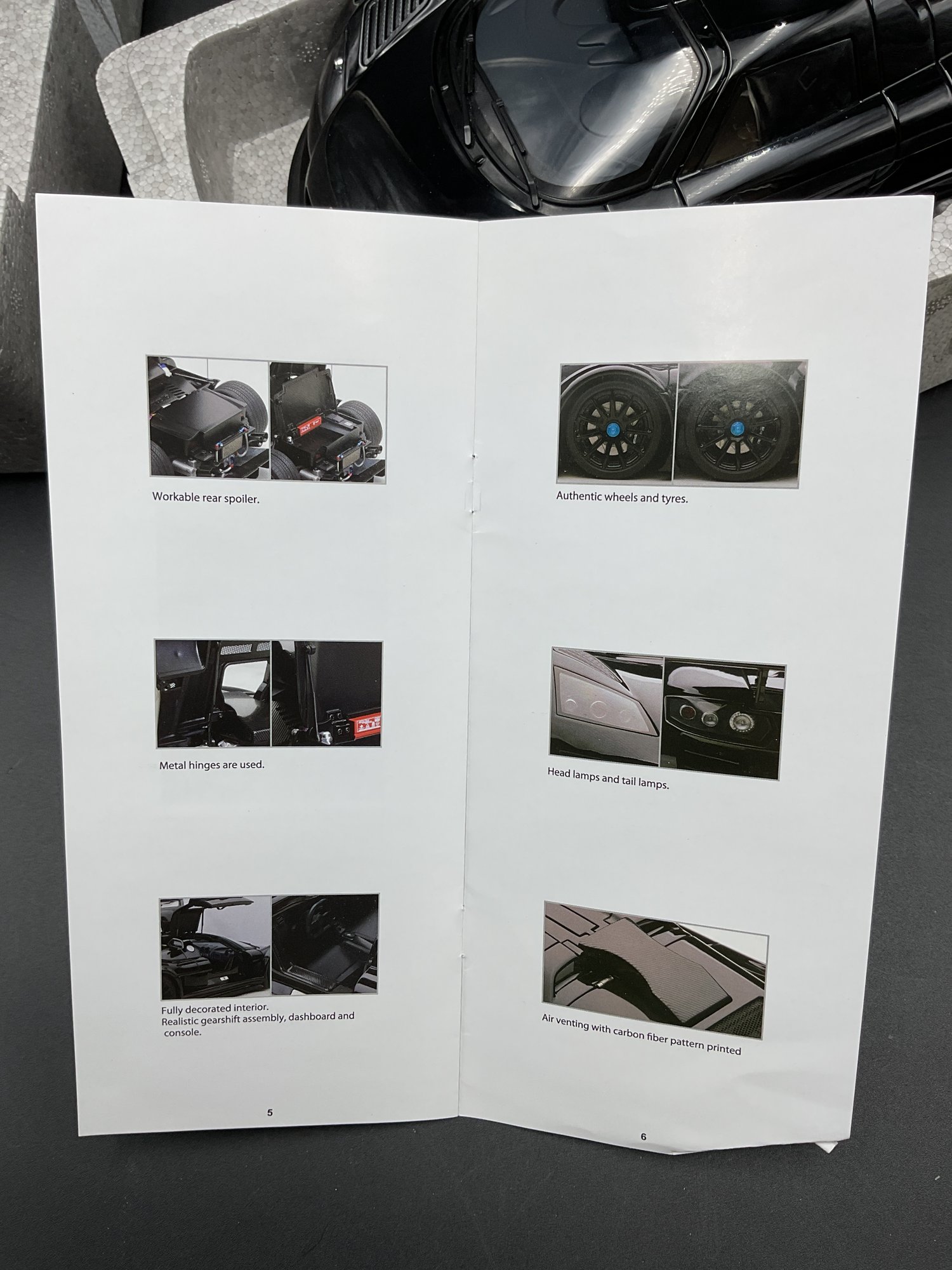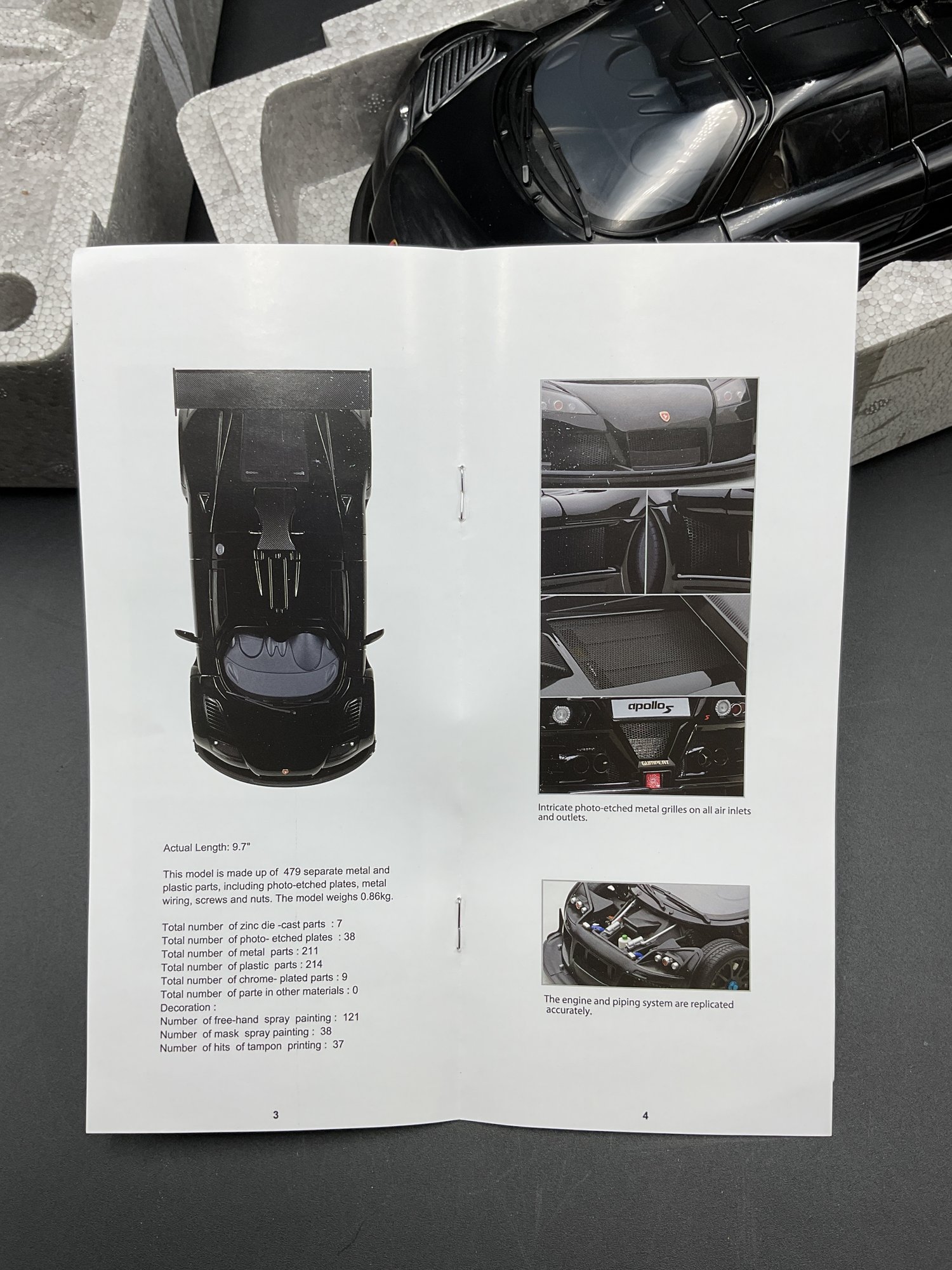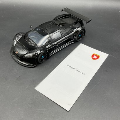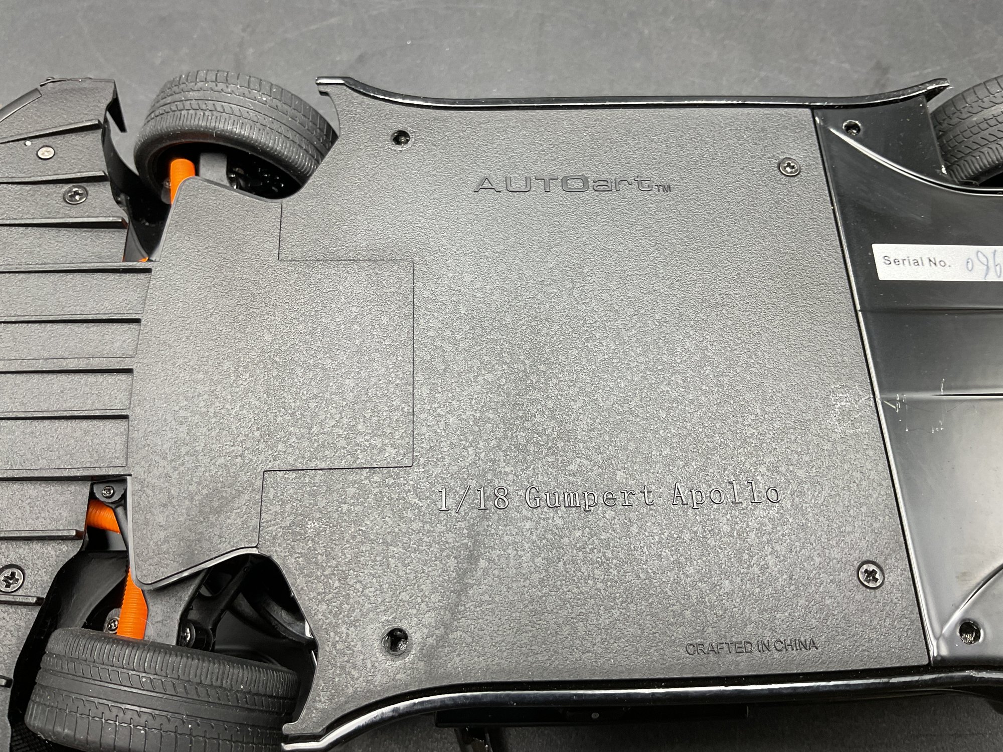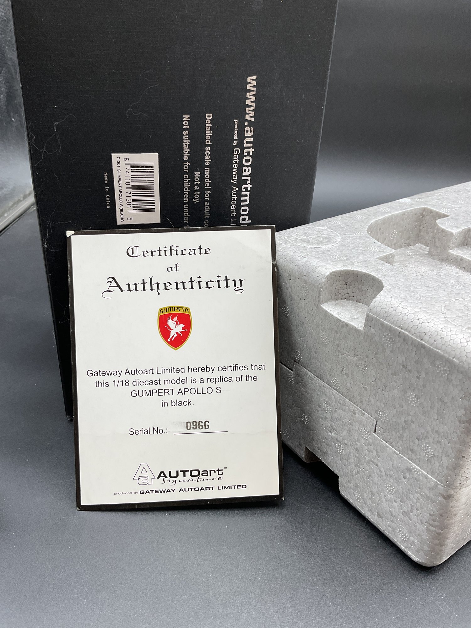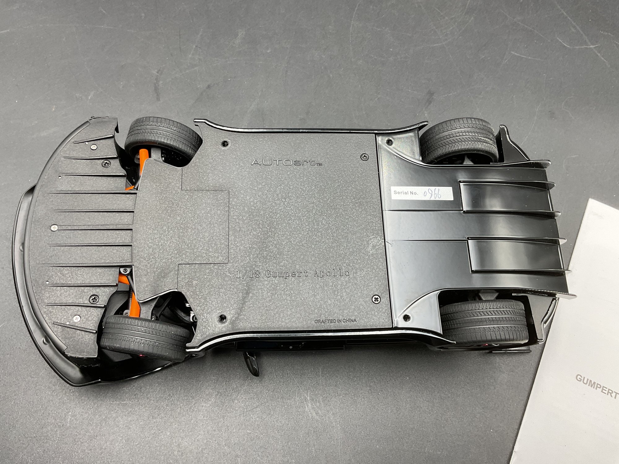 Limited edition (number 0966) Gumpert Apollo S model car, 1/18 scale, in original box and styrofoam insert with all paperwork. Hood, doors and rear hatch open (we did not know how to open the rear and didn't want to force it but info sheet shows it opens). Appears to be in excellent condition and includes Gateway AutoArt Certificate of Authenticity.