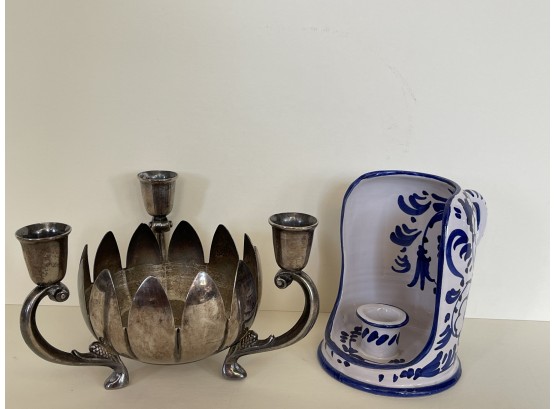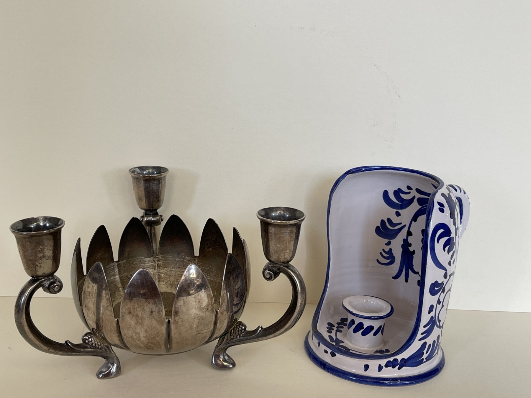 Two pretty candle holders that are a great addition to your decor. The blue & white design holder is made in Italy. The silver plated holder has a fun intricate design to it and is also made in Italy.