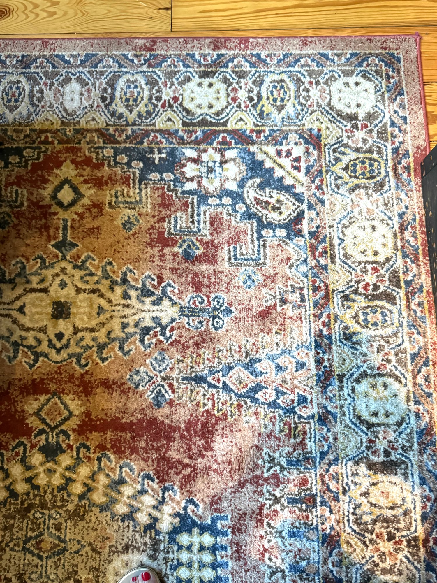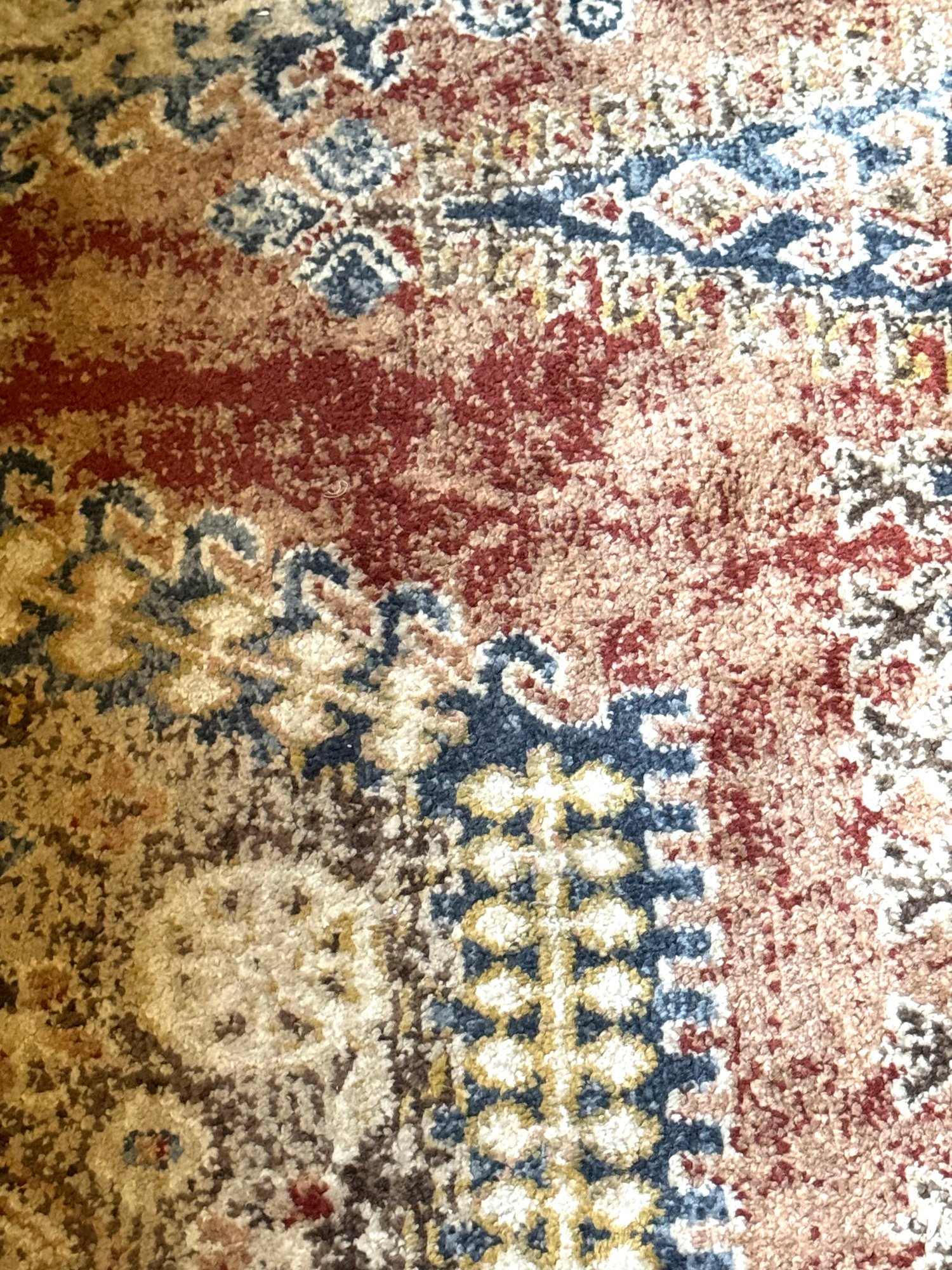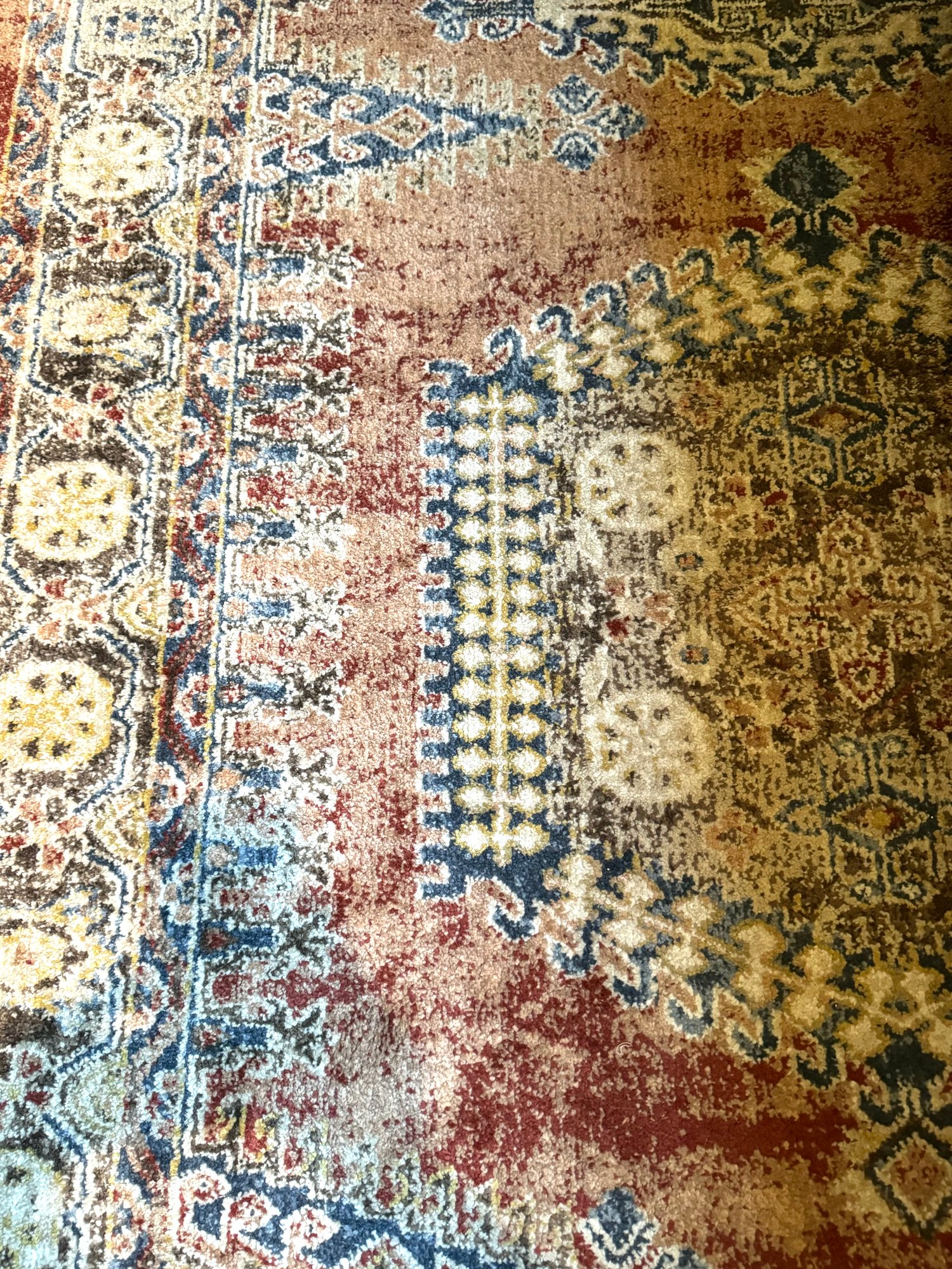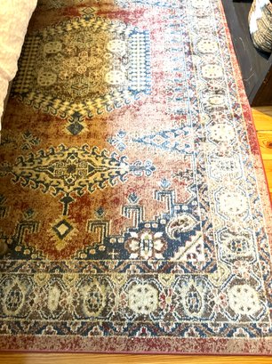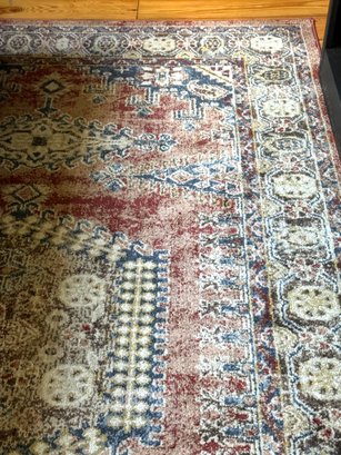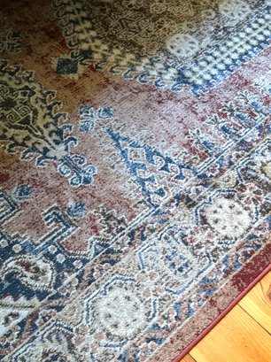Flat weave carpet in subtle dusty jewel tones of cranberry, blues and beiges.