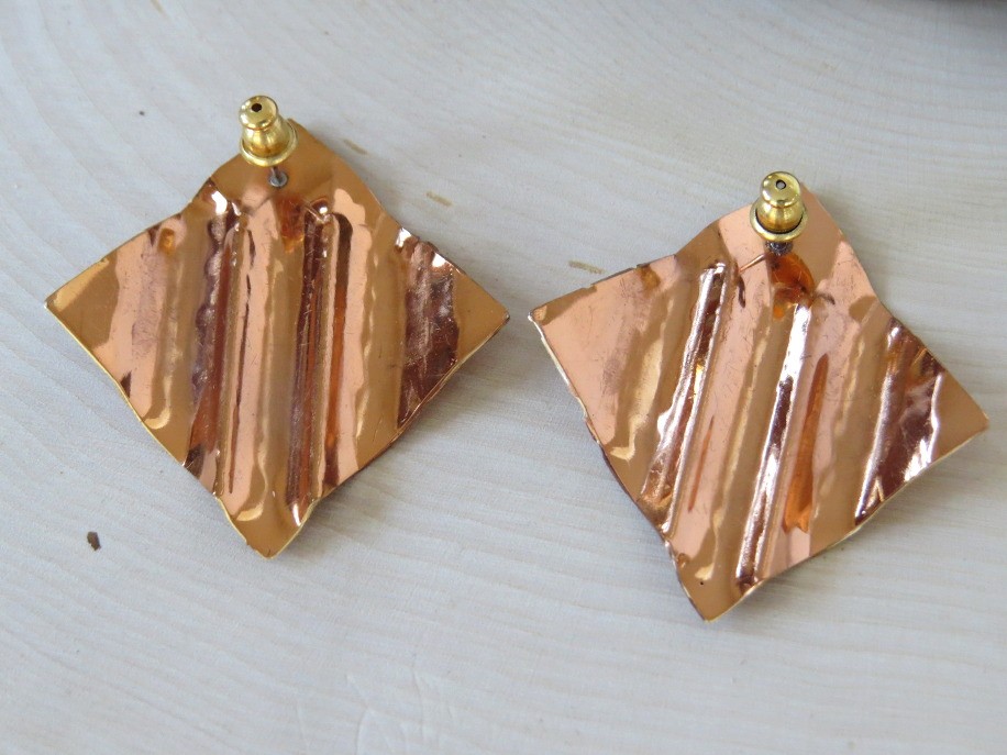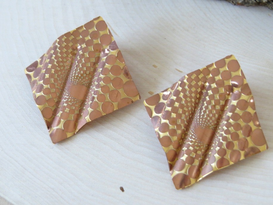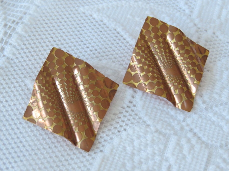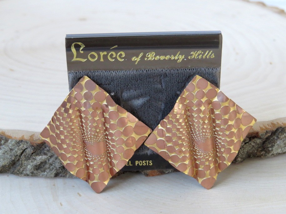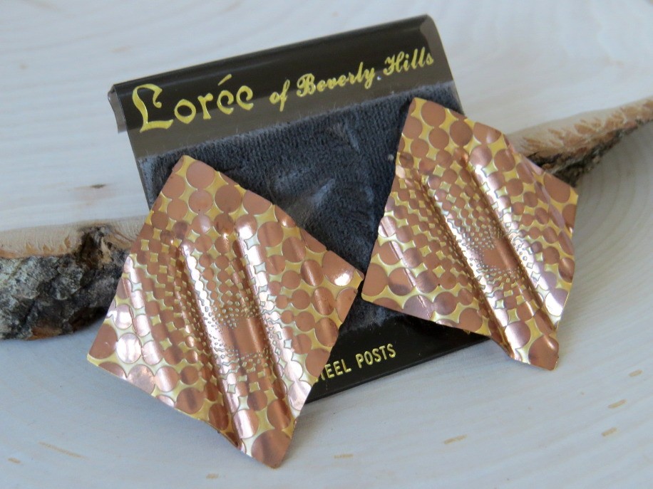 A pair of vintage Loree of Beverly Hills surgical steel post pierced earrings in a unique geometric design featuring a two tone copper brass finish on metal. Earrings measure 1 1/2" long X 1 1/2" wide and have a ripped texture for added depth.