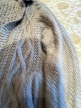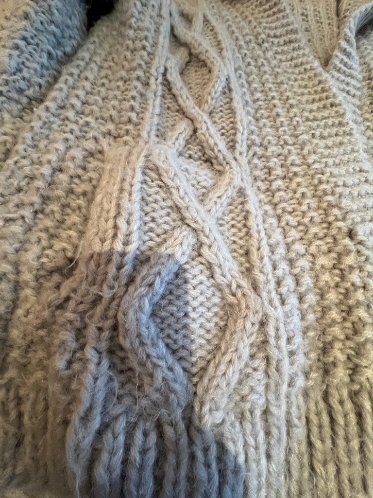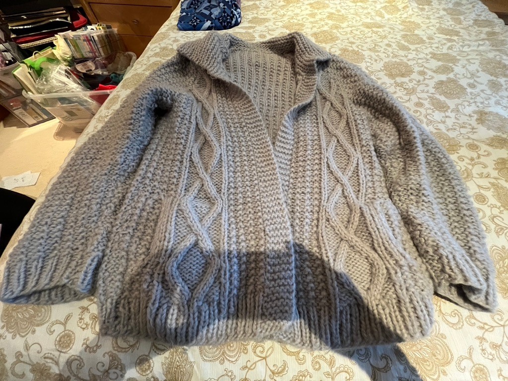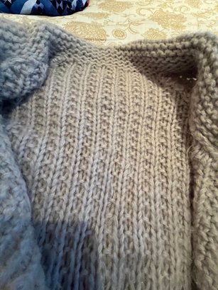 Unisex handmade wool cable knit sweater, soft dove grey, very warm, very cozy, ladies size l-xl, very soft.