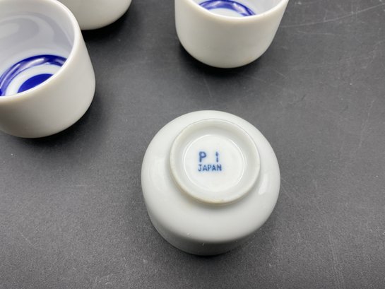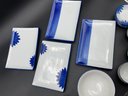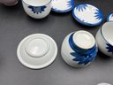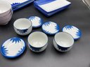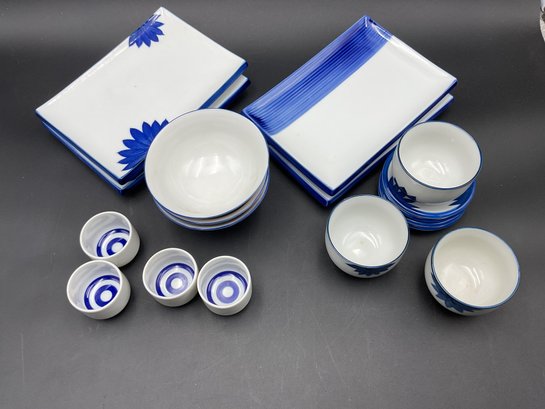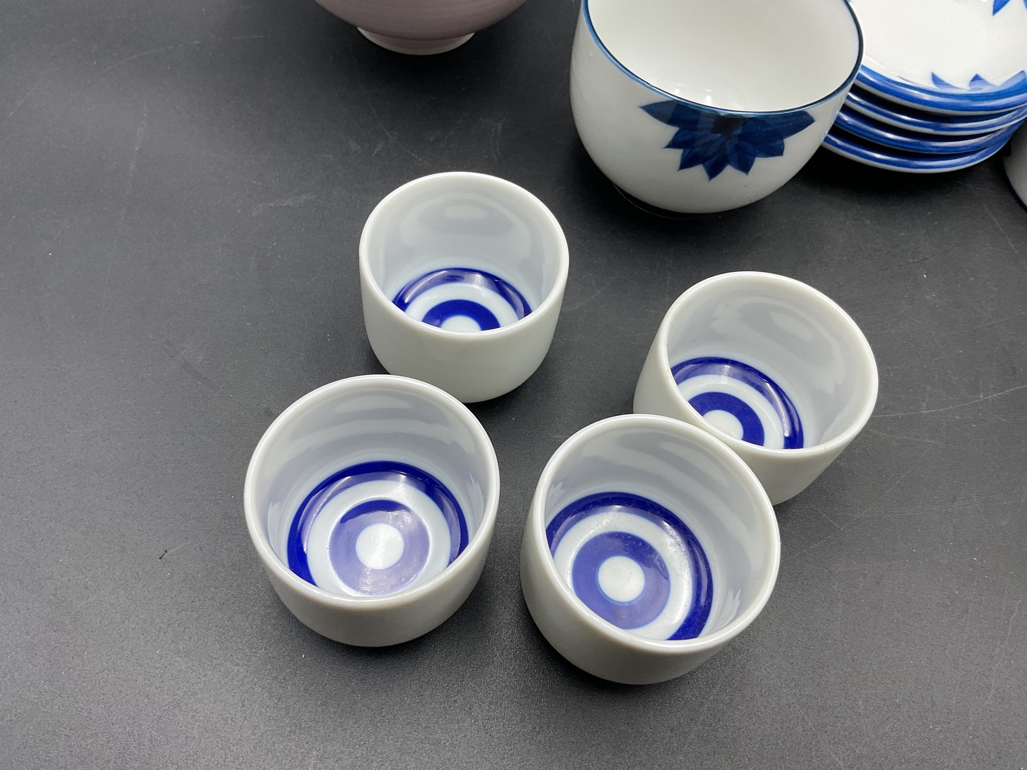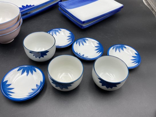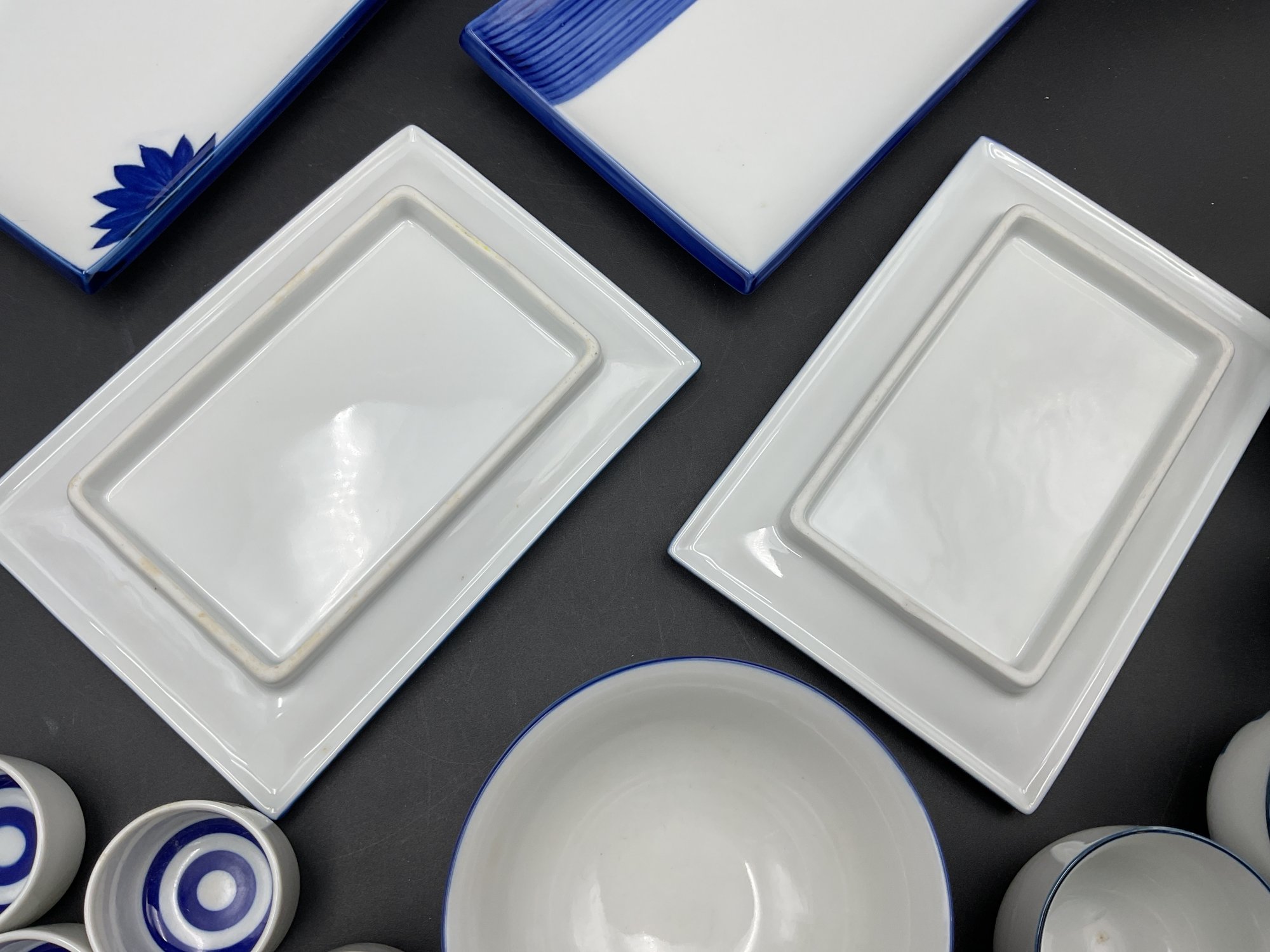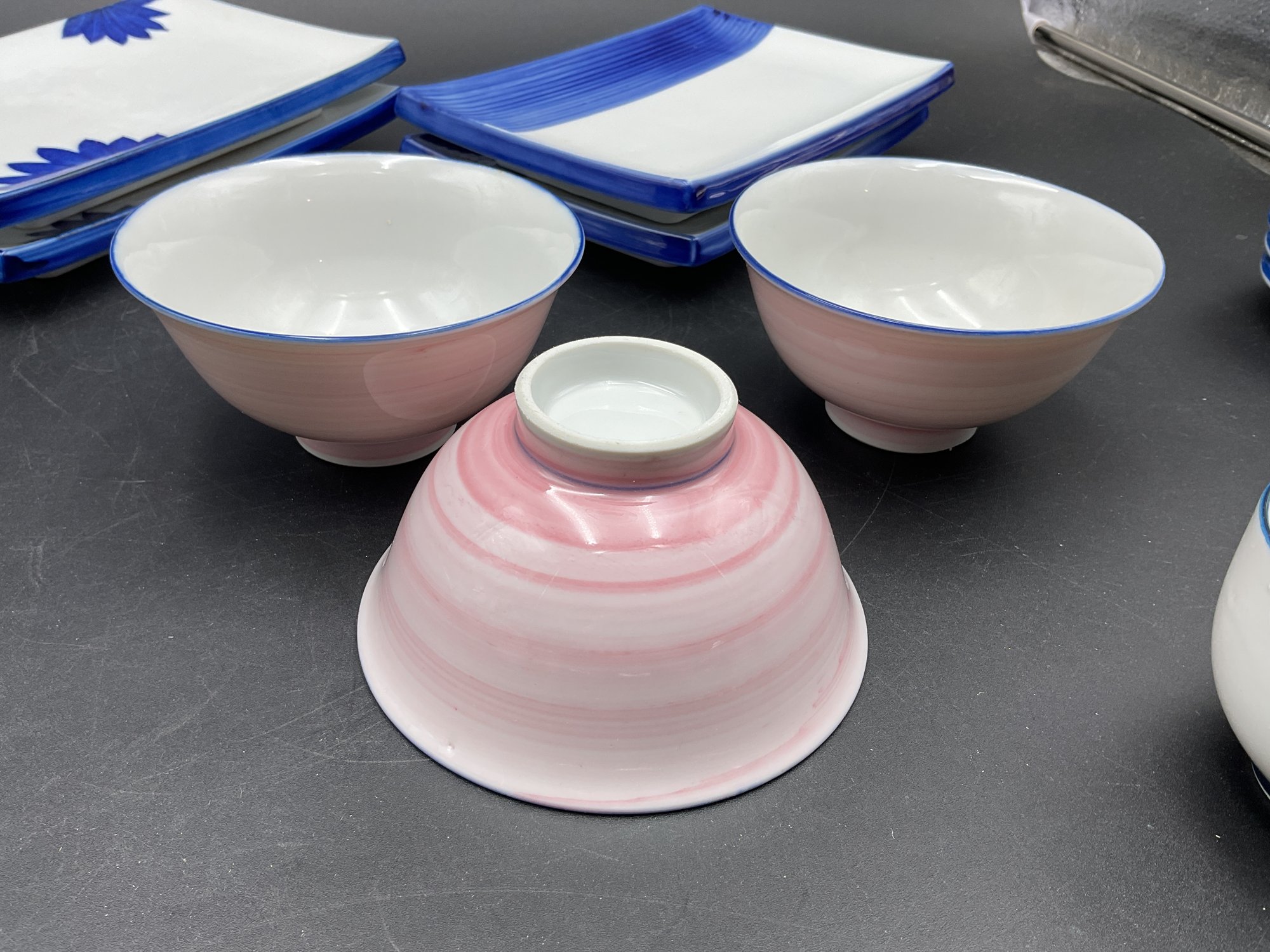 Collection of porcelain dishes with Japanese styling. All in blue and white palette (except for bowls with pink wash glaze) and in excellent condition. Includes 4 rectangular plates, 3 teacups with matching saucers, 3 bowls, and 4 small sake cups. See photos for patterns and details.