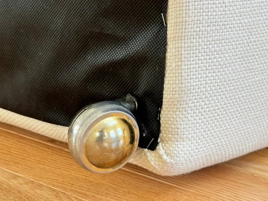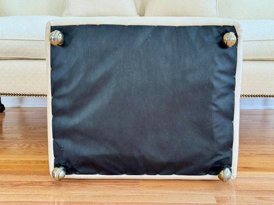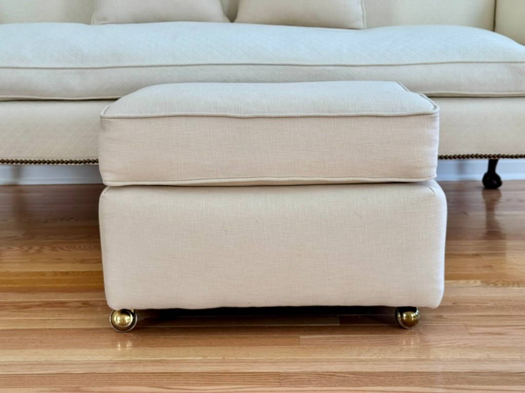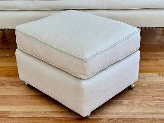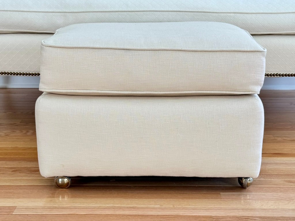 A classic, well-proportioned upholstered ottoman featuring cream textured fabric and brass-tone casters. The two matching throw pillows coordinate perfectly in tone and fabric, offering a cohesive look for traditional or transitional interiors.