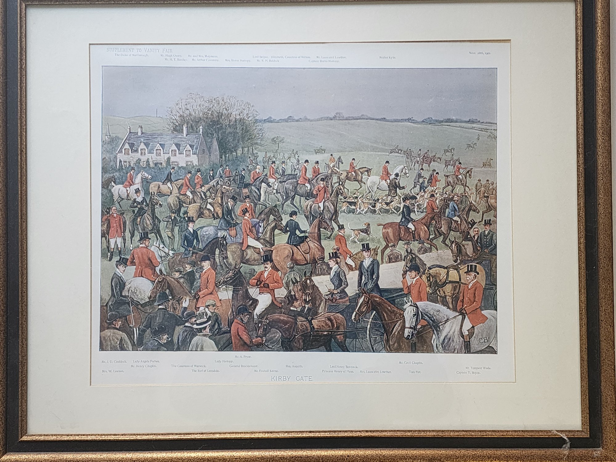 A lively and richly detailed Vanity Fair chromolithograph titled Fox Hunting – Quorn Hunt, published as a Supplement to Vanity Fair in November 1901 and drawn by the celebrated sporting artist Cuthbert Bradley. This large-format composition captures the celebrated Quorn Hunt assembled at Kirby Gate, presenting an animated panorama of Edwardian hunting society at the height of its cultural prestige.